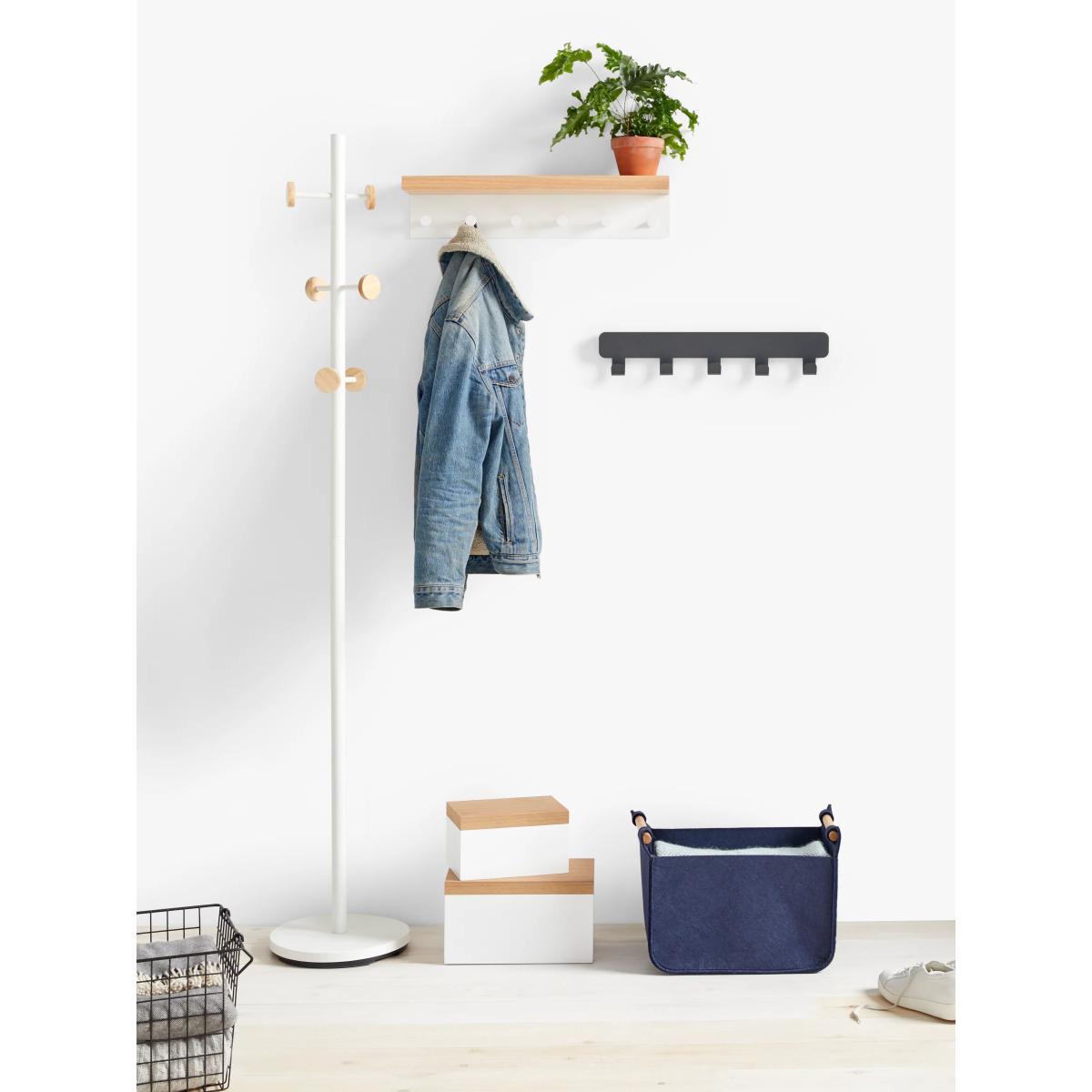 An all-in-one hallway storage solution which combines a rubberwood shelf and metal frame fitted with 6 hanging racks.