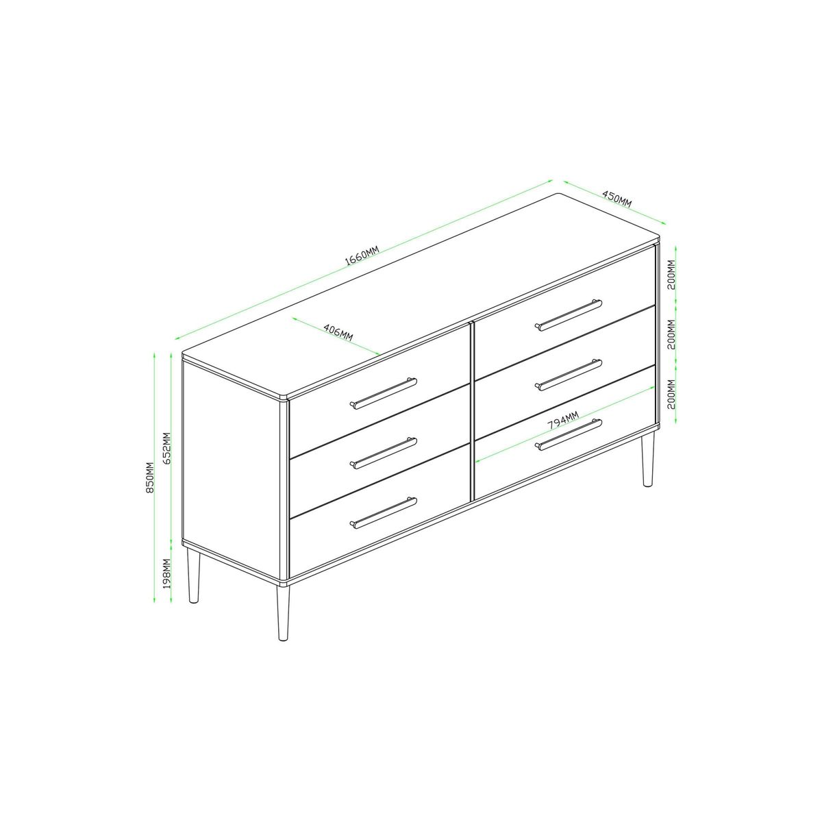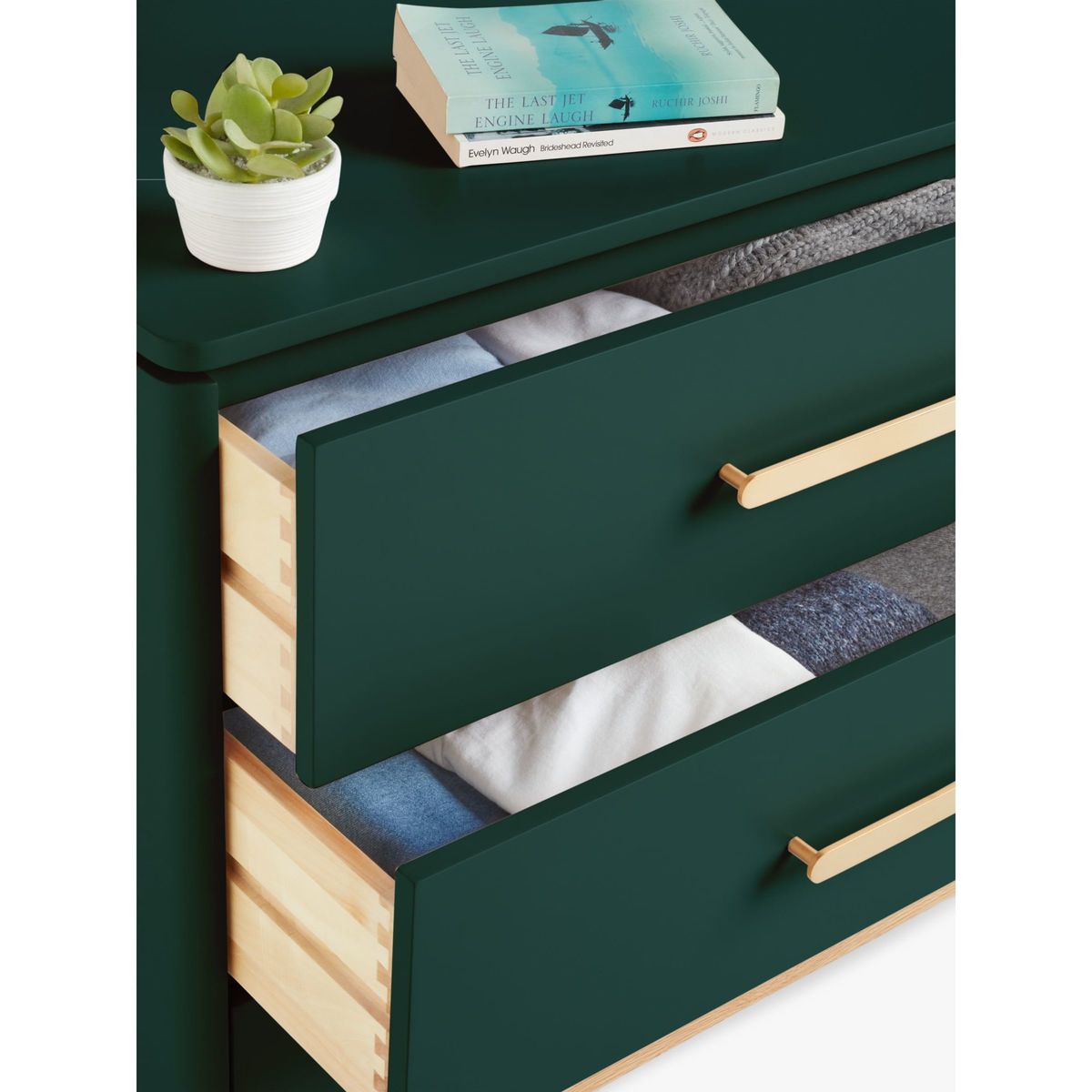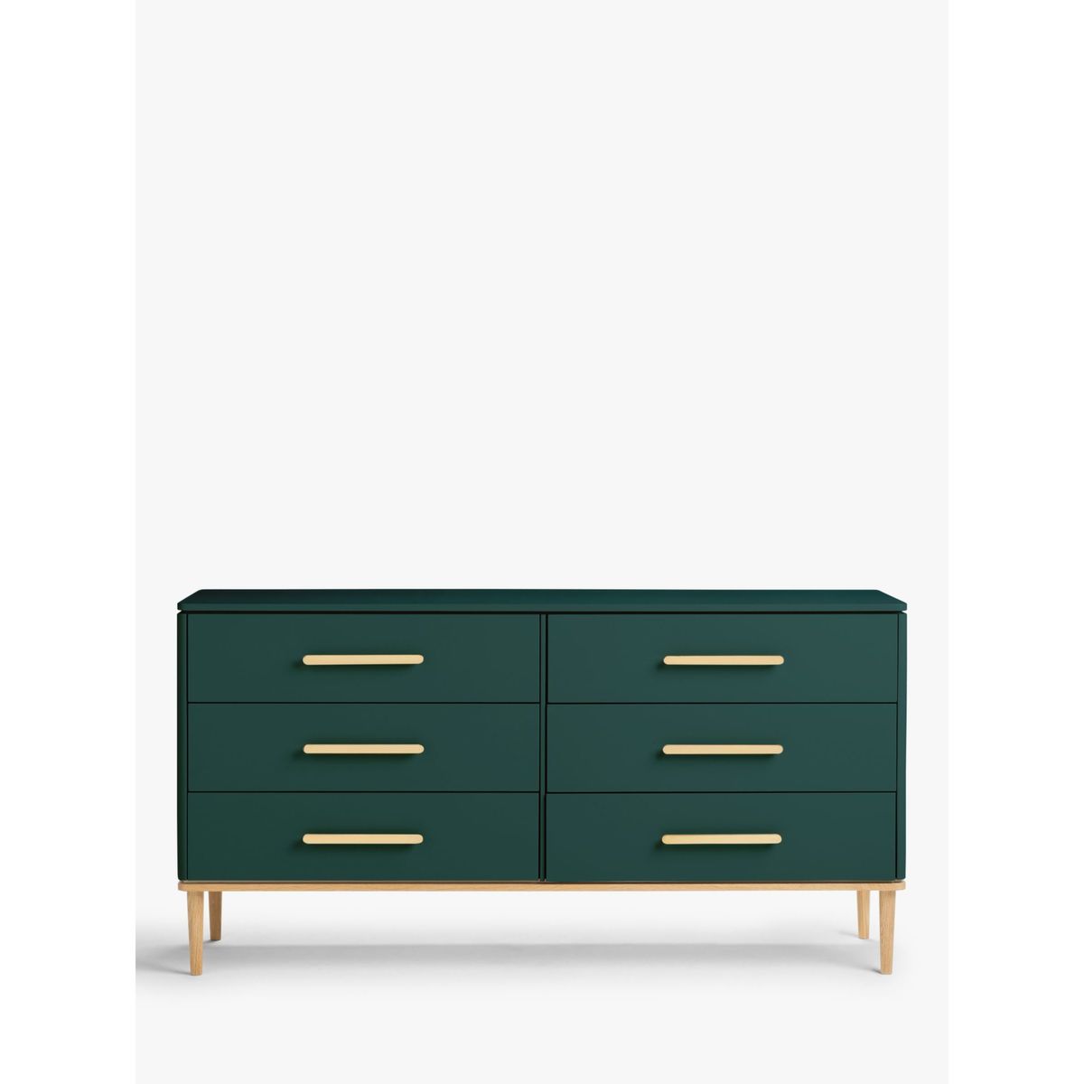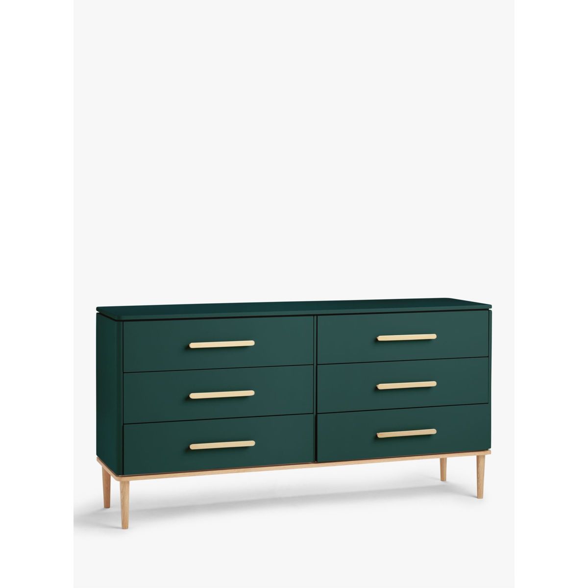 We've designed our Show Wood chest of drawers to help you be more expressive with your interior styling. Made from high-quality poplar wood, we've painted it in a range of bold colours and accented it with brass metal detailing to create a real focal point in your bedroom. This wide chest has six spacious drawers in total, providing ample storage space. The wooden legs, with their natural, tapered shape, give the chest a soft, design contrast. Want to see it first? You may want to see and get a feel for the furniture in one of our shops before ordering. We'll be able to tell you where the range you'd like to view is on display.