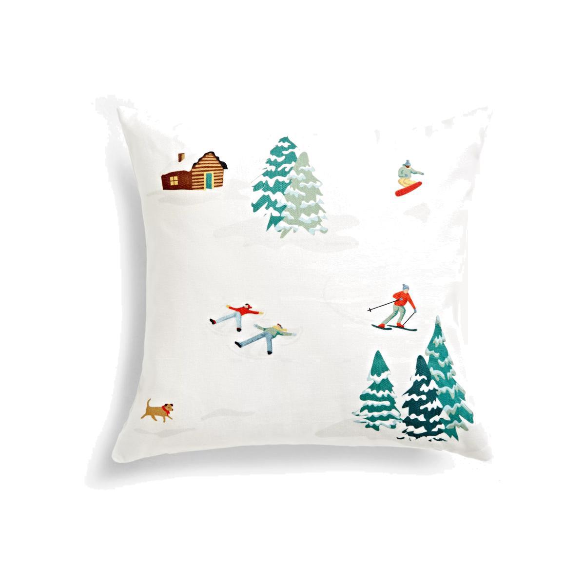 Made with a digital print of a skier and winter fun in the snow, this square cushion is plain on the reverse side. The zip closure along the bottom opens to access the removable polyester fibre padding.