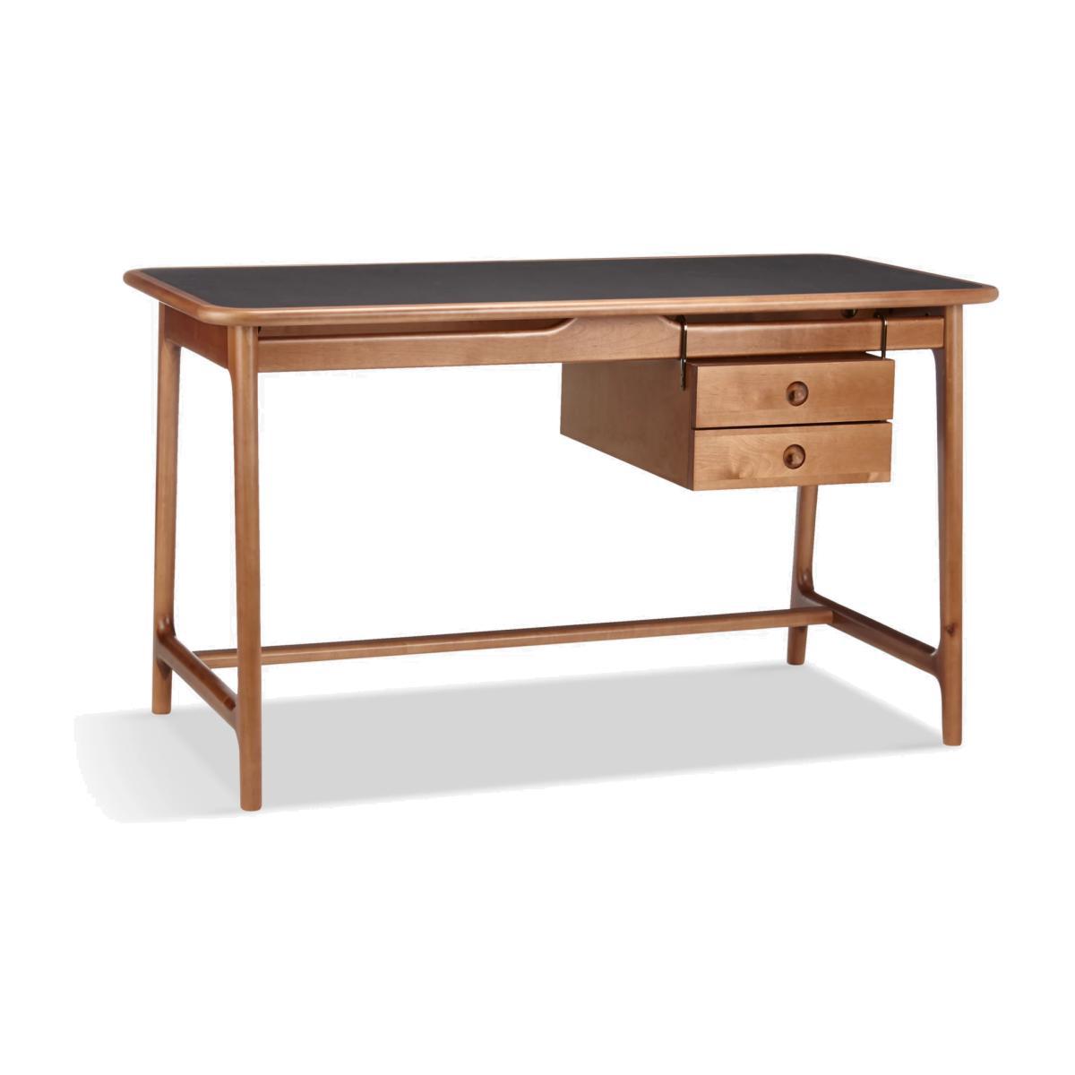 This sleek mid-century inspired desk is perfectly positioned in an office or study to create a sophisticated working environment with real style appeal. Its faux leather table top provides an attractive and durable surface for work, while the smooth wooden frame and floating drawers offer a distinctive finish. The drawers can moved to suit your requirements, simply unhook to place them on your preferred side of the desk. Please note: not all our ranges are on display in our shops.