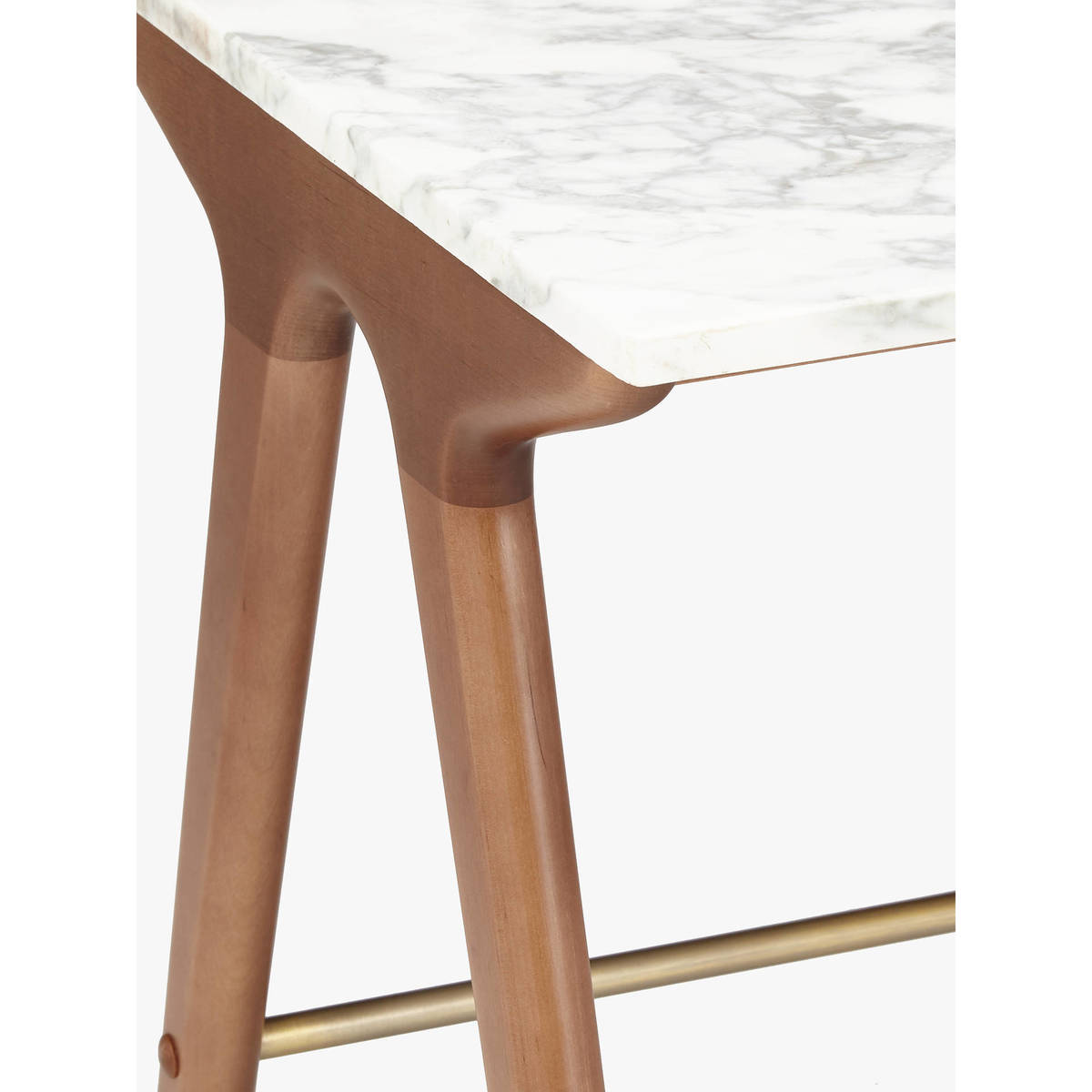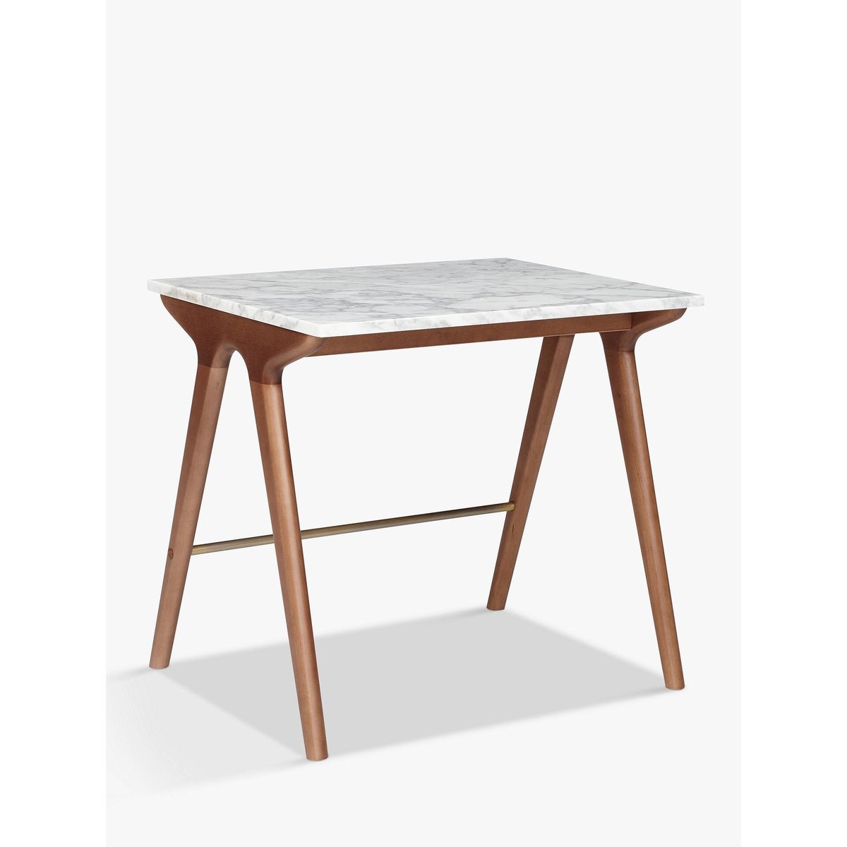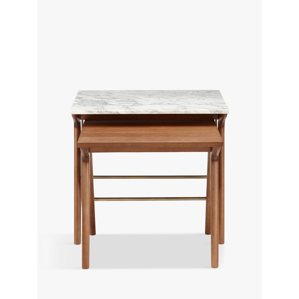 This sleek mid-century inspired nest of tables is perfectly positioned in your living room to create instant additional surface space. The larger table features an opulent marble effect top, while the smaller, in contrast, exhibits a smooth walnut finish.