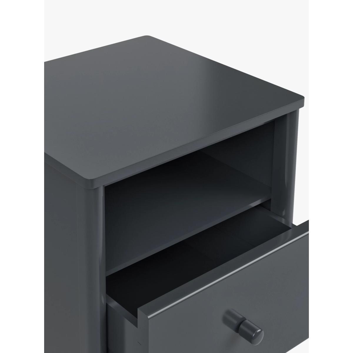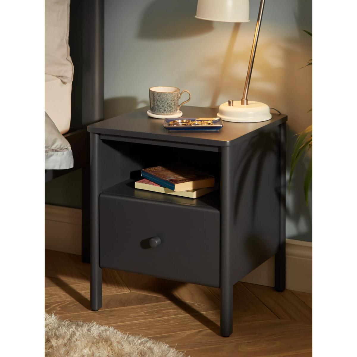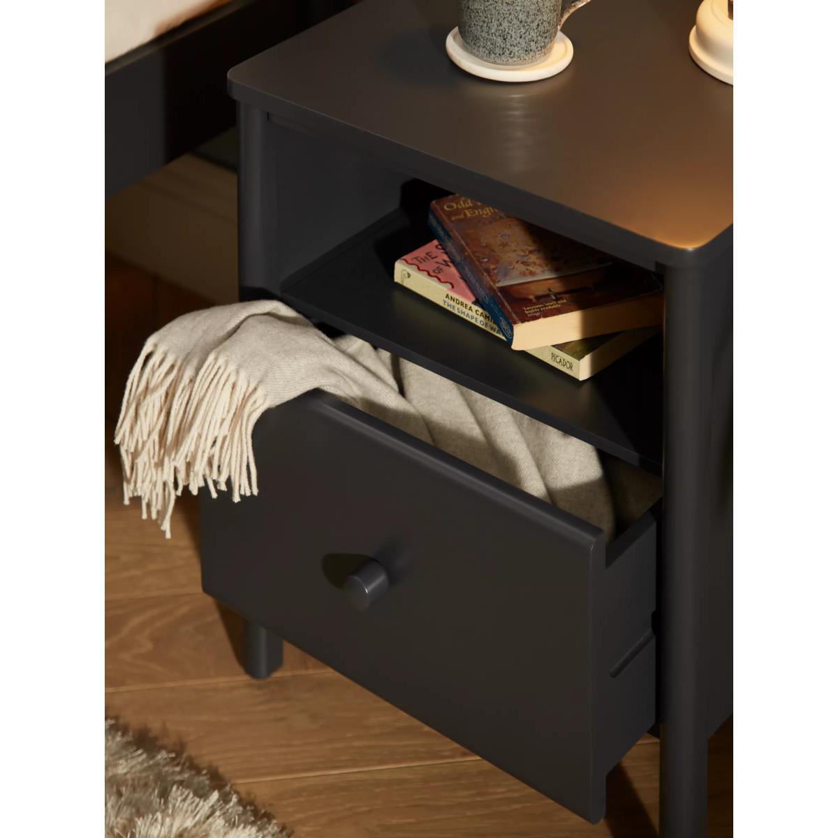 Our in-house designers focused on minimal design, sturdy woodwork and softer shapes when creating our Spindle range of bedroom furniture. Each piece is made from a combination of solid oak, pine wood, MDF and plywood, with an oiled coating for durability. This bedside table features a deep drawer for storage and an open shelf section for easy access to your bedside essentials. The rounded edges, solid turned timber handles and shapely spindle legs are charming design details, perfect for enhancing a clean and calming aesthetic in your bedroom. Its compact profile makes it well-suited in smaller spaces. Available in a warm natural or bold painted finish. Want to see it first? You may want to see and get a feel for the furniture in one of our shops before ordering. We'll be able to tell you where the range you'd like to view is on display.