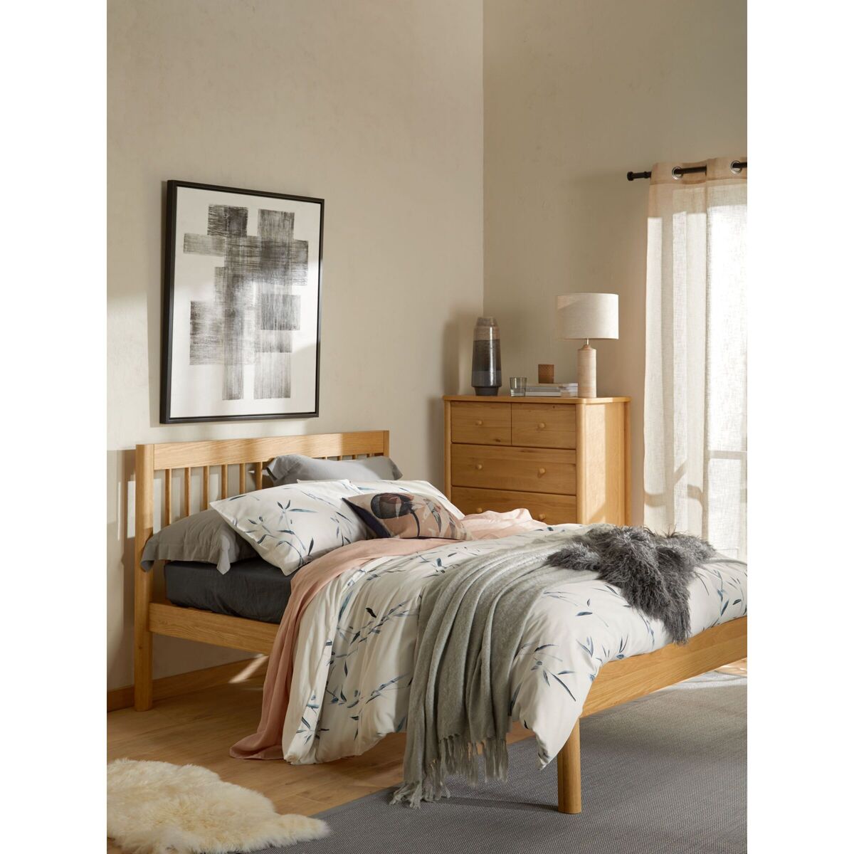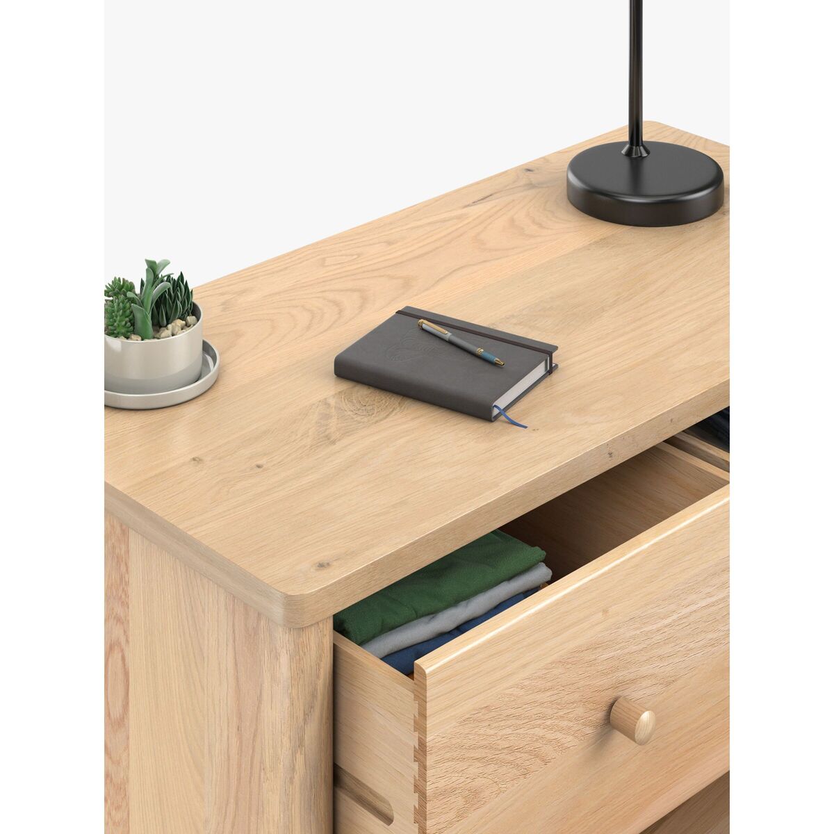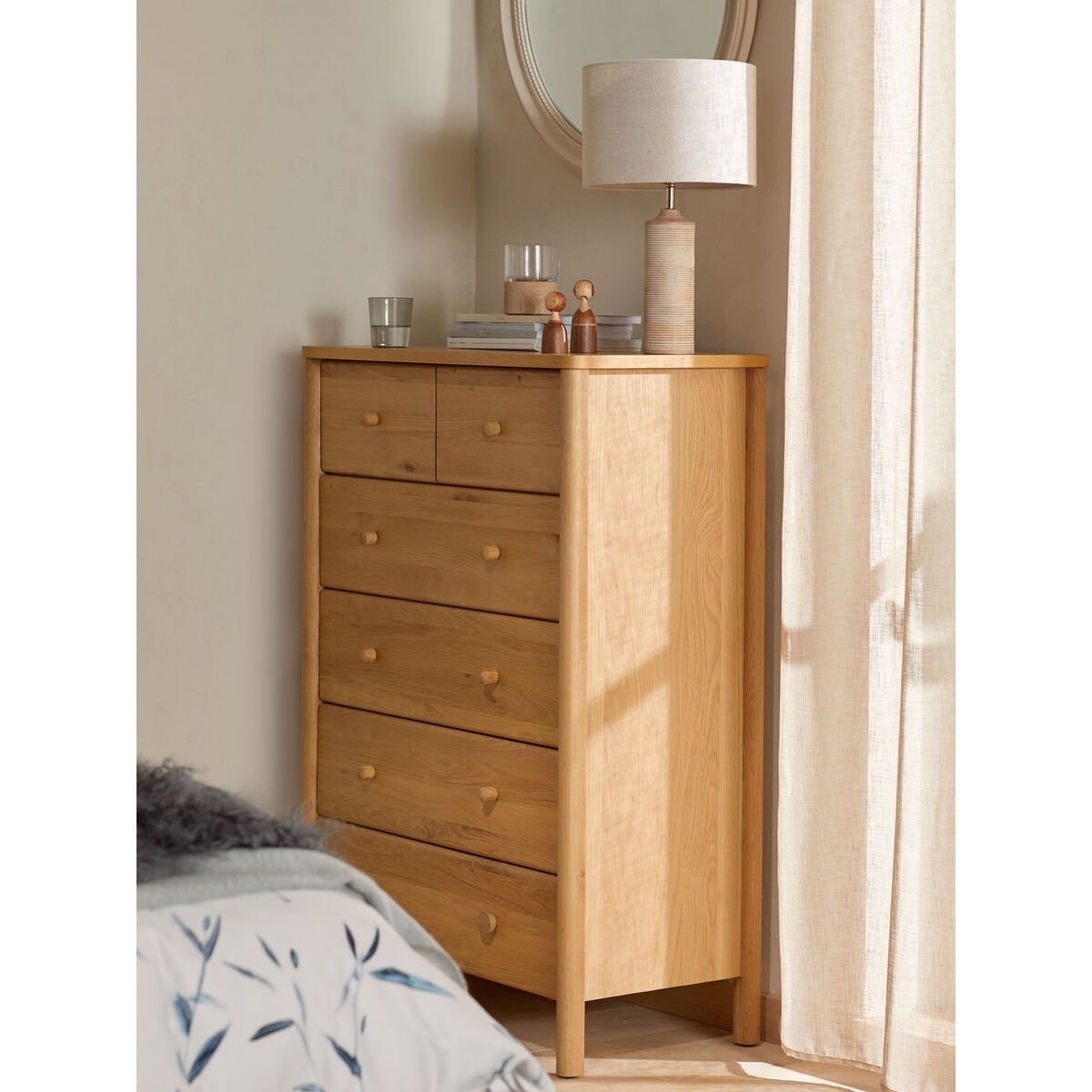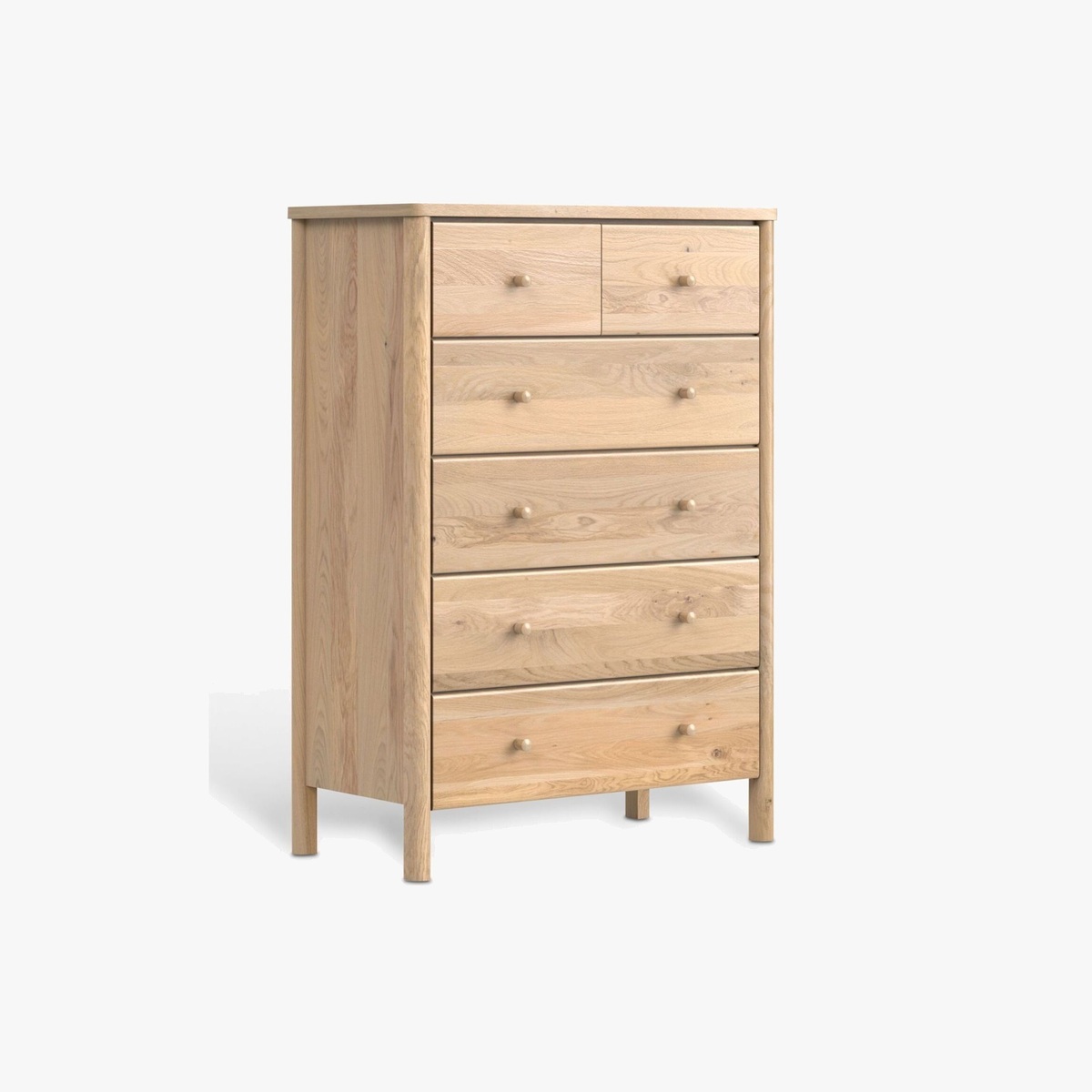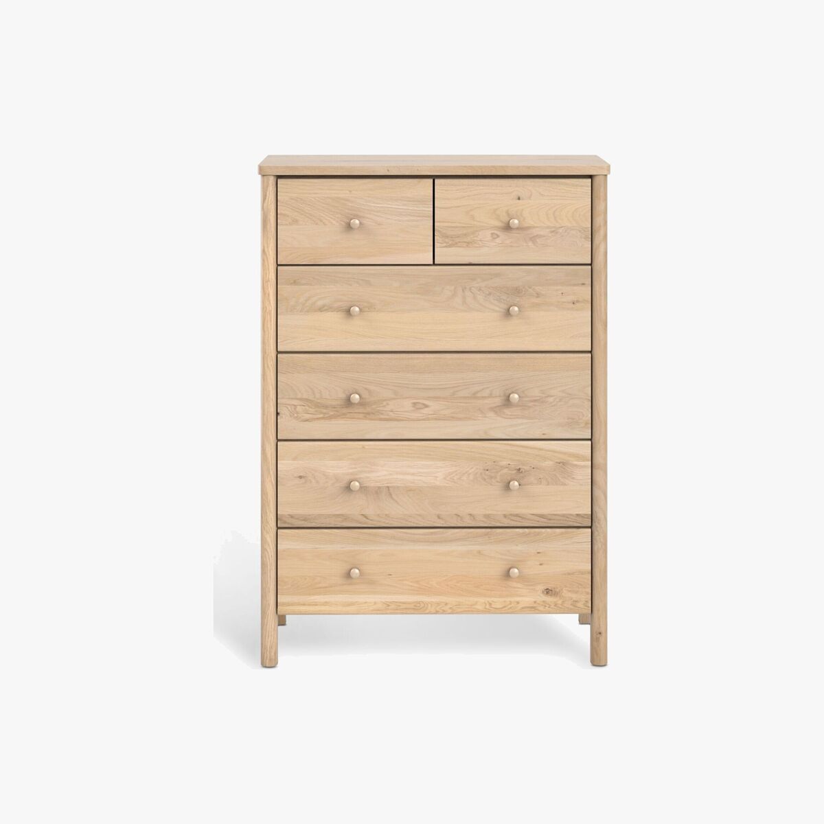 Our in-house designers focused on minimal design, sturdy woodwork and softer shapes when creating our Spindle range of bedroom furniture. Each piece is made from a combination of solid oak, pine wood, MDF and plywood, with an oiled coating for durability. This chest of drawers provides generous storage space, with six spacious drawers in total. The rounded edges, solid turned timber handles and shapely spindle legs are charming design details, perfect for enhancing a clean and calming aesthetic in your bedroom. Available in a warm natural or bold painted finish. Want to see it first? You may want to see and get a feel for the furniture in one of our shops before ordering. We'll be able to tell you where the range you'd like to view is on display.
