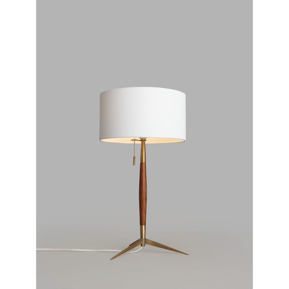 Made from walnut stained ash wood and accented with brushed brass details, we've designed the base of this table lamp with a Mid-Century aesthetic in mind. Its sleek, spindle-shaped frame and tripod-style base won't take up too much space on your surface top, and the linen lampshade will enhance a warm wash of light.
