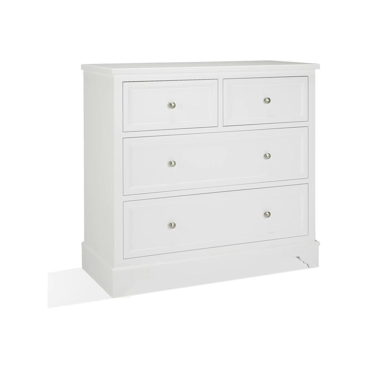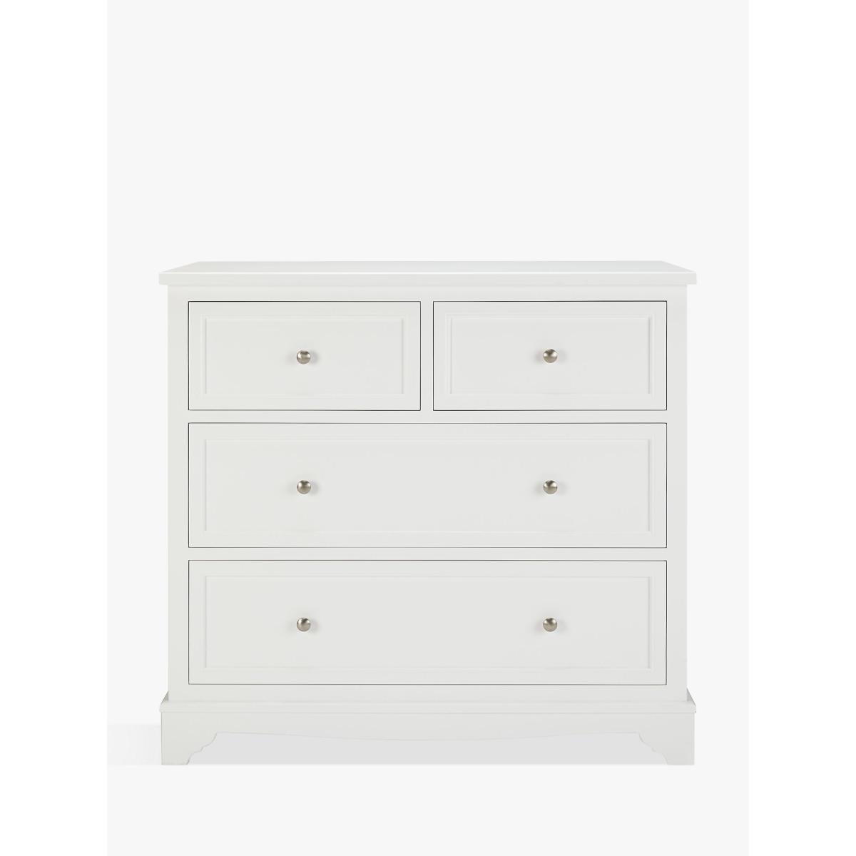 Inspired by the coastal town itself, our St Ives range of bedroom furniture encapsulates its fresh, charming feel. This chest of drawers is made from an impressive combination of solid oak and birch wood, with MDF and oak veneers adding to its reassuringly sturdy build. Panel detailing on each drawer adds a classic, traditional quality to the design and its painted finish makes it easy to style in both modern or more traditional interiors. There's also plenty of storage space in the four deep drawers, so keep your bedroom clutter free. Want to see it first? You may want to see and get a feel for the furniture in one of our shops before ordering. We'll be able to tell you where the range you'd like to view is on display.