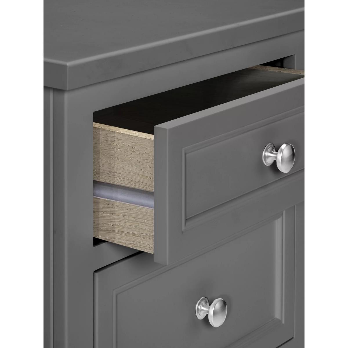 Inspired by the coastal town itself, our St Ives range of bedroom furniture encapsulates its fresh, charming feel. This dressing table is made from an impressive combination of solid oak and birch wood, with MDF and oak veneers adding to its reassuringly sturdy build. There are three spacious drawers on either side of the frame and a concealed drawer in the centre which is perfect for storing jewellery and trinkets. Panel detailing on the drawer fronts adds a classic, traditional quality to the design and its painted finish makes it easy to style in both modern or more traditional interiors. Want to see it first? You may want to see and get a feel for the furniture in one of our shops before ordering. We'll be able to tell you where the range you'd like to view is on display.