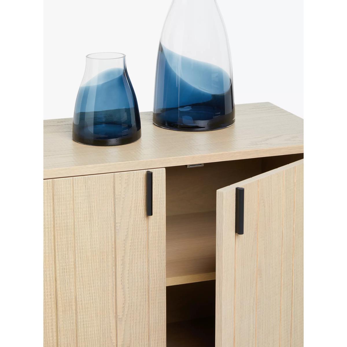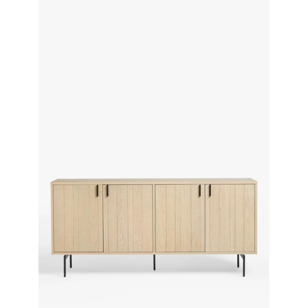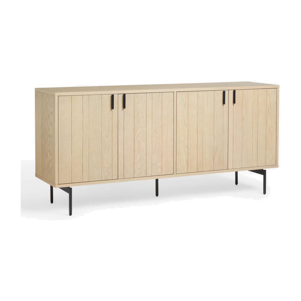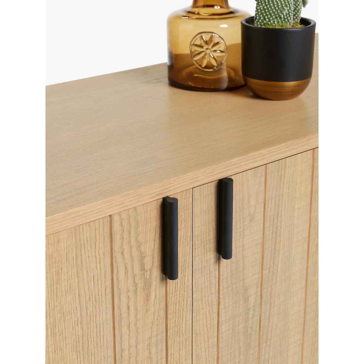 Combining utility and Scandi-inspired design, this spacious sideboard will bring a natural and understated style to your living room. It's made from high-quality oak veneer that's reassuringly durable, and it has minimalist metal legs and handles in an on-trend black finish. There's internal shelving, and we like how the doors have slatted detail on the front. We've also added a band sawn finish to the outer surfaces which adds depth and texture. Want to see it first? You may want to see and get a feel for the furniture in one of our shops before ordering. We'll be able to tell you where the range you'd like to view is on display.