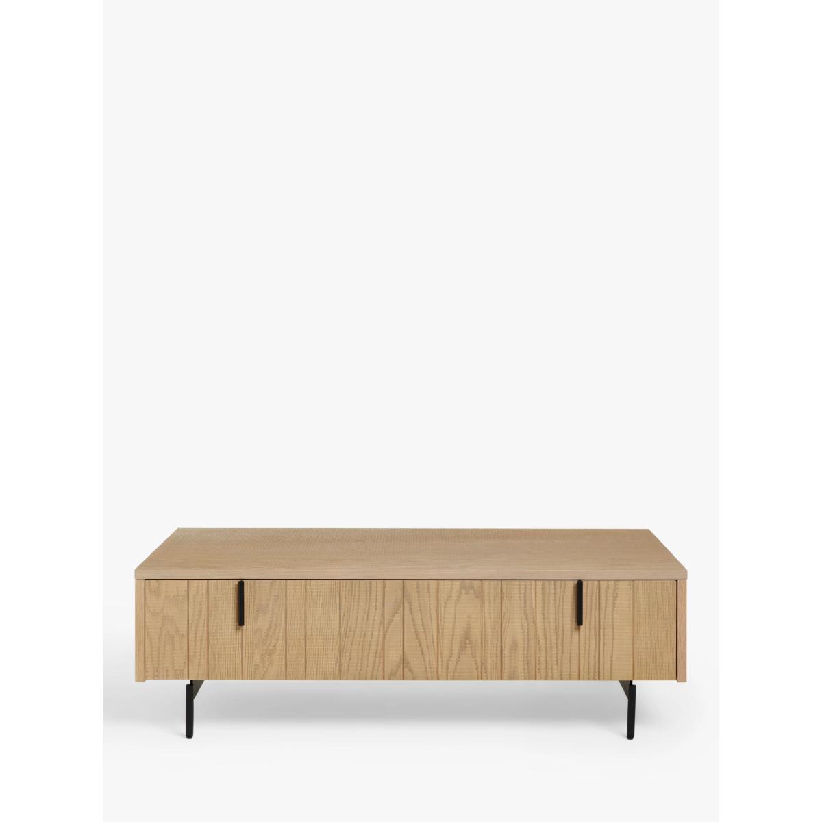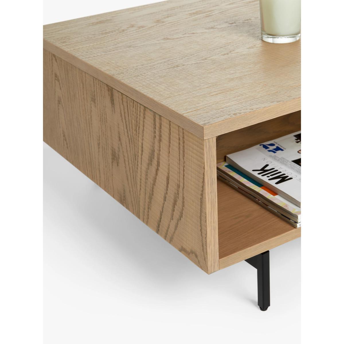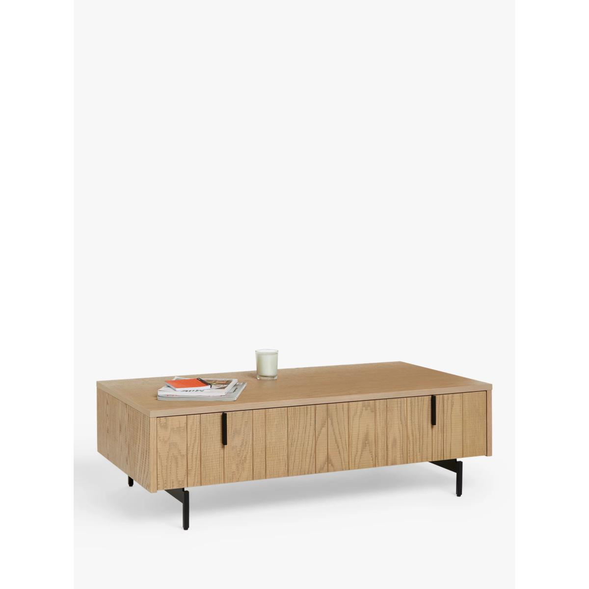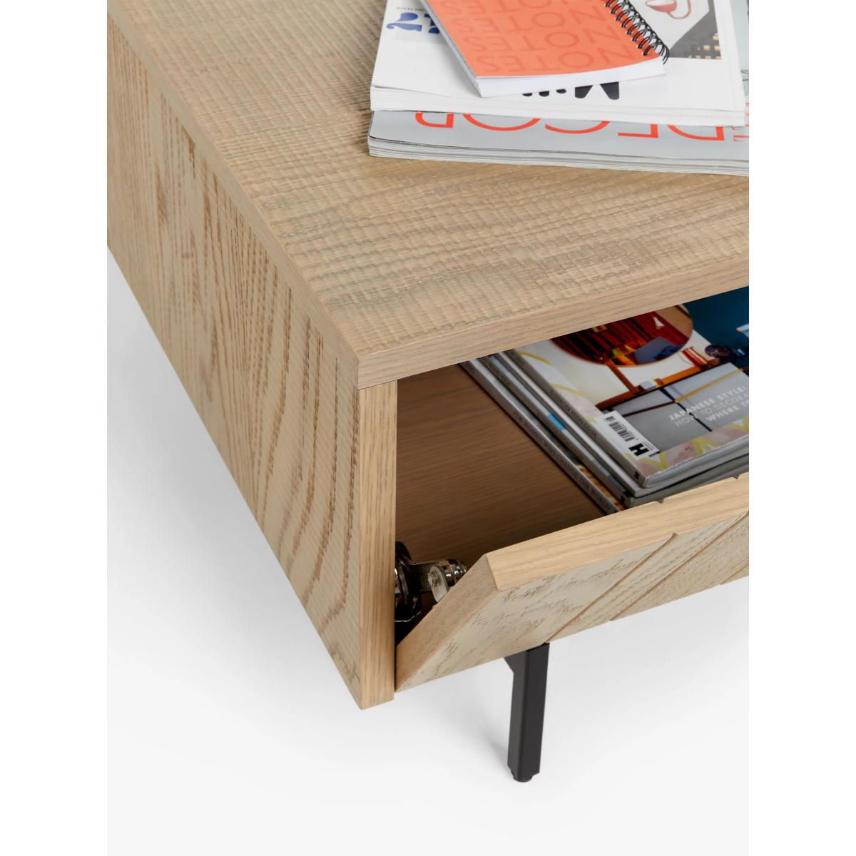 Combining utility and Scandi-inspired design, this coffee table is ideal if you need extra storage space in your living room. It's made from high-quality oak veneer that's reassuringly durable, and it has minimalist metal legs in an on-trend black finish. We've also added a band sawn finish to the outer surfaces which adds depth and texture. We like how the side of the table has a flap-down door which reveals a concealed storage space. Perfect for storing magazines and console remotes to keep the surface top free from clutter. Want to see it first? You may want to see and get a feel for the furniture in one of our shops before ordering. We'll be able to tell you where the range you'd like to view is on display.