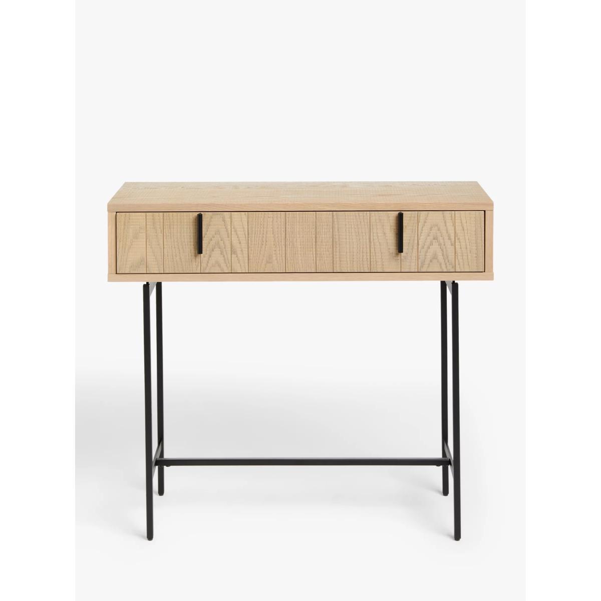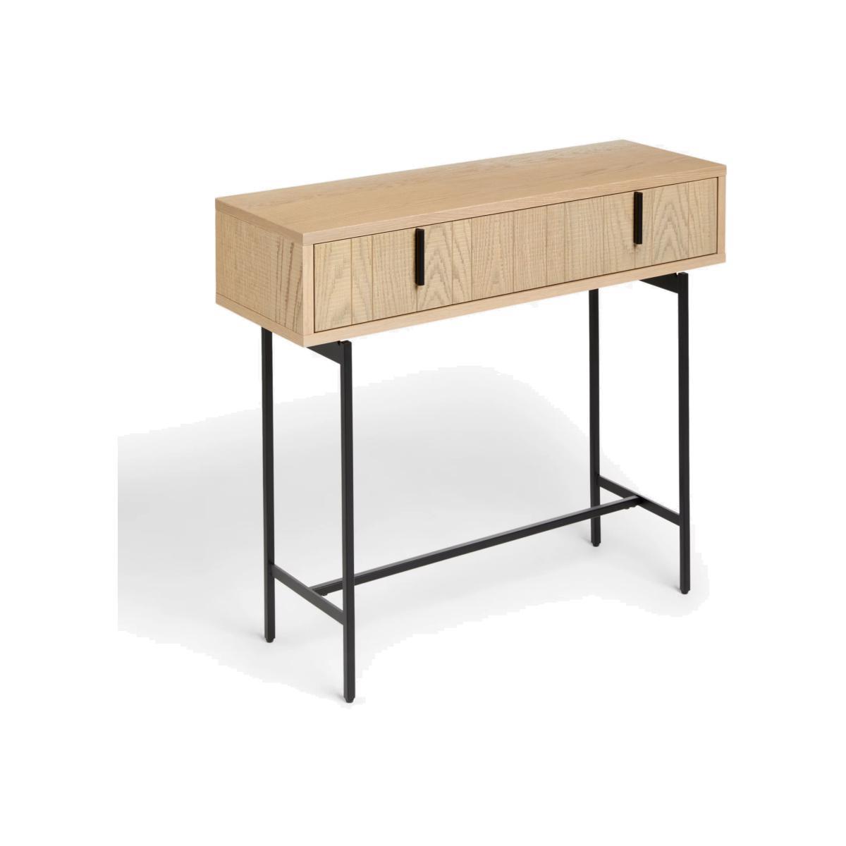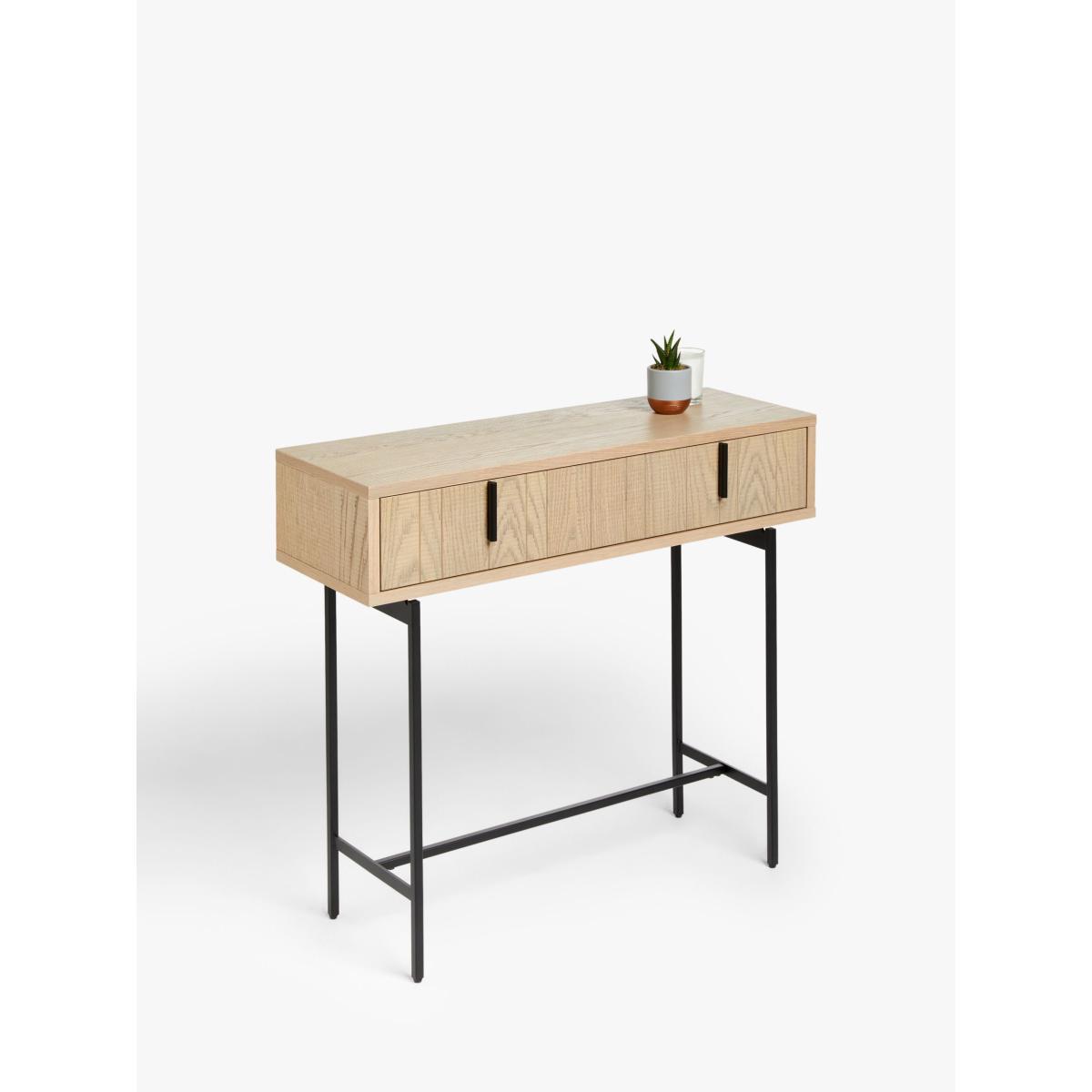 Combining utility and Scandi-inspired design, this console table is ideal if you need extra storage space in your living room or hallway. It's made from high-quality oak veneer that's reassuringly durable, and it has minimalist metal legs and handles in an on-trend black finish. There's one drawer, and we like the slatted detail on the front as it gives the table a clean and natural look. We've also added a band sawn finish to the outer surfaces which adds depth and texture. Want to see it first? You may want to see and get a feel for the furniture in one of our shops before ordering. We'll be able to tell you where the range you'd like to view is on display.