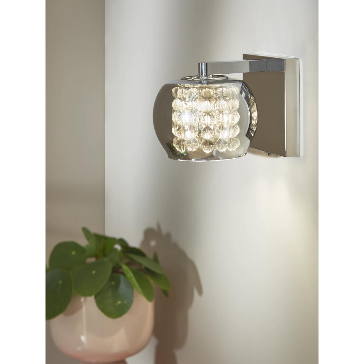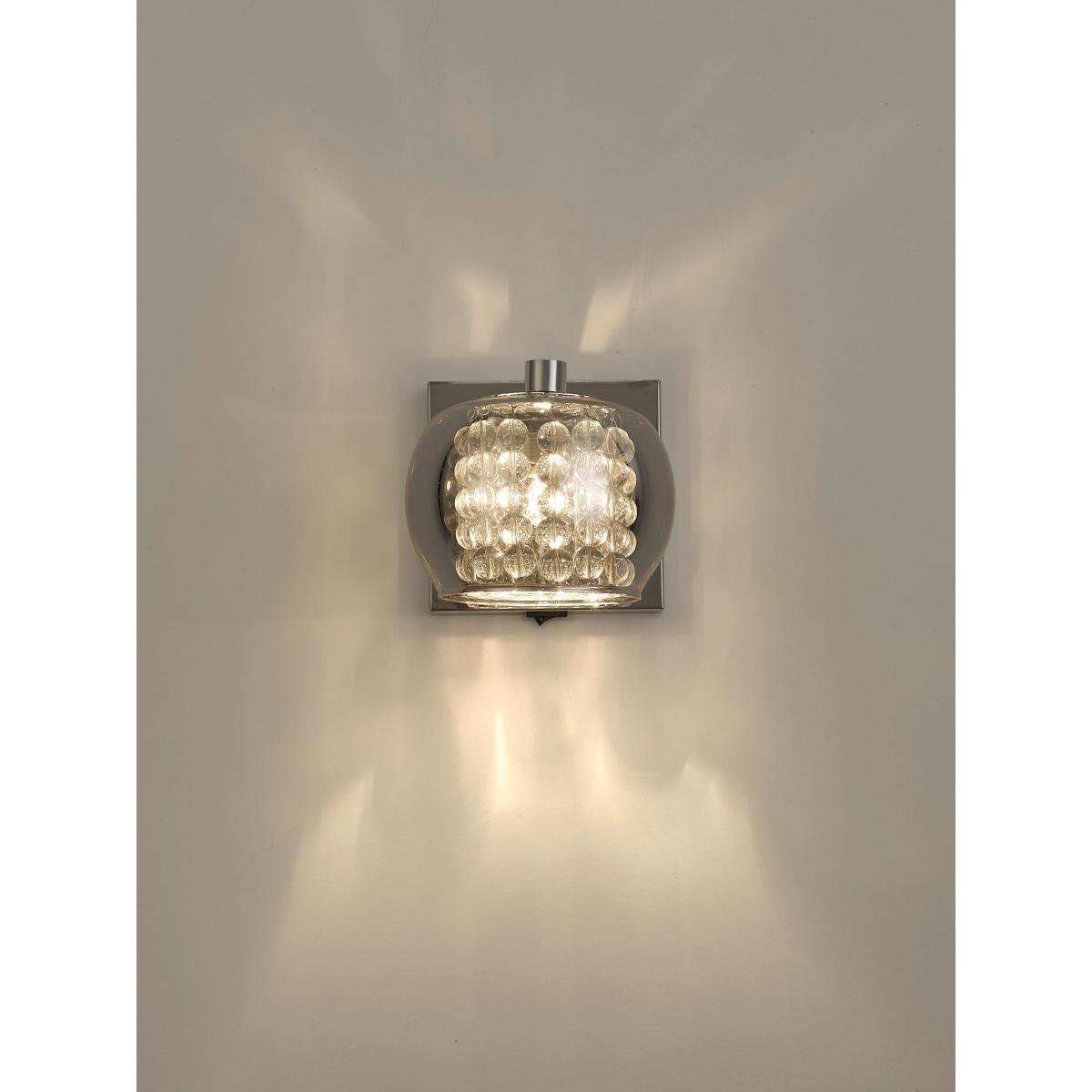 This compact wall light is designed with a smoked glass shade set around columns of glass beads. The result is a wall light that catches the eye when switched on or off. When lit, the beads become visible and glow to create a warm ambience and light pattern up and down your wall, and when switched off, the smoked glass shade appears semi-opaque. Plus, there's an integrated push switch for easy operation and a smart, polished chrome wall plate.