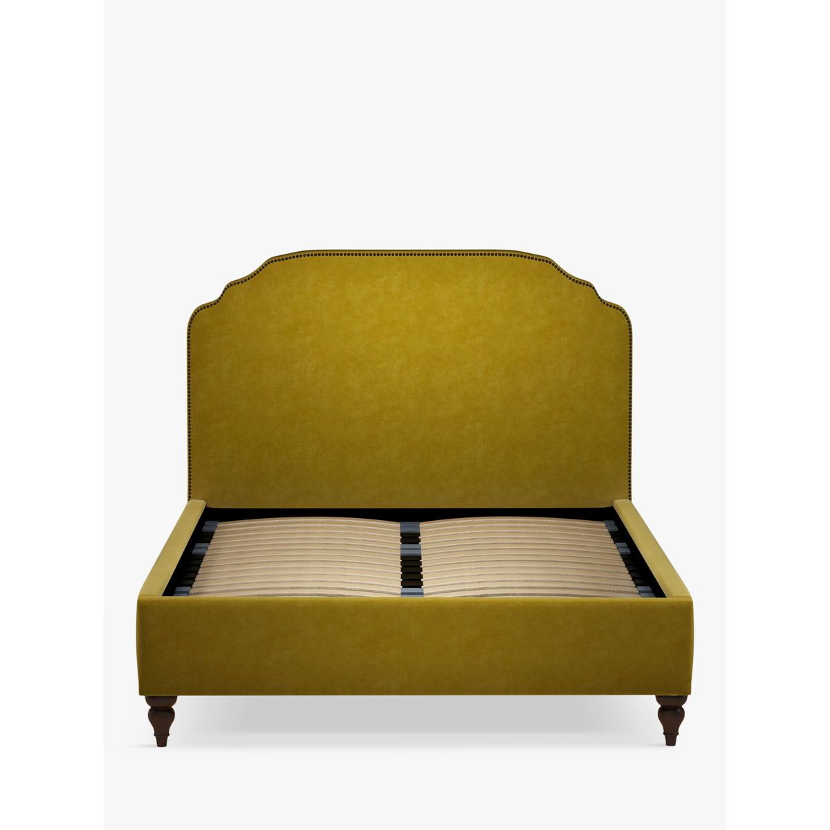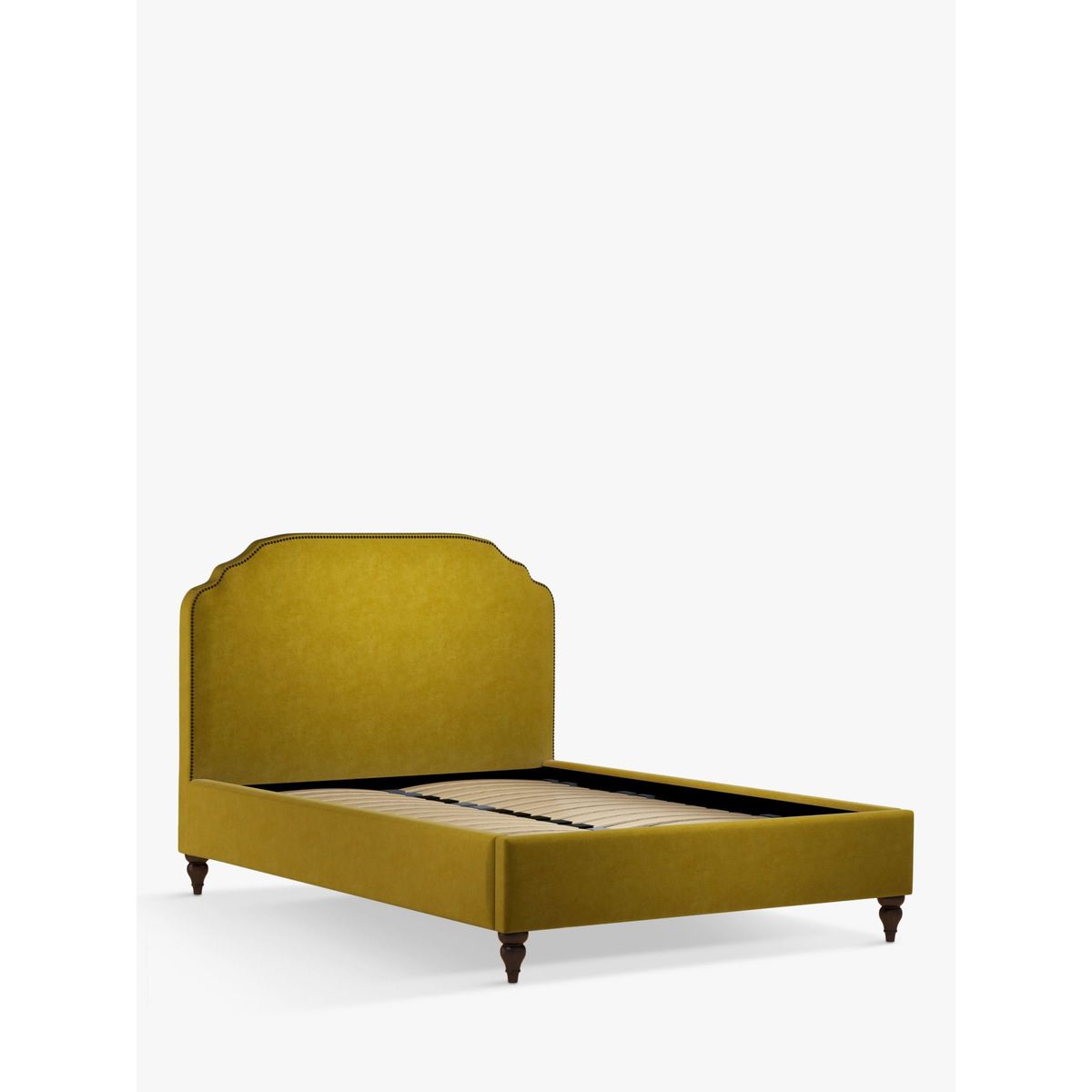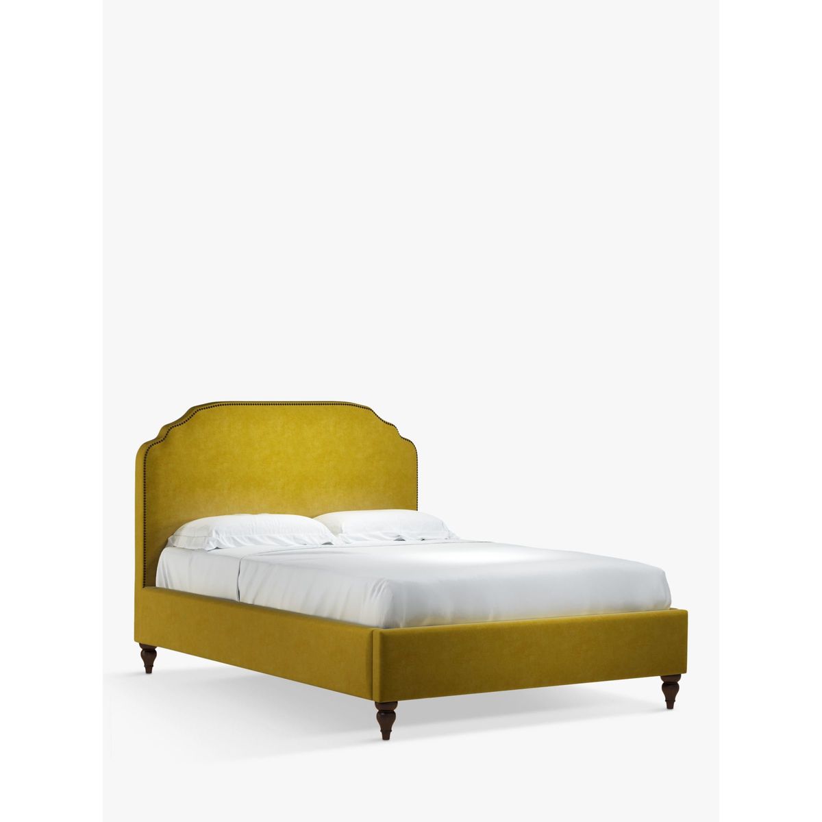 Designed with studs around the edge of its large headboard, our Studded bed frame oozes vintage glamour. The shape is classic but the upholstered finish gives it a modern edge, making it easy to tie into different interior styles. It sits on low, twisted wooden legs and its sprung slats provide a supportive base for you and your mattress. Smart Slats This bed frame is designed with wider slats at the shoulders, lumbar and feet, that provide maximum support for you and your mattress so that you experience perfect spinal alignment while you sleep. Standard slat caps are black so we have added grey slat caps to ensure that you know where to place the wider slats. Choose from one of our fabrics: Our Band A fabric, Topaz is woven to create a linen-effect feel Our Band A fabric, Saga is woven with man-made fibres, making it exceptionally durable and versatile Our Band B fabric, Erin has a velvet-style, chenille feel. It's woven with man-made fibres to create a beautifully soft yarn and can appear two-tone in different lights Our Band B fabric, Opulence is soft and luxurious like velvet Our Band B fabric, Mole is a soft and cosy woven wool-blend. Piling and bobbling may occur naturally over time Our Band C fabric, Aquaclean Harriet is made from a short, dense pile of velvet that has a soft, brushed finish. An Aquaclean treatment has been applied to this resilient fabric which means you can banish the majority of household stains with water. The treatment covers every fibre with an invisible coating so it doesn't need to be retreated or re-coated. It will naturally develop lines, scuffs and shading over time. Want to see it first? You may want to see and get a feel for the furniture before ordering. Pop into one of our shops to see the full range of colours and fabrics on offer. We'll be able to tell you where the range you'd like to view is on display.