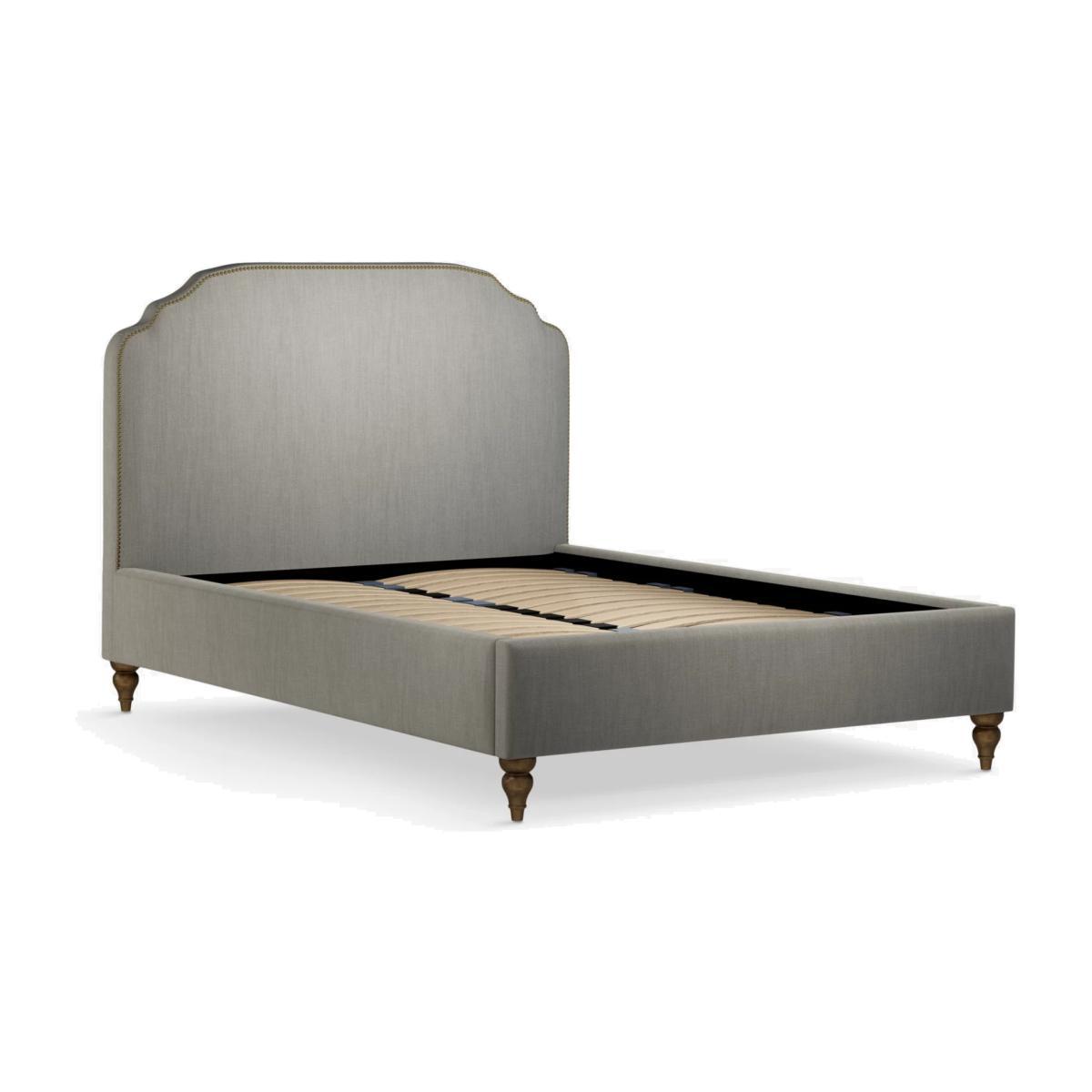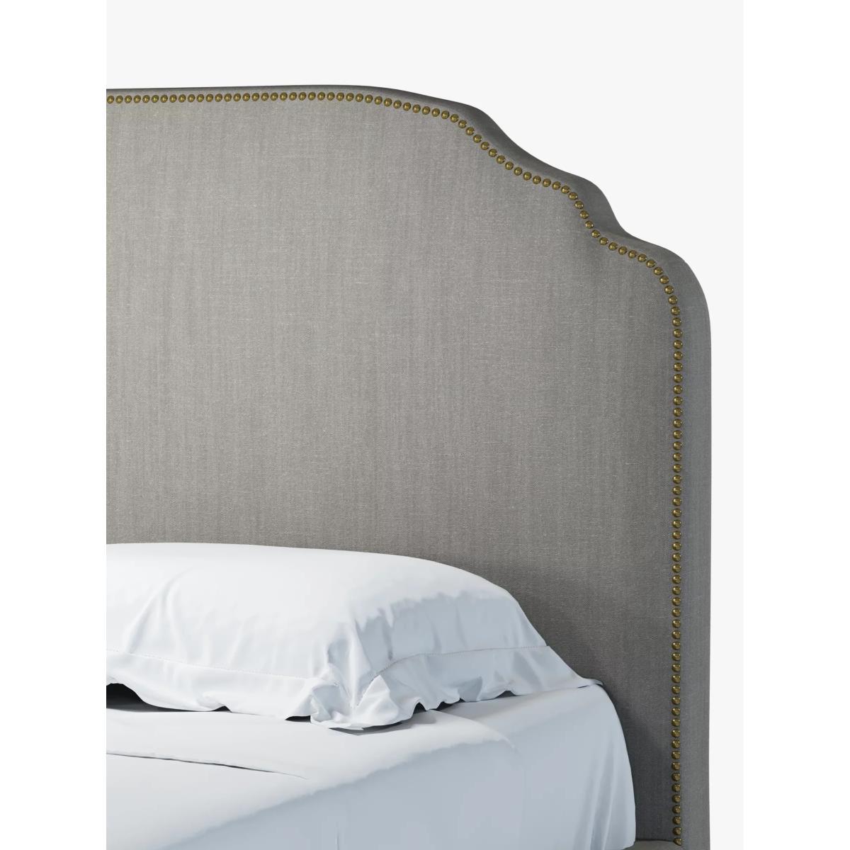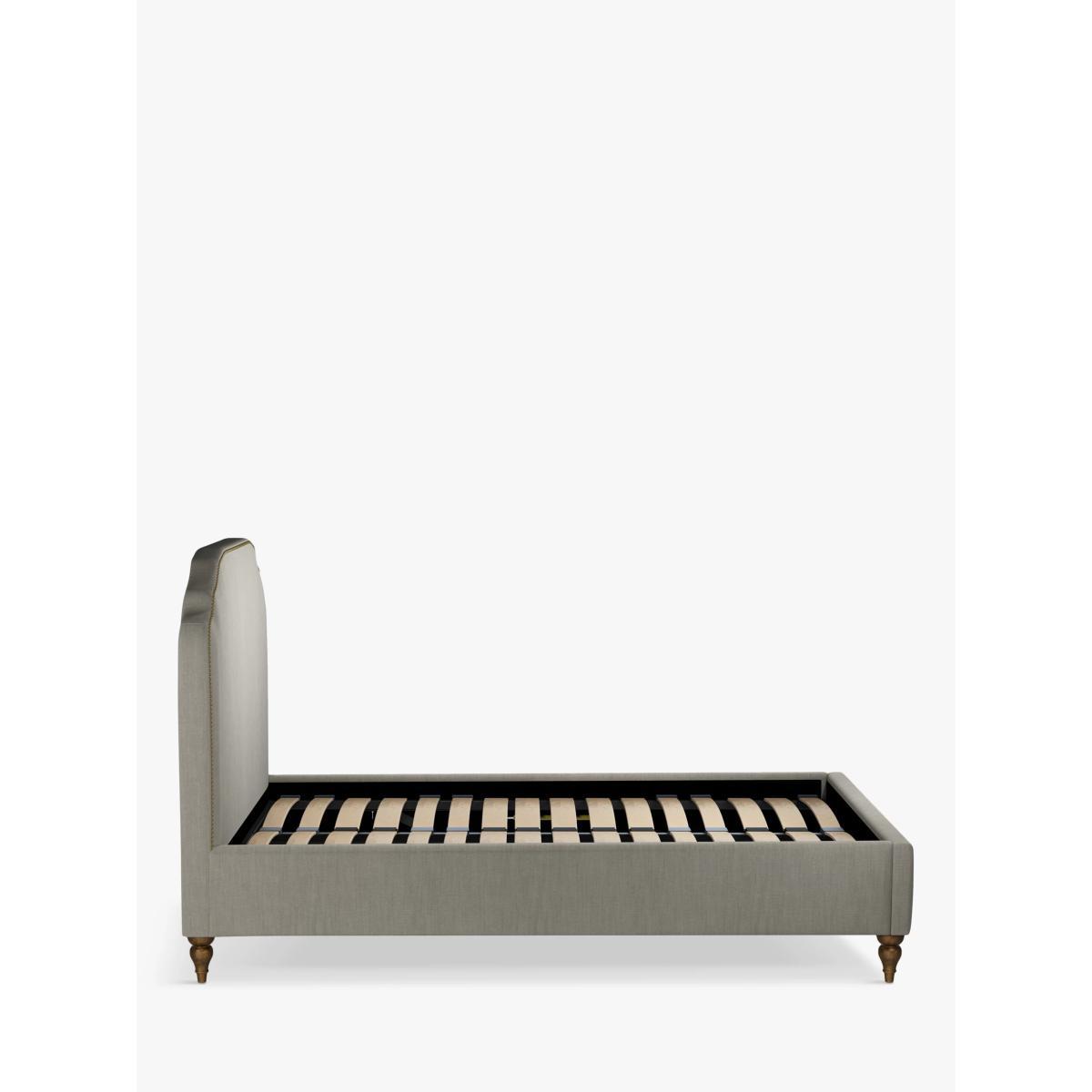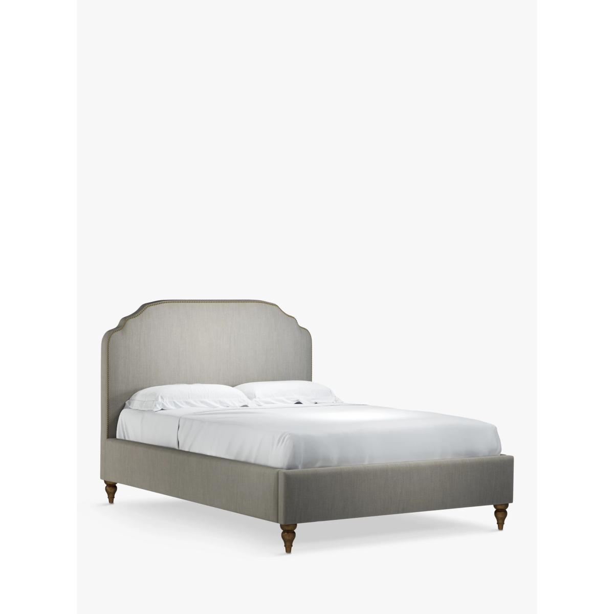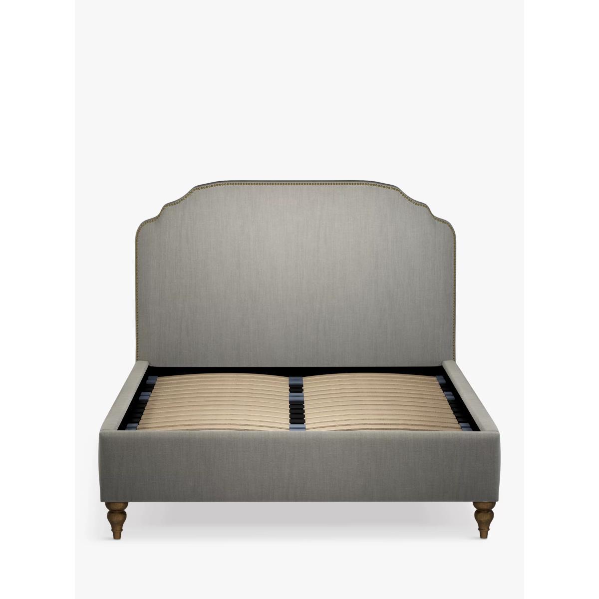 Designed with studs around the edge of its large headboard, our Studded bed frame oozes vintage glamour. The shape is classic but the upholstered finish gives it a modern edge, making it easy to tie into different interior styles. It sits on low, twisted wooden legs and its sprung slats provide a supportive base for you and your mattress. Smart Slats This bed frame is designed with wider slats at the shoulders, lumbar and feet, that provide maximum support for you and your mattress so that you experience perfect spinal alignment while you sleep. Standard slat caps are black so we have added grey slat caps to ensure that you know where to place the wider slats. Choose from one of our fabrics: Our Band A fabric, Topaz is woven to create a linen-effect feel Our Band A fabric, Saga is woven with man-made fibres, making it exceptionally durable and versatile Our Band B fabric, Erin has a velvet-style, chenille feel. It's woven with man-made fibres to create a beautifully soft yarn and can appear two-tone in different lights Our Band B fabric, Opulence is soft and luxurious like velvet Our Band B fabric, Mole is a soft and cosy woven wool-blend. Piling and bobbling may occur naturally over time Our Band C fabric, Aquaclean Harriet is made from a short, dense pile of velvet that has a soft, brushed finish. An Aquaclean treatment has been applied to this resilient fabric which means you can banish the majority of household stains with water. The treatment covers every fibre with an invisible coating so it doesn't need to be retreated or re-coated. It will naturally develop lines, scuffs and shading over time. Want to see it first? You may want to see and get a feel for the furniture before ordering. Pop into one of our shops to see the full range of colours and fabrics on offer. We'll be able to tell you where the range you'd like to view is on display.