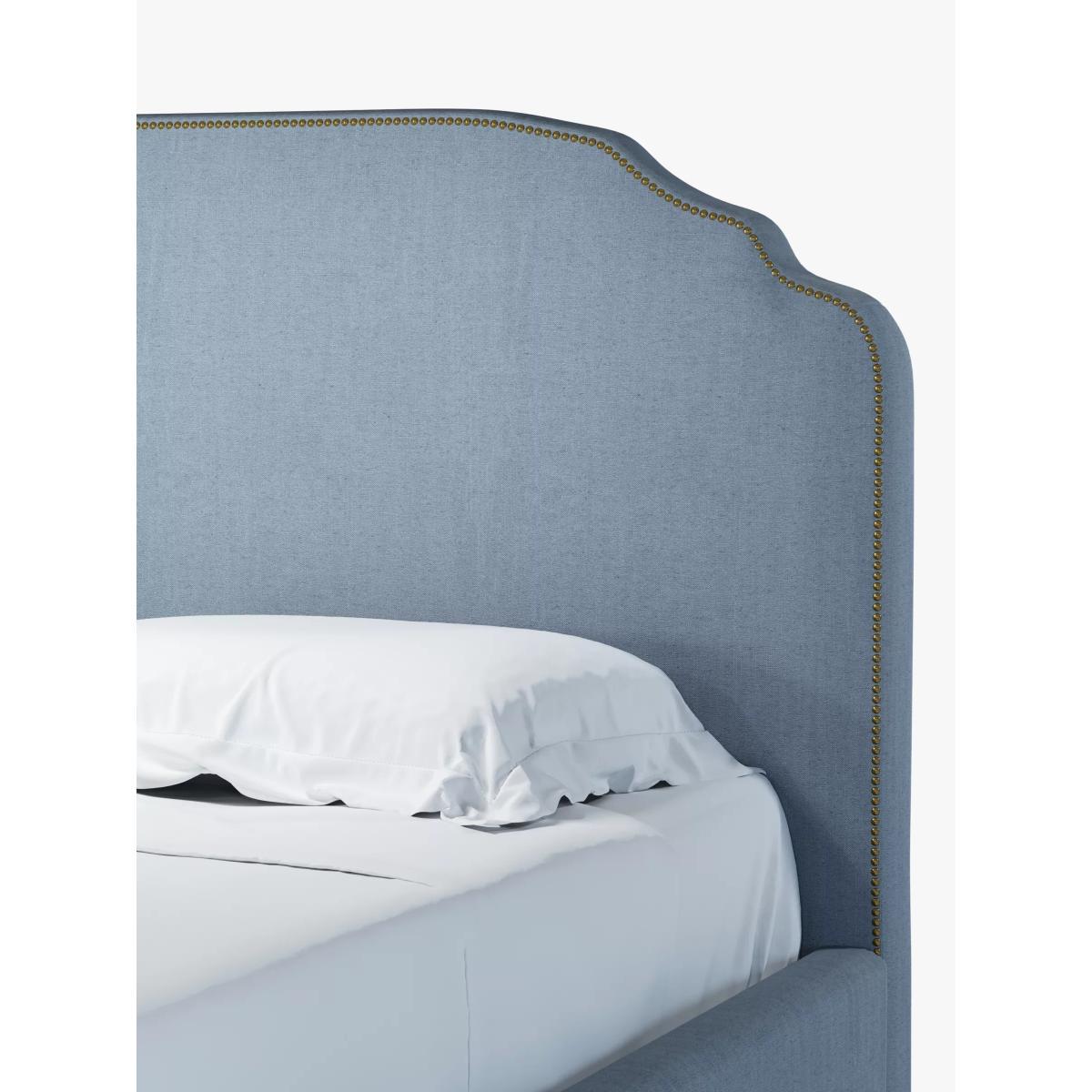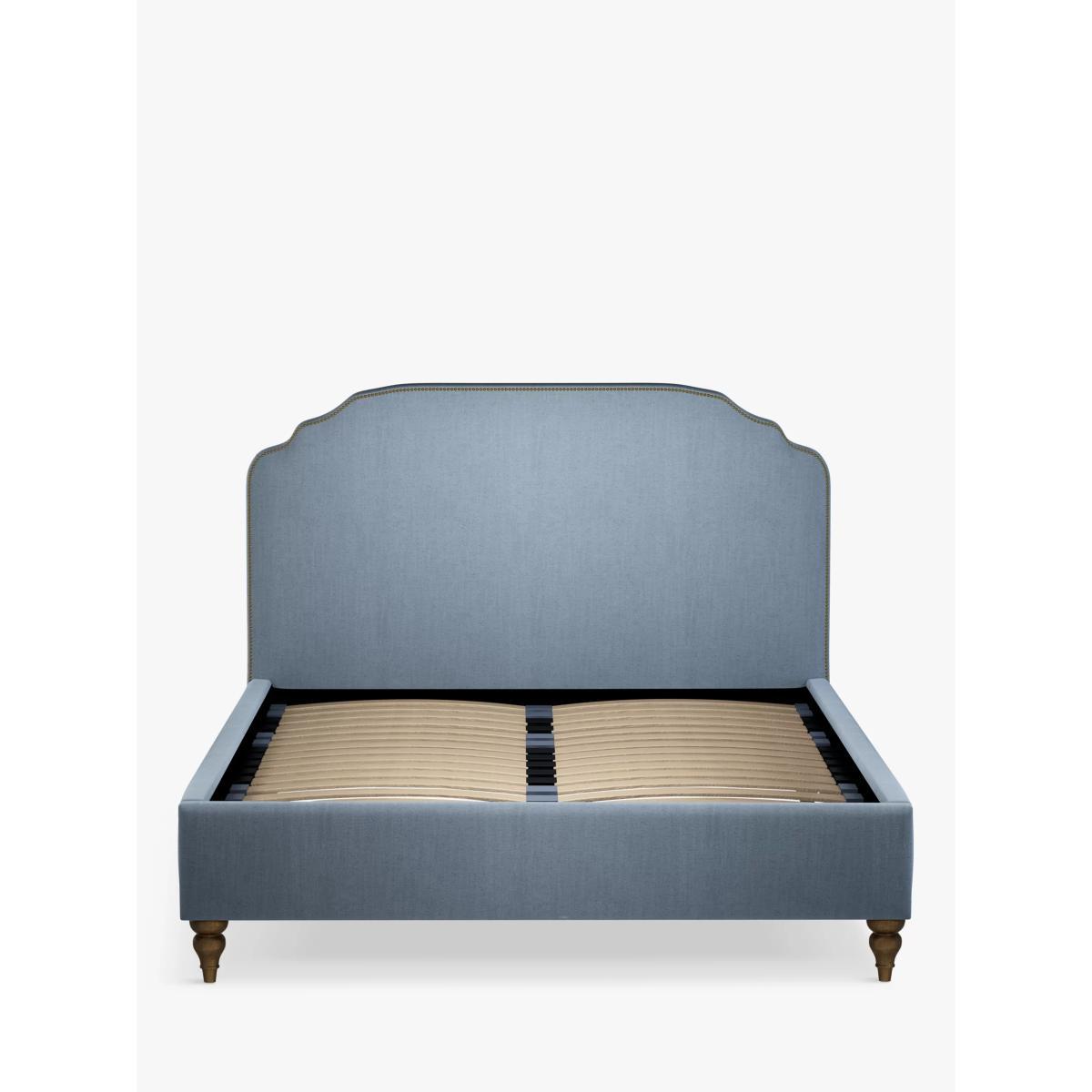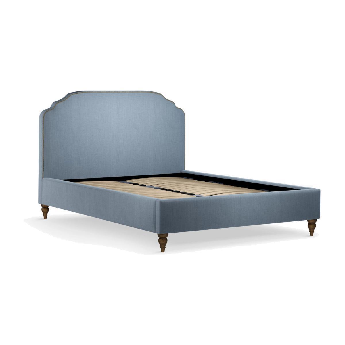 Designed with studs around the edge of its large headboard, our Studded bed frame oozes vintage glamour. The shape is classic but the upholstered finish gives it a modern edge, making it easy to tie into different interior styles. It sits on low, twisted wooden legs and its sprung slats provide a supportive base for you and your mattress. Smart Slats This bed frame is designed with wider slats at the shoulders, lumbar and feet, that provide maximum support for you and your mattress so that you experience perfect spinal alignment while you sleep. Standard slat caps are black so we have added grey slat caps to ensure that you know where to place the wider slats. Choose from one of our fabrics: Our Band A fabric, Topaz is woven to create a linen-effect feel Our Band A fabric, Saga is woven with man-made fibres, making it exceptionally durable and versatile Our Band B fabric, Erin has a velvet-style, chenille feel. It's woven with man-made fibres to create a beautifully soft yarn and can appear two-tone in different lights Our Band B fabric, Opulence is soft and luxurious like velvet Our Band B fabric, Mole is a soft and cosy woven wool-blend. Piling and bobbling may occur naturally over time Our Band C fabric, Aquaclean Harriet is made from a short, dense pile of velvet that has a soft, brushed finish. An Aquaclean treatment has been applied to this resilient fabric which means you can banish the majority of household stains with water. The treatment covers every fibre with an invisible coating so it doesn't need to be retreated or re-coated. It will naturally develop lines, scuffs and shading over time. Want to see it first? You may want to see and get a feel for the furniture before ordering. Pop into one of our shops to see the full range of colours and fabrics on offer. We'll be able to tell you where the range you'd like to view is on display.