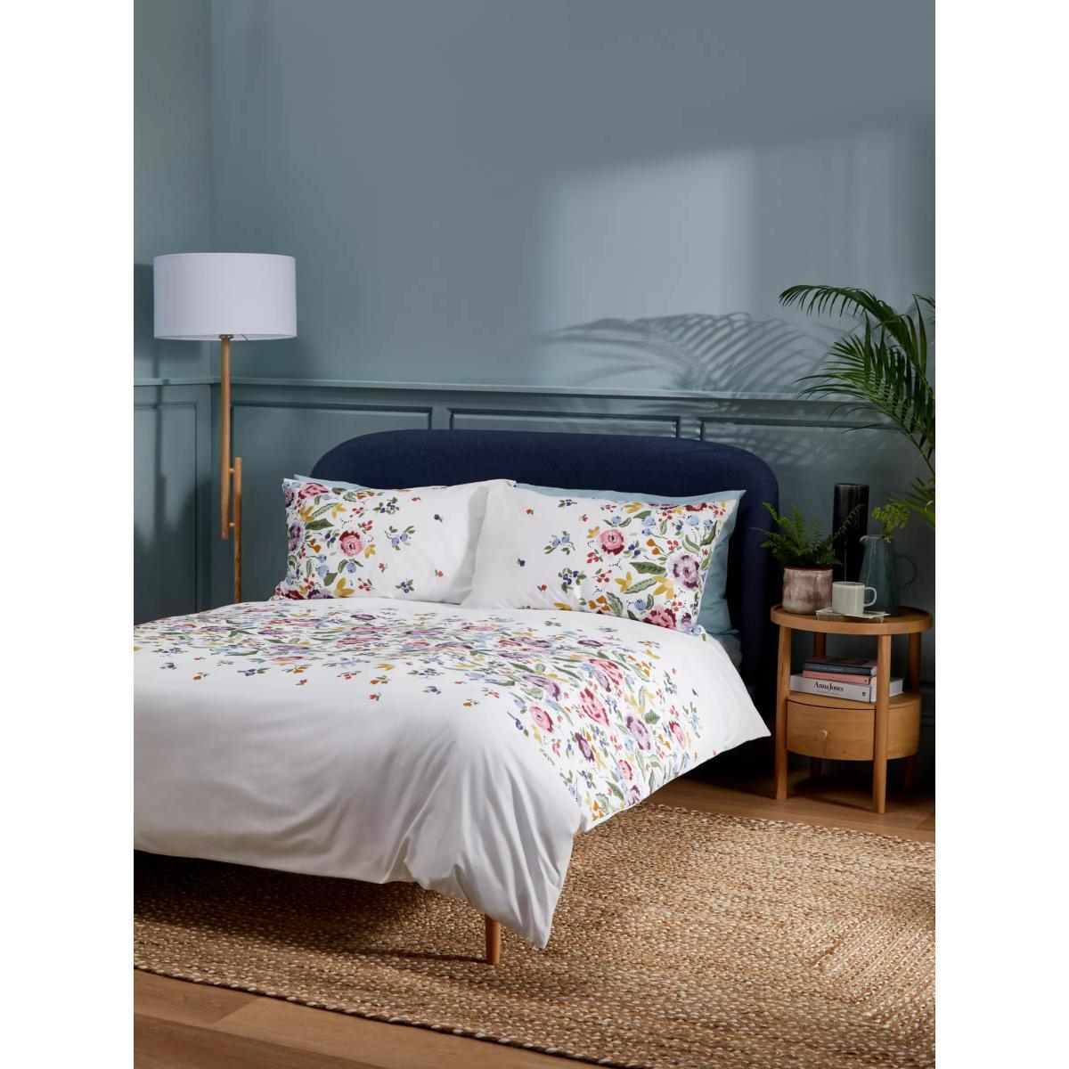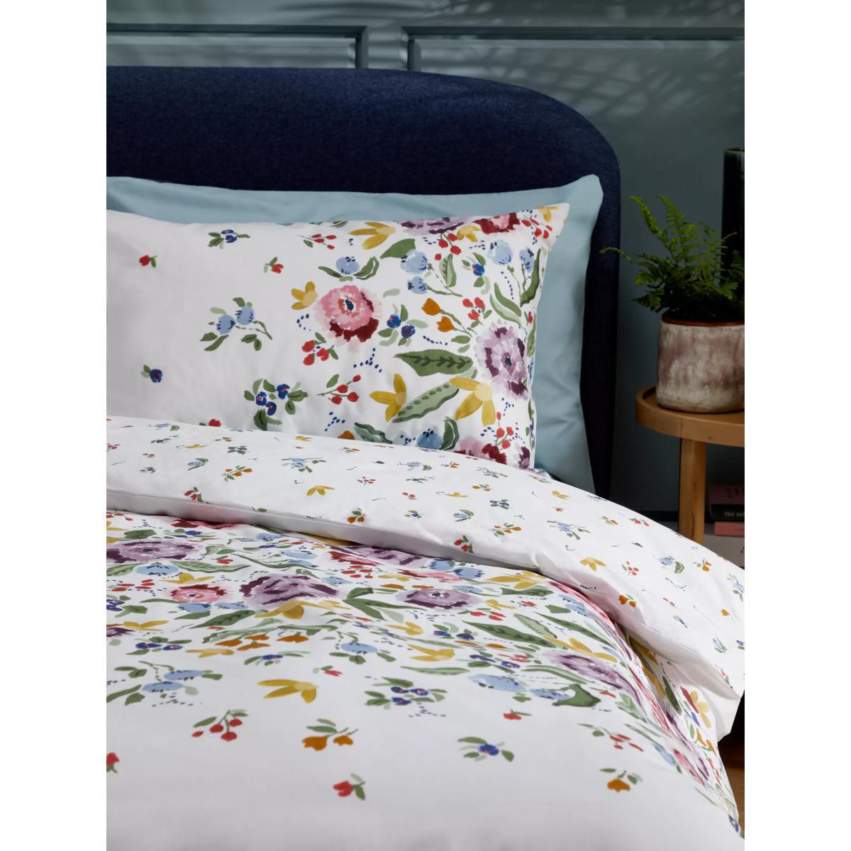 This beautiful bedding design was inspired by flower meadows in the summertime. The design was hand-painted, in a loose style, by our in house designers and is built up by large blooms, leaves and delicate buds. Made from soft and smooth 200 thread count cotton sateen, the all-natural fibre will help keep you cool and comfortable for a great night's sleep. The single set comes with one standard pillowcase, while the double, king and super king sets come with two standard pillowcases. Have you thought about sheeting? Shop. Bedding sizes To fit duvet/pillow size (cm) Standard pillowcase, L75 x W50cm Single duvet cover, L200 x W135cm Double duvet cover, L200 x W200cm King duvet cover, L220 x W225cm Super king duvet cover, L220 x W260cm