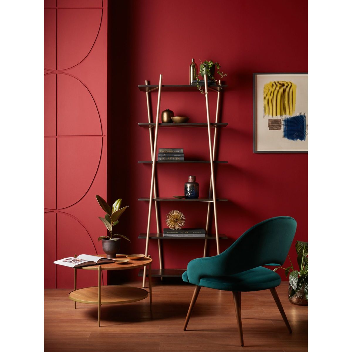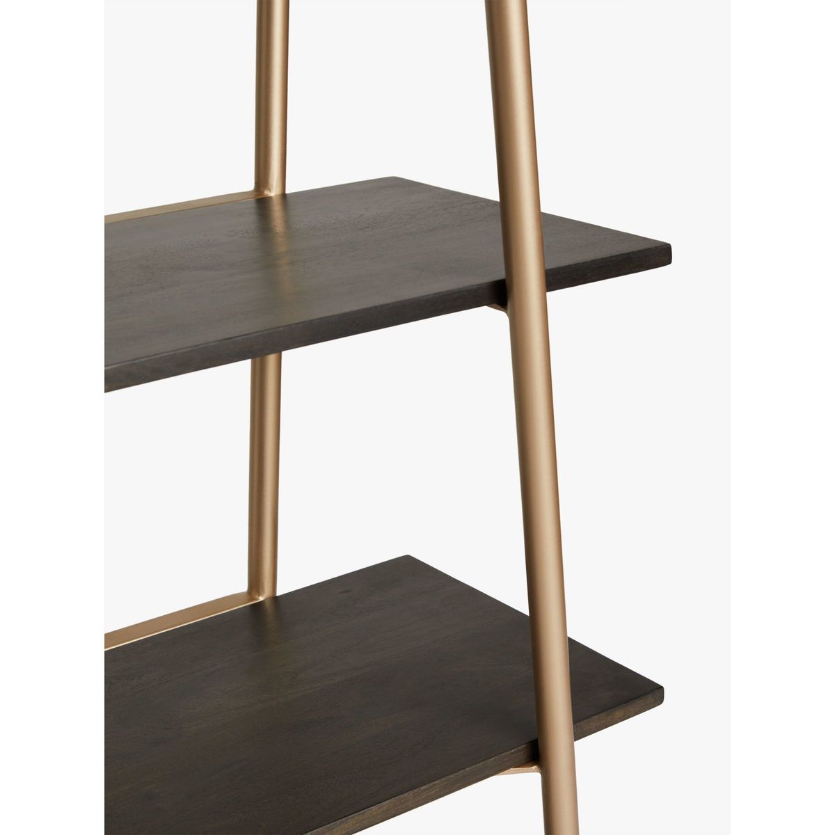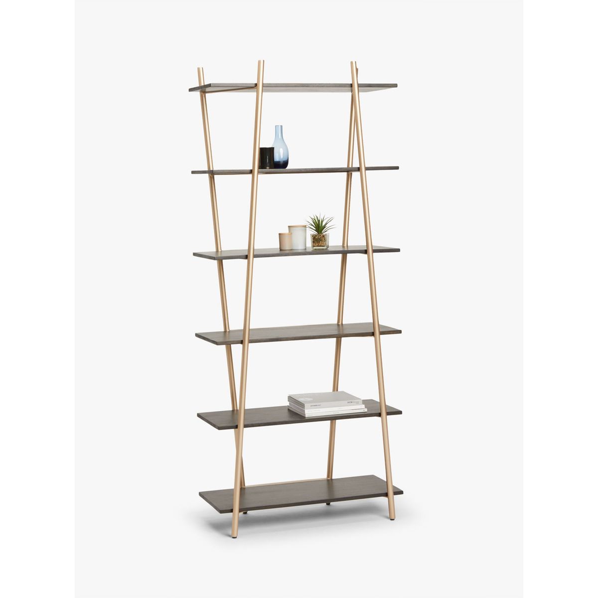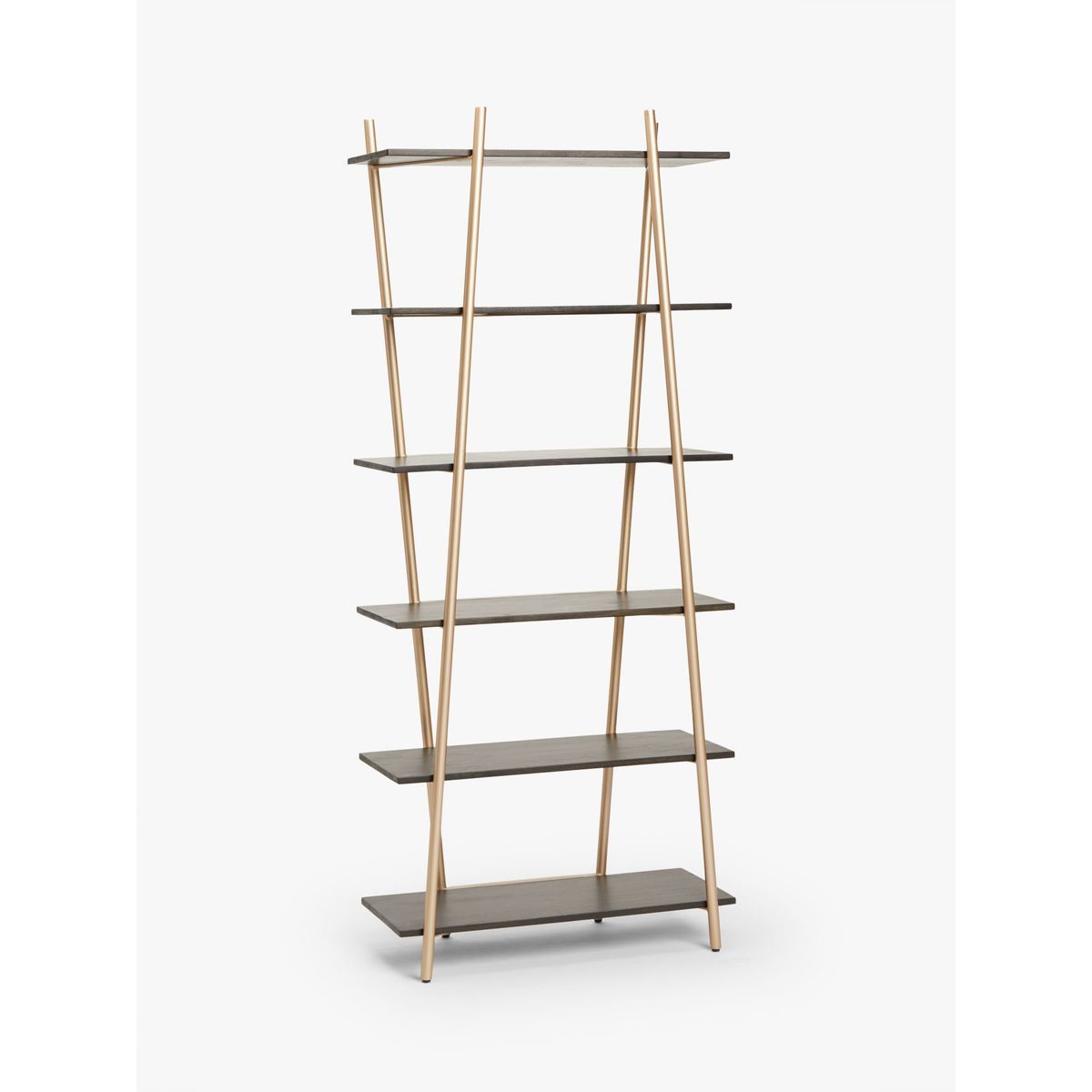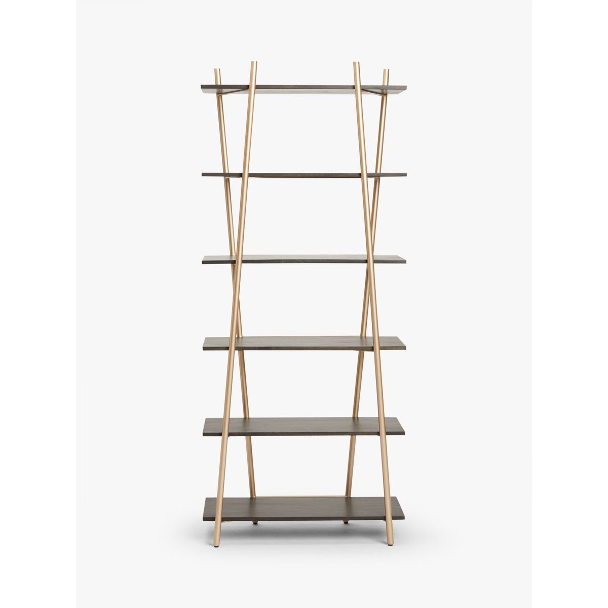 With a shared commitment to exceptional design and quality, we've collaborated to create an exclusive furniture collection for the modern home. The Carson tall shelving unit is inspired by sleek Japanese interiors and designed with six shelves to display your best home accessories. Its minimalist frame is supported with four pearlescent-gold finished metal bars that are placed independently but designed to create the illusion that they crossover. They also serve as book ends for added practicality. Complete with solid wooden shelves, this functional and well-balanced storage unit is wall-mounted and ideal for alcoves.