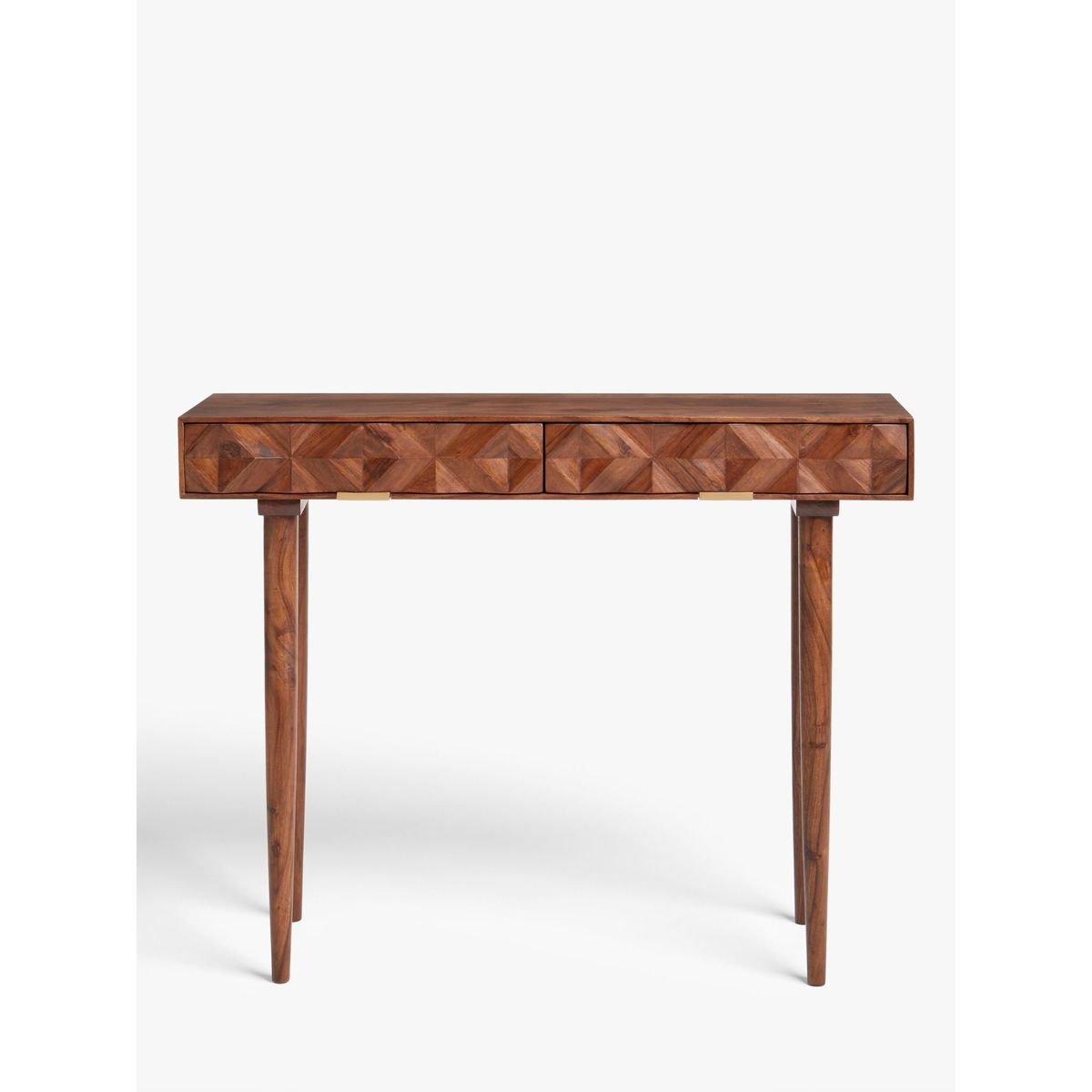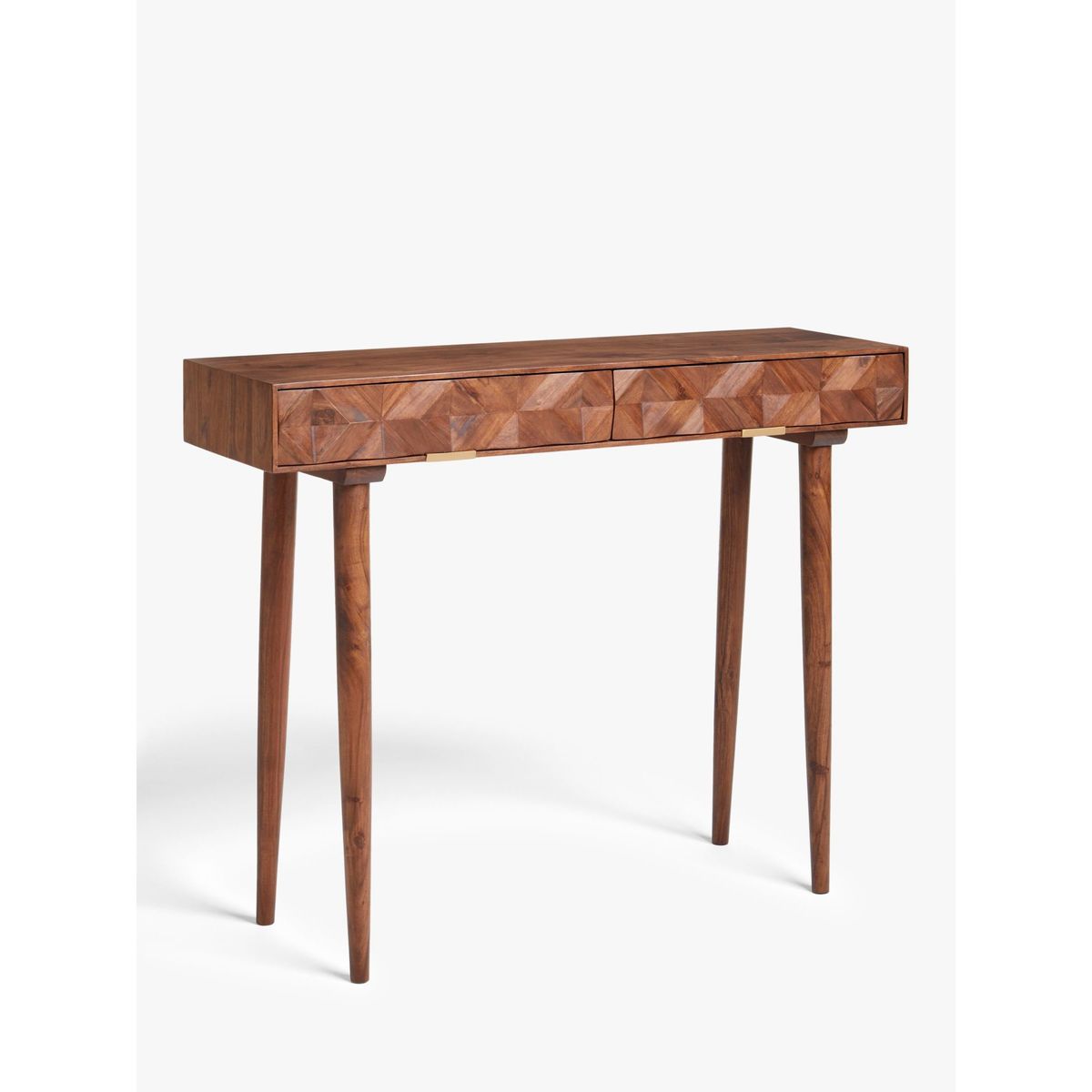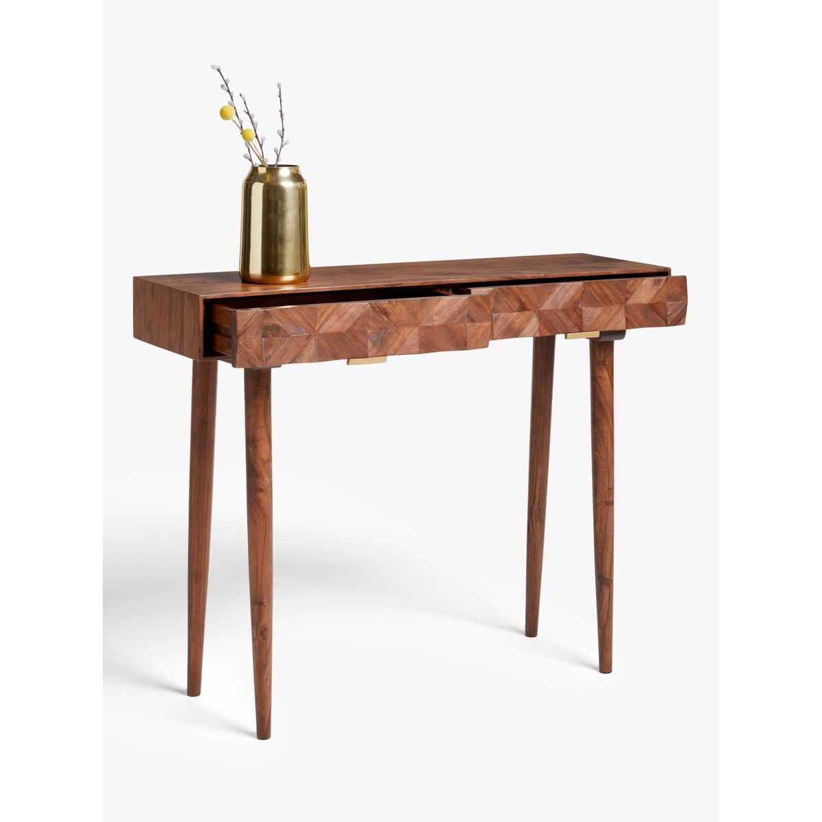 Designed by Swoon, made by us. With a shared commitment to exceptional design and quality, we've collaborated to create an exclusive furniture collection for the modern home. The Franklin console table uses marquetry techniques to create a tactile, geometric facade. Crafted from wood that's been cut at angles and then reassembled, it plays with light and shadows in a tessellated design that highlights the variety of its natural wood grains. Brass-finished contrasting metal handles open the two drawers, providing handy, concealed storage space underneath the table, in a design that's well proportioned for hallway use. Want to see it first? You may want to see and get a feel for the furniture in one of our shops before ordering. We'll be able to tell you where the range you'd like to view is on display.