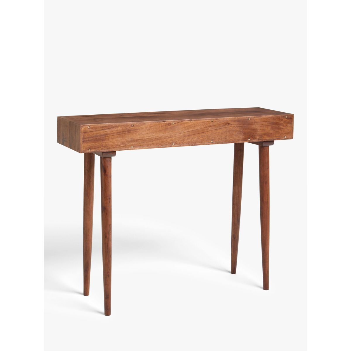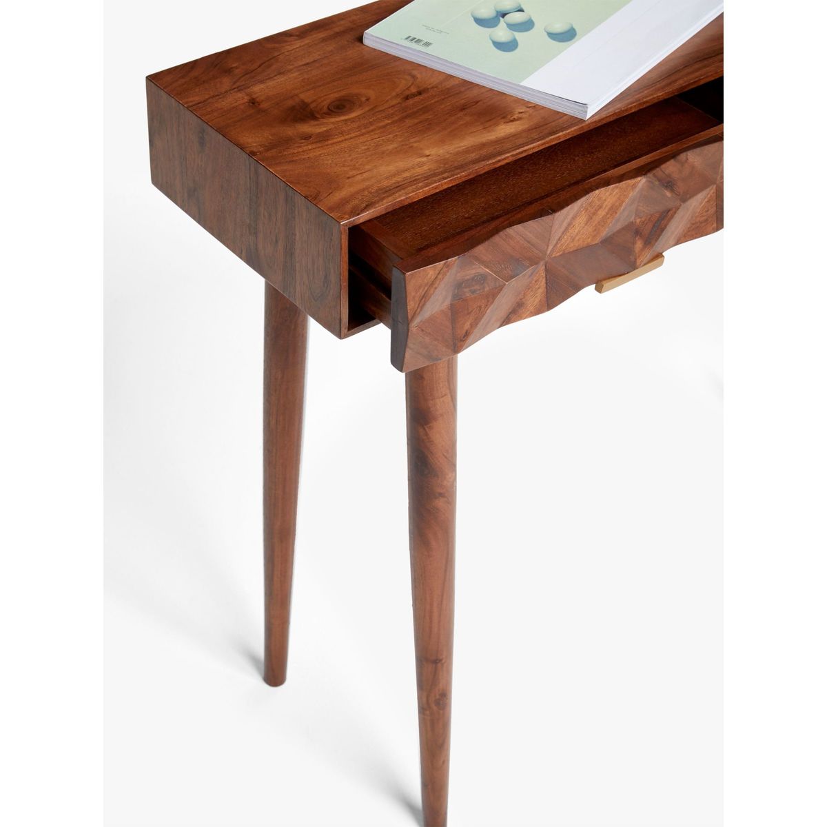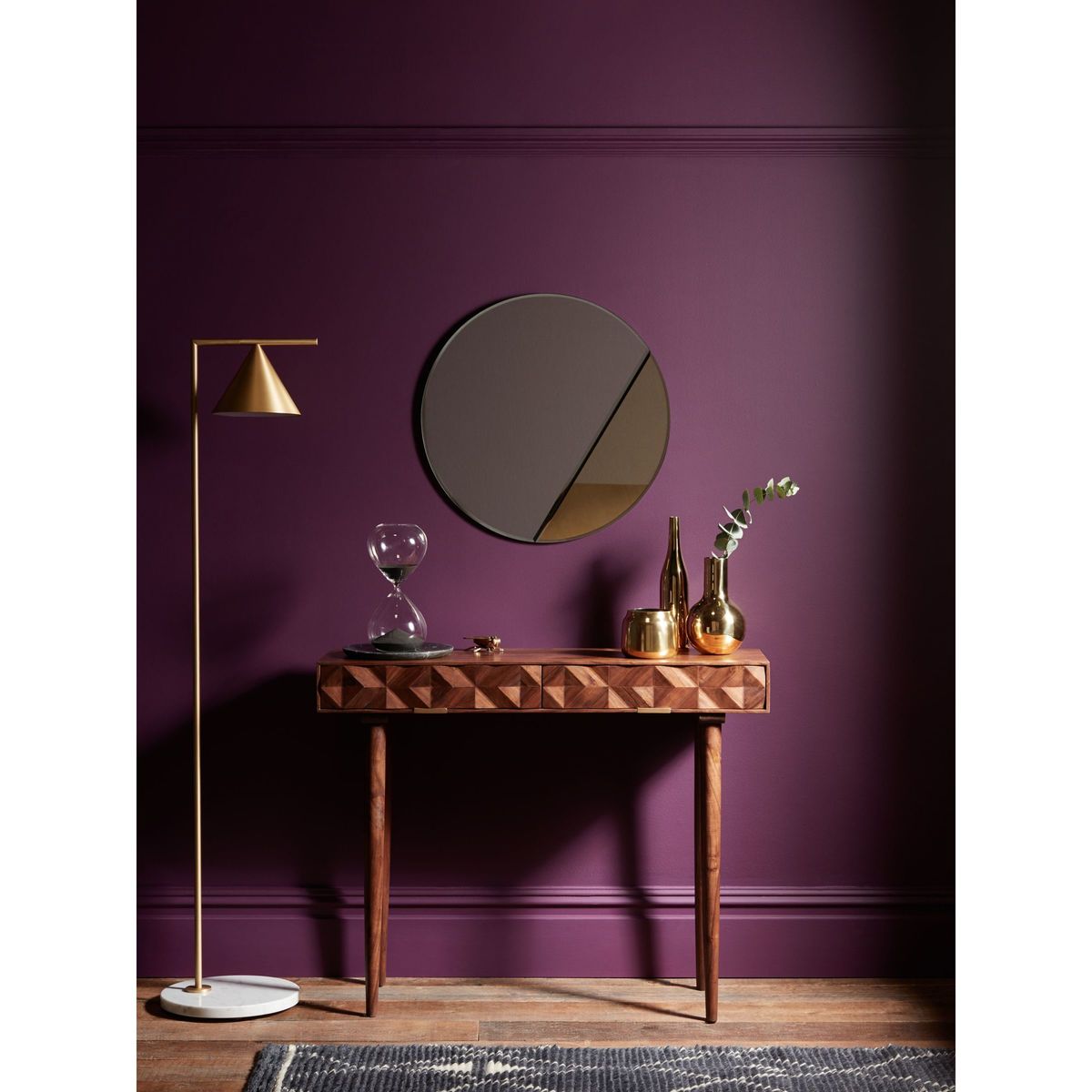 Designed by Swoon, made by us. With a shared commitment to exceptional design and quality, we've collaborated to create an exclusive furniture collection for the modern home. The Franklin console table uses marquetry techniques to create a tactile, geometric facade. Crafted from wood that's been cut at angles and then reassembled, it plays with light and shadows in a tessellated design that highlights the variety of its natural wood grains. Brass-finished contrasting metal handles open the two drawers, providing handy, concealed storage space underneath the table, in a design that's well proportioned for hallway use. Want to see it first? You may want to see and get a feel for the furniture in one of our shops before ordering. We'll be able to tell you where the range you'd like to view is on display.