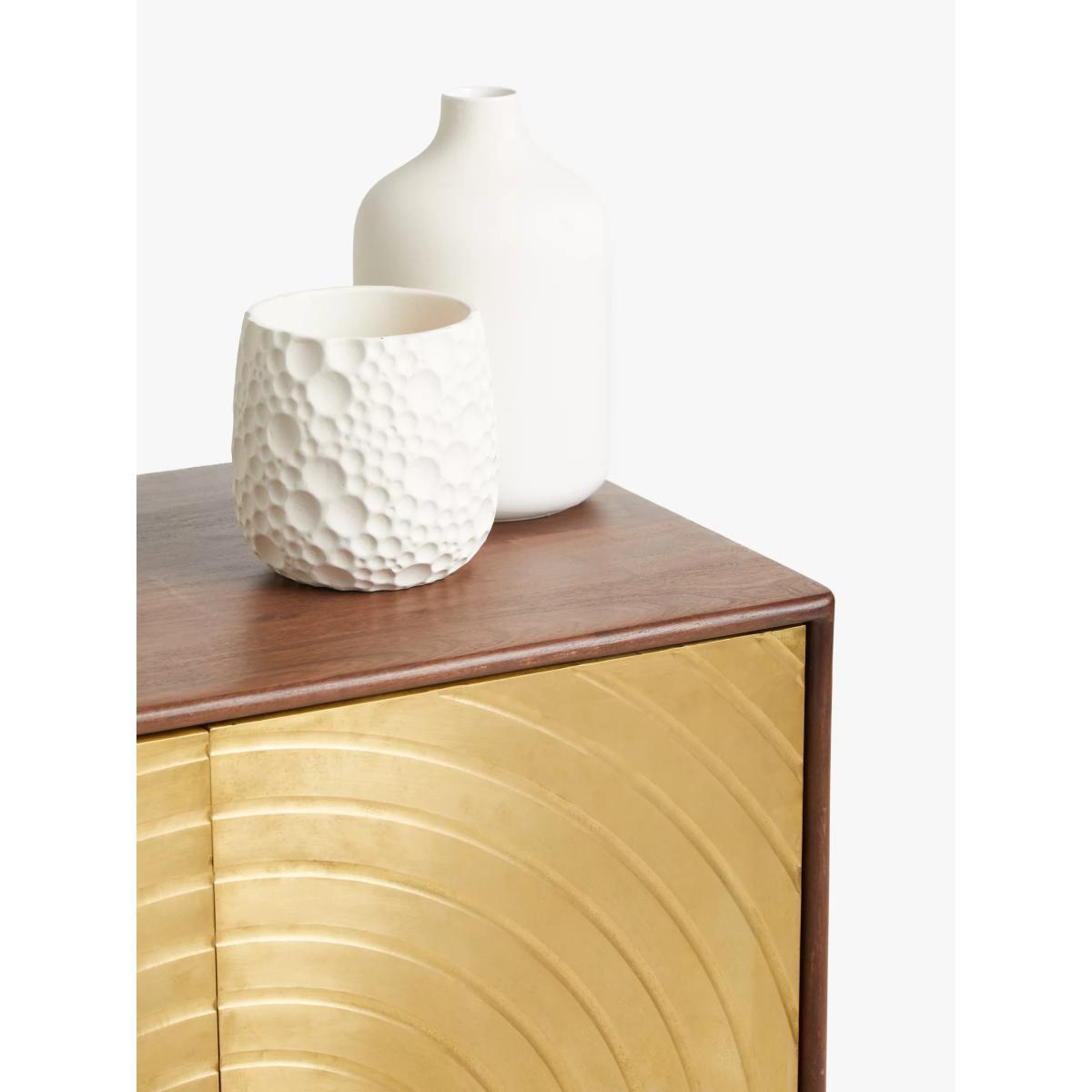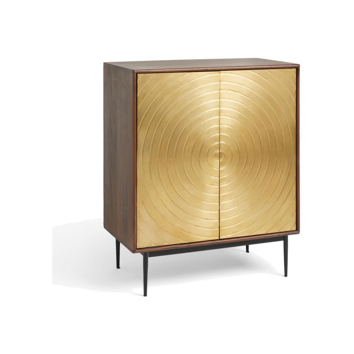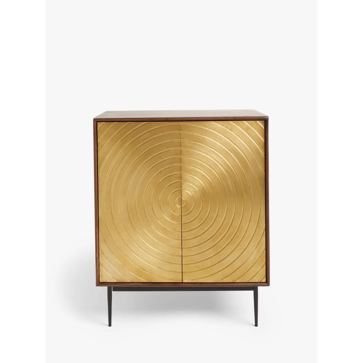 Designed by Swoon, made by us. With a shared commitment to exceptional design and quality, we've collaborated to create an exclusive furniture collection for the modern home. 'The spiral of life' is the creative concept behind this bold storage cabinet, which is made from acacia wood in a walnut finish with striking brass cladding on the doors. Its distinctive textured front and robust wood panels have been hand-crafted, assembled and rendered by dedicated artisans, which is visible in the cabinet's precise clean lines and delicate spindle-shaped legs. There's an adjustable shelf inside and its narrow shape means it can squeeze into even smaller rooms, where it will add an instant injection of luxe retro style and character to your space. Want to see it first? You may want to see and get a feel for the furniture in one of our shops before ordering. We'll be able to tell you where the range you'd like to view is on display.
