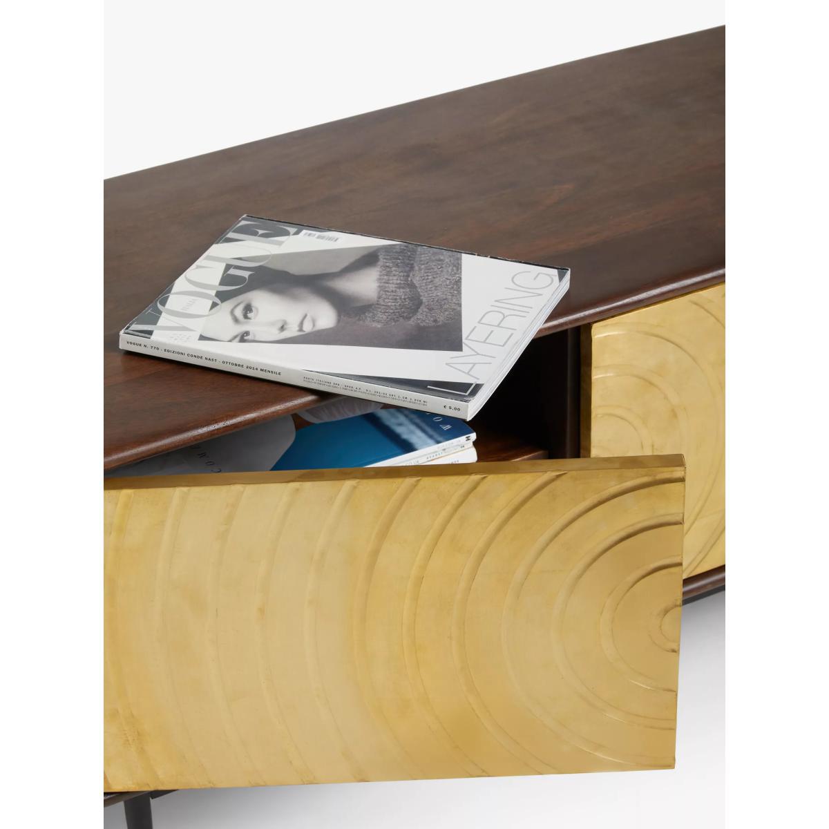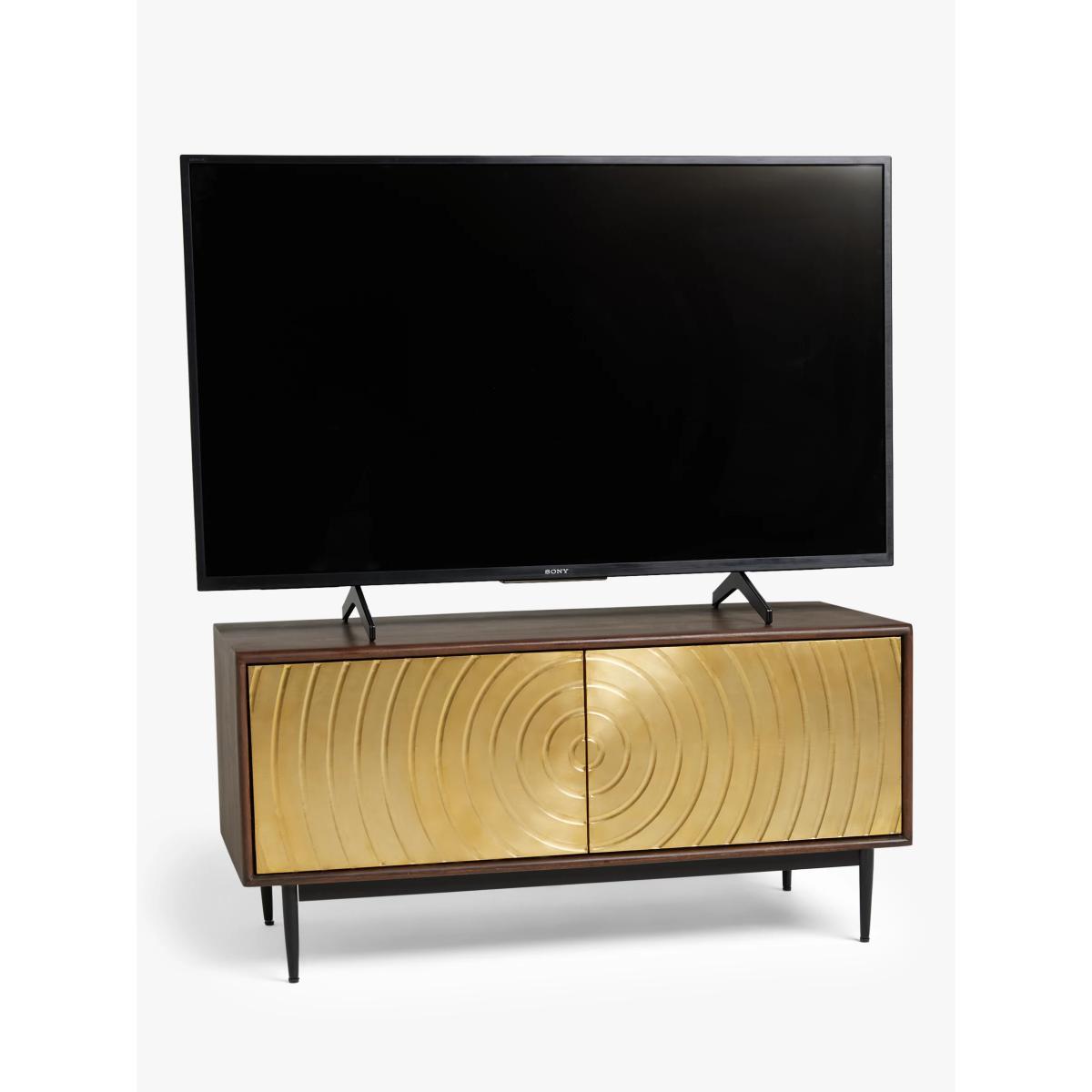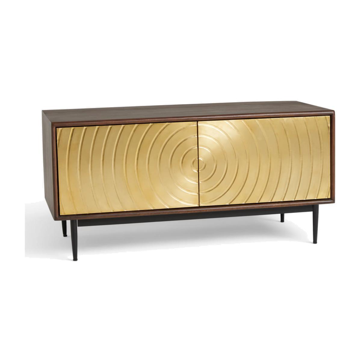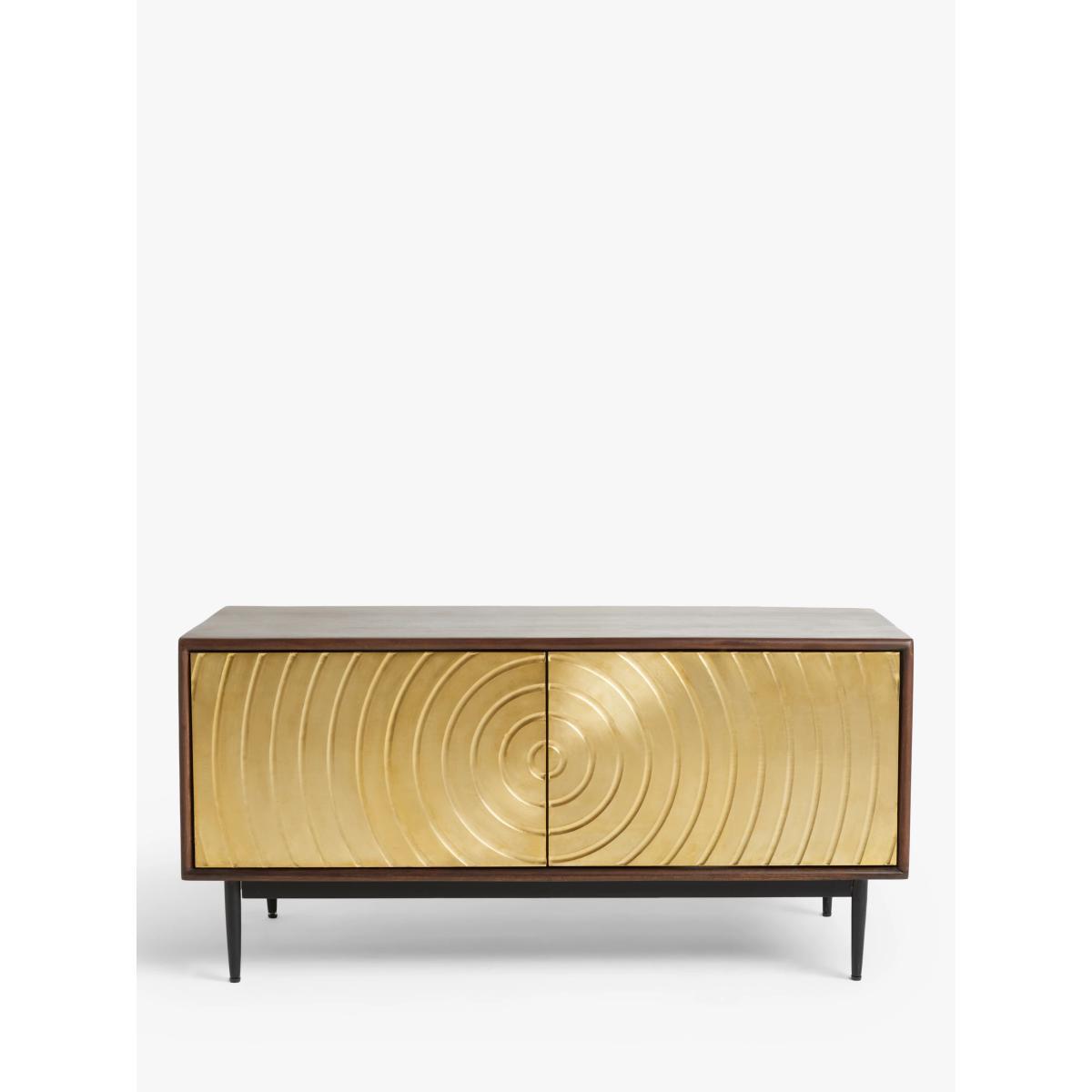 Designed by Swoon, made by us. With a shared commitment to exceptional design and quality, we've collaborated to create an exclusive furniture collection for the modern home. 'The spiral of life' is the creative concept behind this TV stand, which is made from acacia wood in a walnut finish with striking brass cladding on the doors. Its distinctive textured front and robust wood panels have been hand-crafted, assembled and rendered by dedicated artisans, which is visible in its precise clean lines and delicate spindle-shaped legs. There's an adjustable shelf inside and its narrow shape means it can squeeze into even smaller rooms, where it will add an instant injection of luxe retro style and character to your space. Want to see it first? You may want to see and get a feel for the furniture in one of our shops before ordering. We'll be able to tell you where the range you'd like to view is on display.