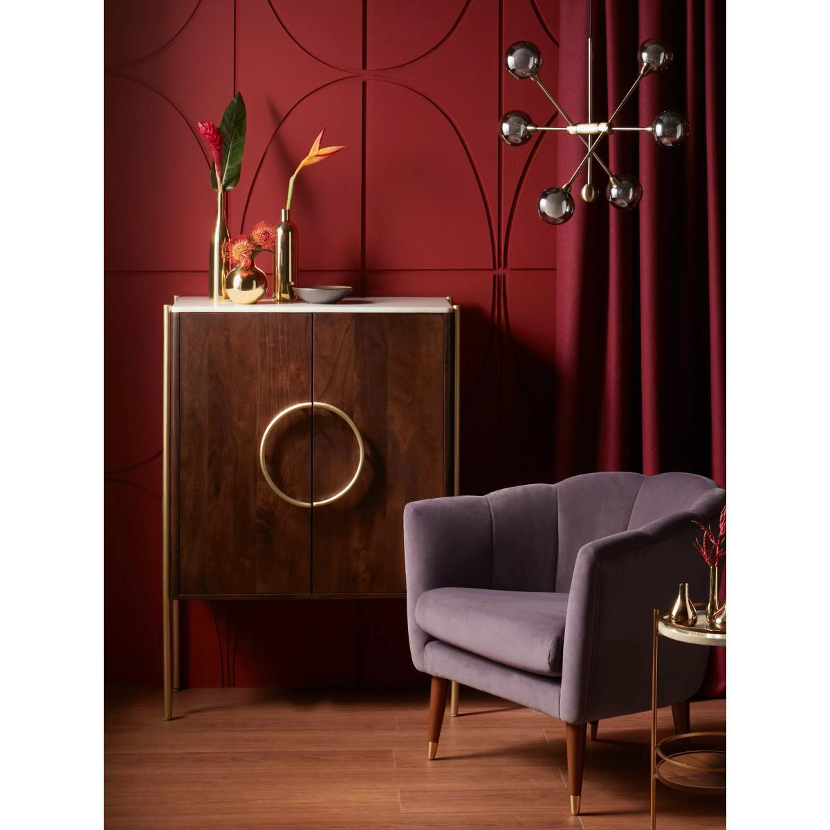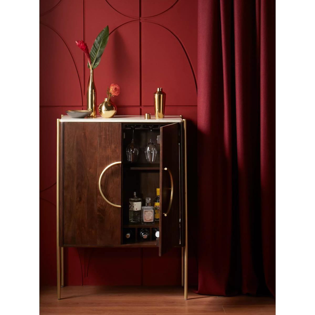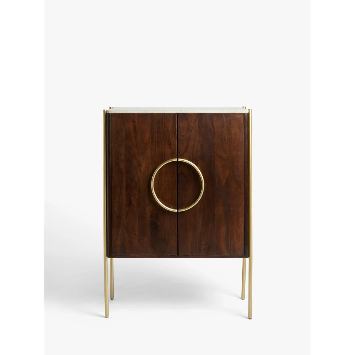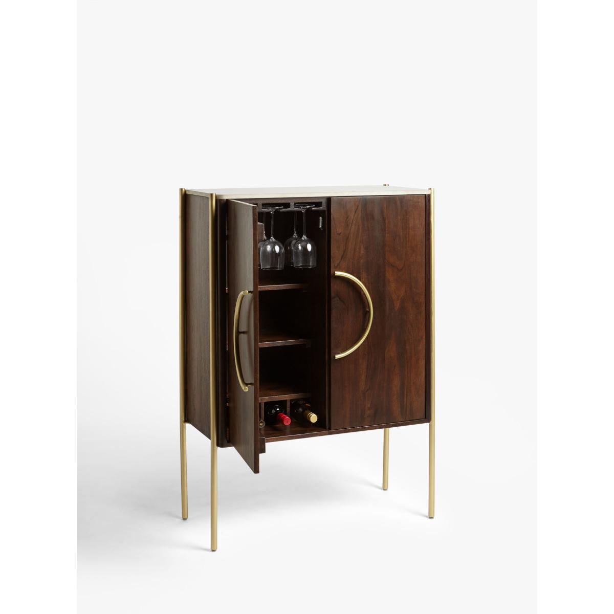 Designed by Swoon, made by us. With a shared commitment to exceptional design and quality, we've collaborated to create an exclusive furniture collection for the modern home. The Raine drinks cabinet showcases the opulence of mixed materials, in a functional, Deco-inspired design. The warm-toned wooden body is accented with brass-toned, pillar-shaped metal legs and a natural marble surface top that has a milled finish to protect the cabinet from spillages. Providing a practical storage space, it opens with sleek, semi-circle handles to reveal an organised interior, complete with wine glass holders, bottle compartments and three fixed shelves. Playing with textures, tones and geometry, this striking sideboard will make an impact in your living space. Want to see it first? You may want to see and get a feel for the furniture in one of our shops before ordering. We'll be able to tell you where the range you'd like to view is on display.