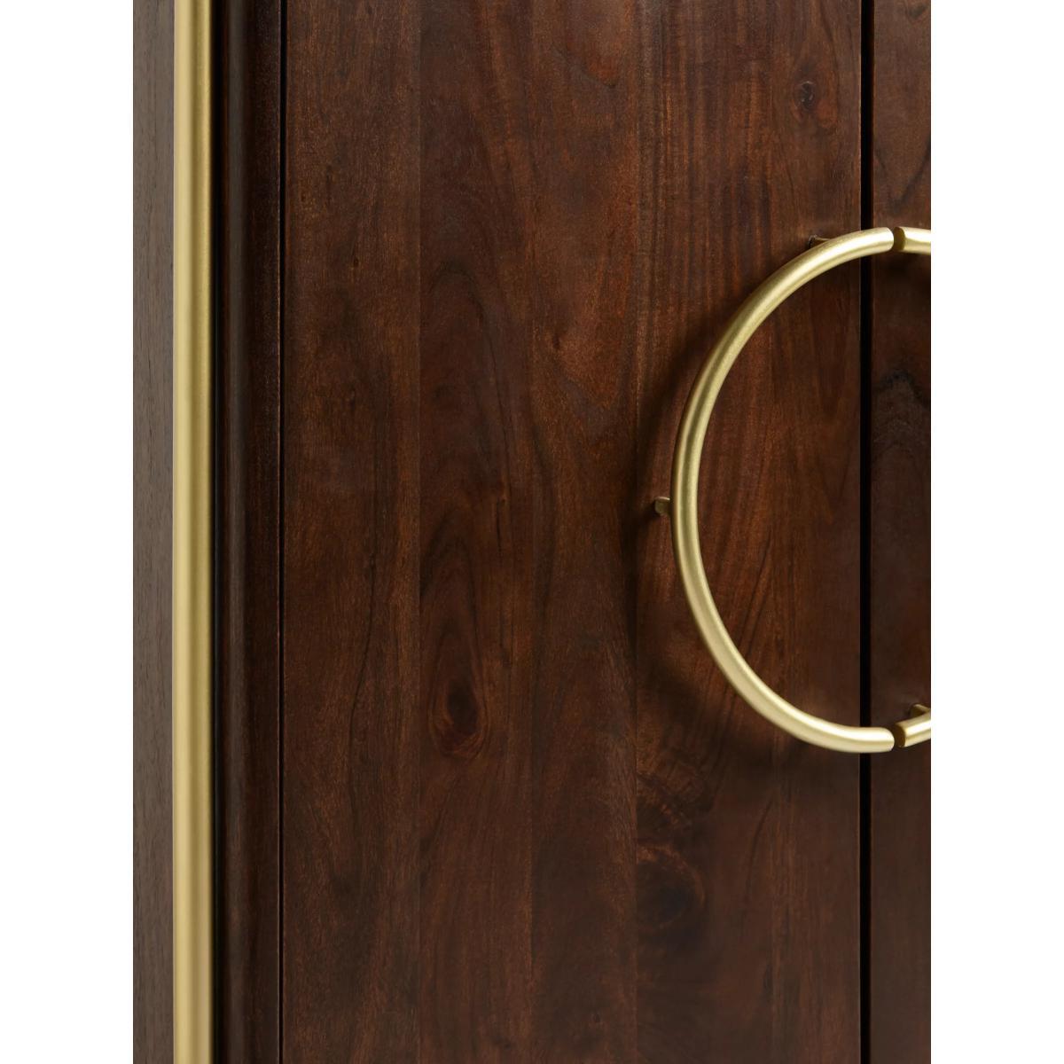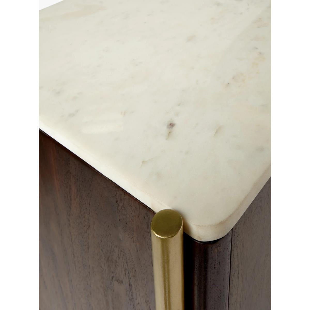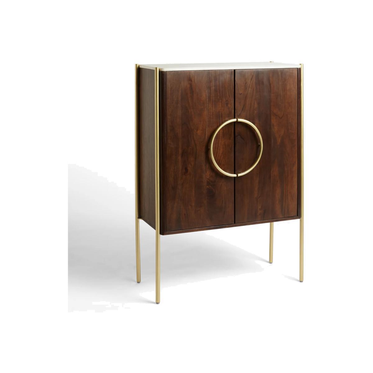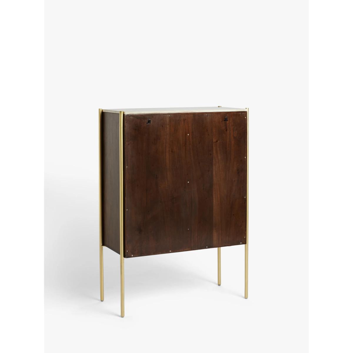 Designed by Swoon, made by us. With a shared commitment to exceptional design and quality, we've collaborated to create an exclusive furniture collection for the modern home. The Raine drinks cabinet showcases the opulence of mixed materials, in a functional, Deco-inspired design. The warm-toned wooden body is accented with brass-toned, pillar-shaped metal legs and a natural marble surface top that has a milled finish to protect the cabinet from spillages. Providing a practical storage space, it opens with sleek, semi-circle handles to reveal an organised interior, complete with wine glass holders, bottle compartments and three fixed shelves. Playing with textures, tones and geometry, this striking sideboard will make an impact in your living space. Want to see it first? You may want to see and get a feel for the furniture in one of our shops before ordering. We'll be able to tell you where the range you'd like to view is on display.
