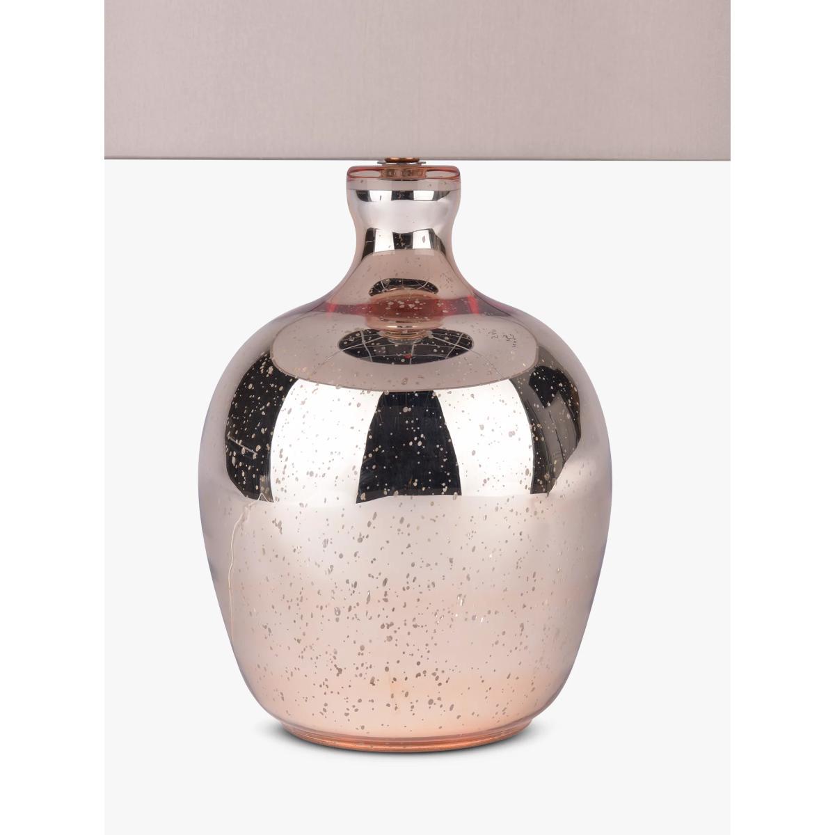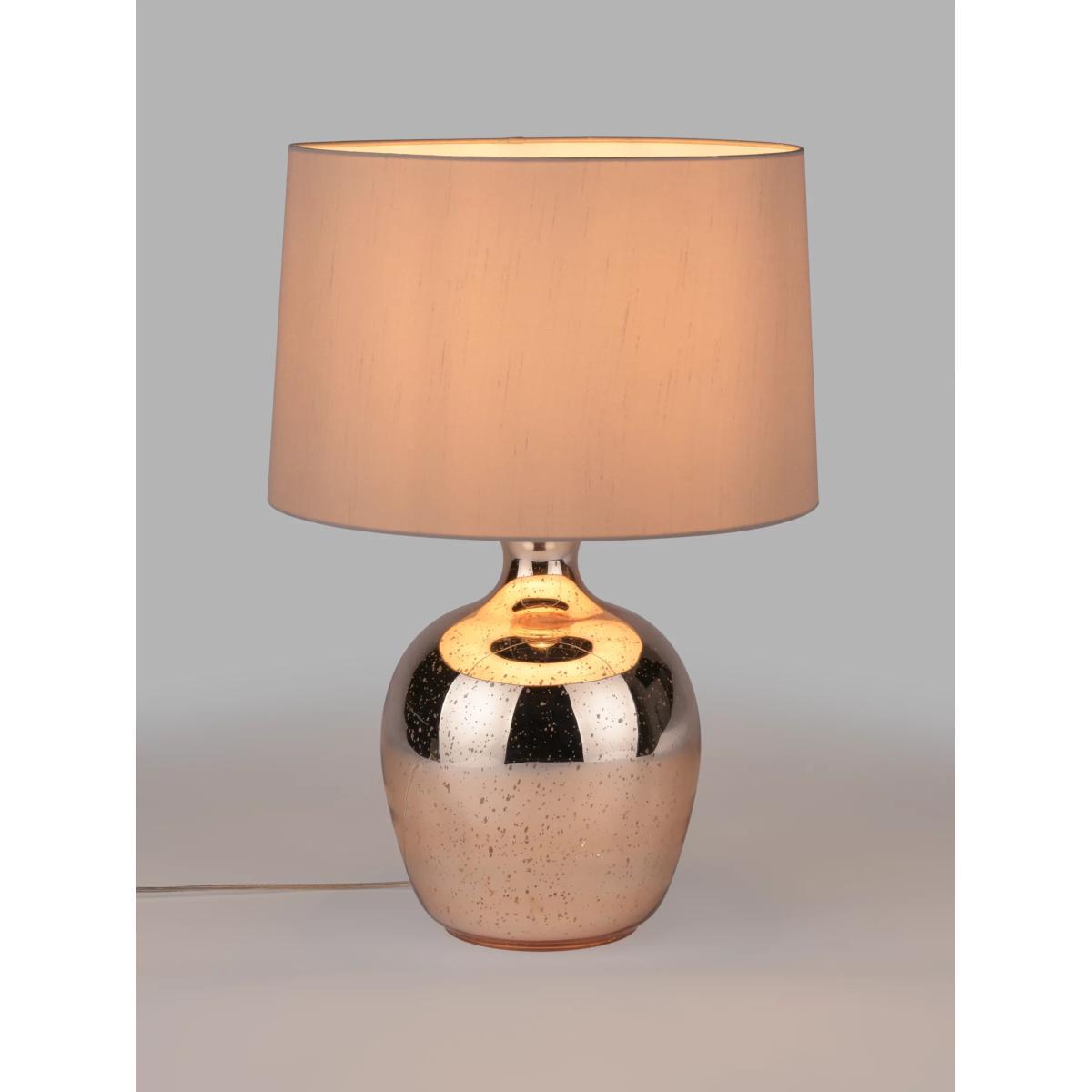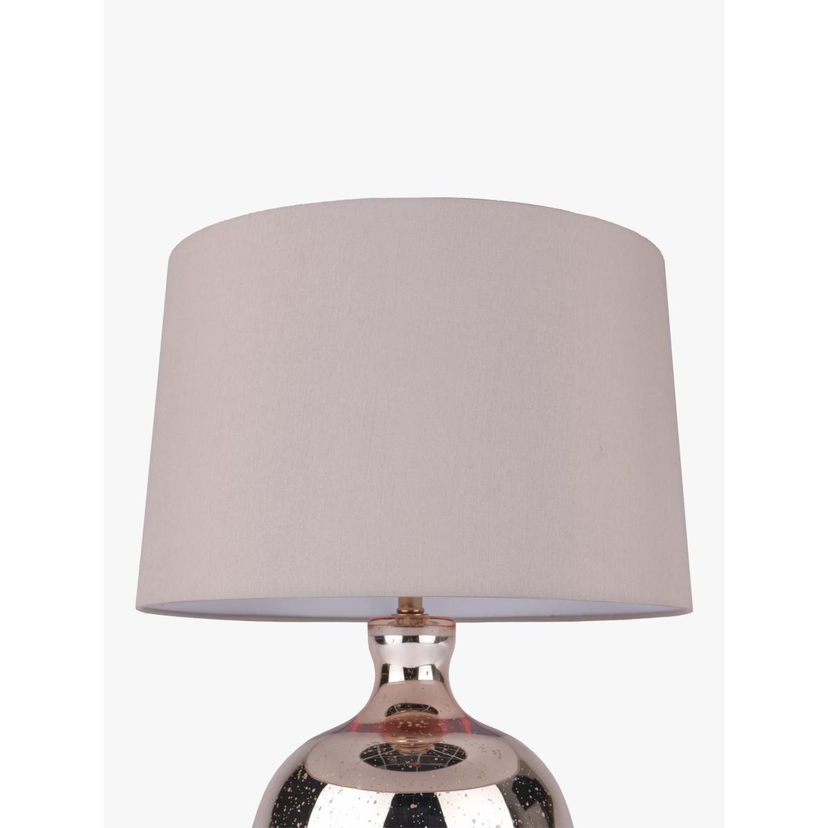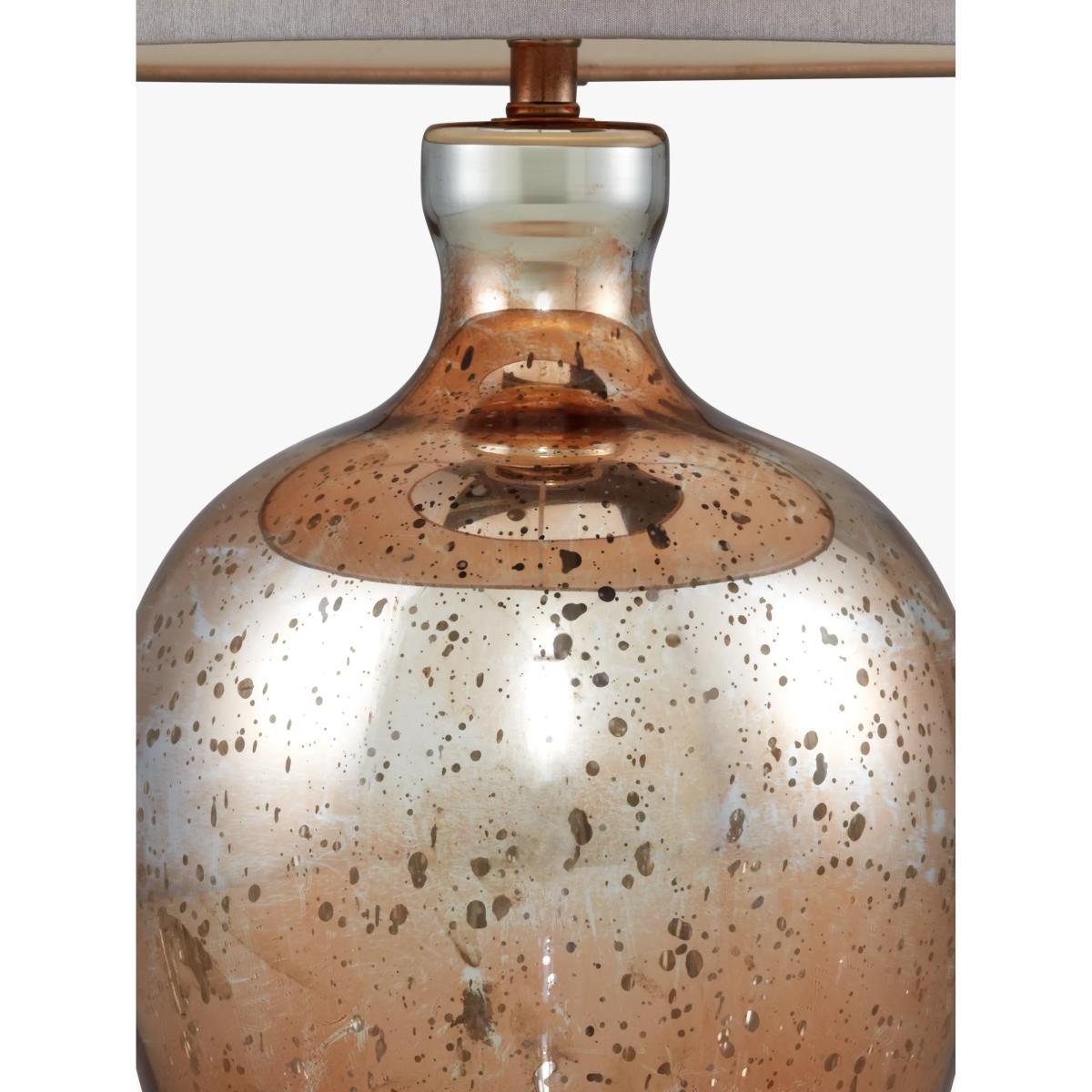 The mercurised finish on the base of this copper coloured glass lamp gives it a slightly weathered look. The faux silk shade has a slight taper, and is finished with a neutral hue to give this piece versatility.