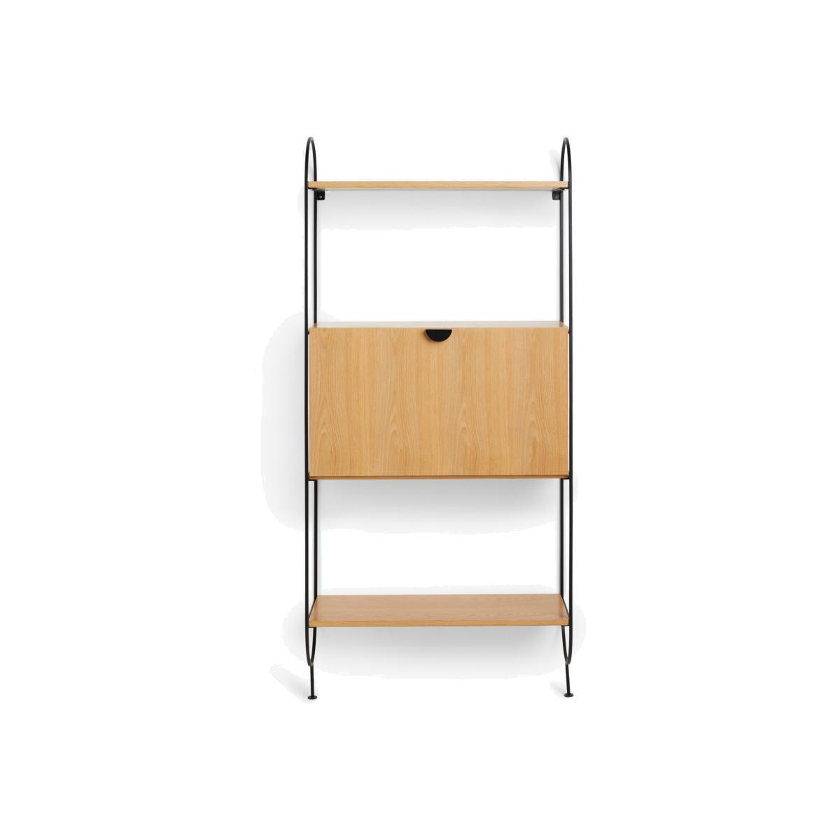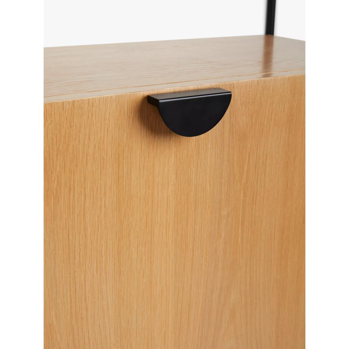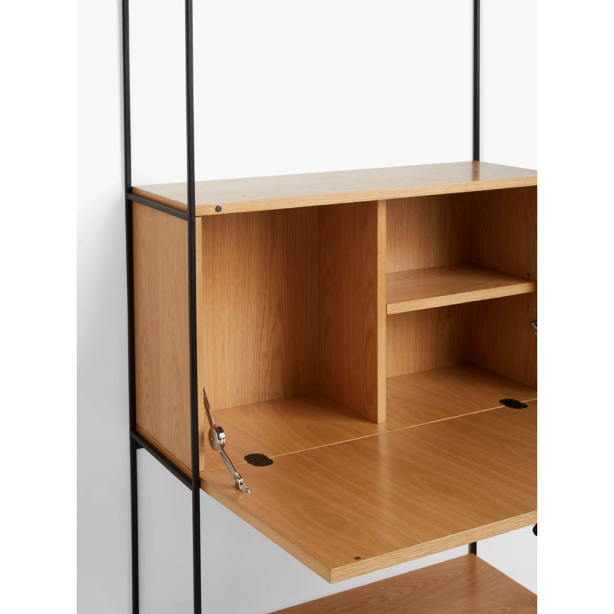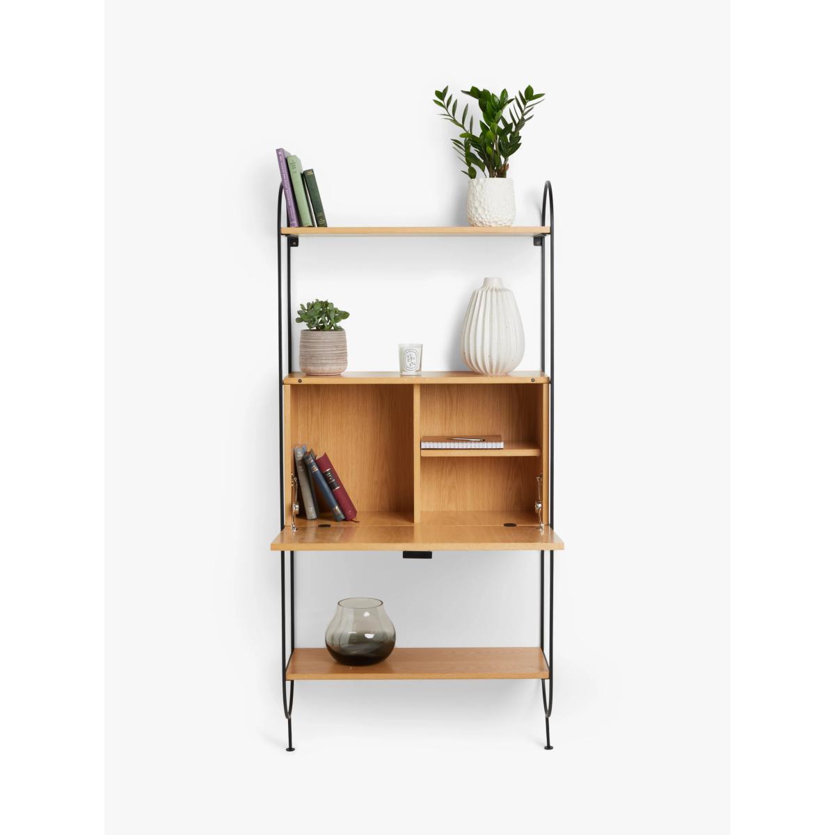 With a clever design that incorporates storage, shelving and a desk space, this compact wall-mounted unit is useful in smaller rooms. It's made from a combination of robust oak veneers and MDF, supported by a minimalist metal frame to keep the design light and un-imposing. The central storage section opens to a reveal a divided-up space, great for documents and books, and there's a desk surface to work from. There's also a shelf at the top and bottom of the unit, so decorate it with ornaments and accessories to make your work space more inviting. For a modern take on a traditional bureau, this is a brilliant option if you find yourself working more often from home. Want to see it first? You may want to see and get a feel for the furniture in one of our shops before ordering. We'll be able to tell you where the range you'd like to view is on display.