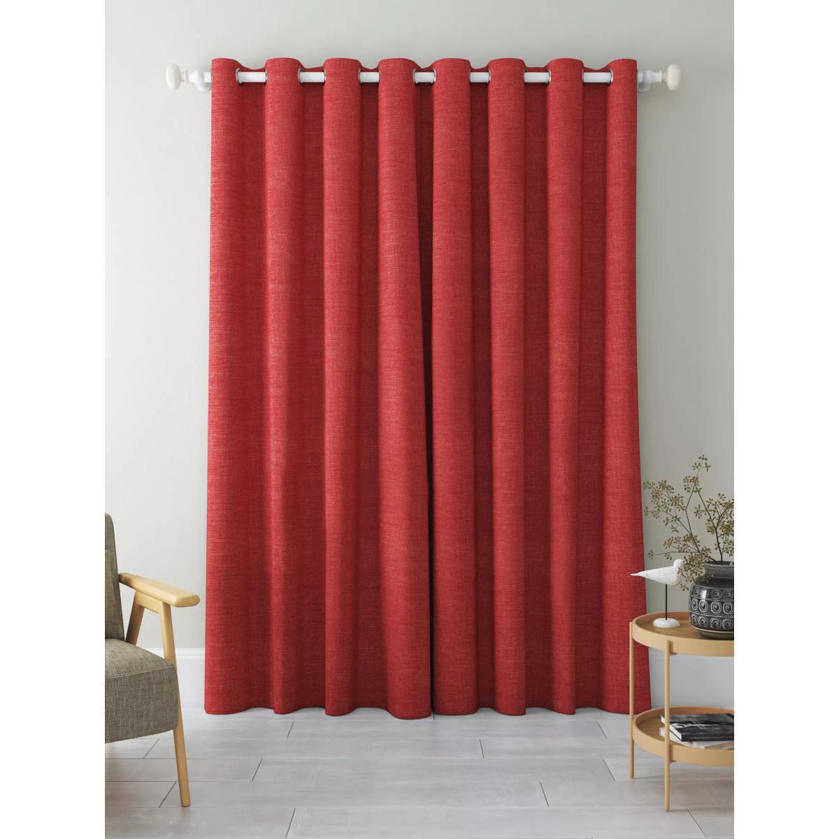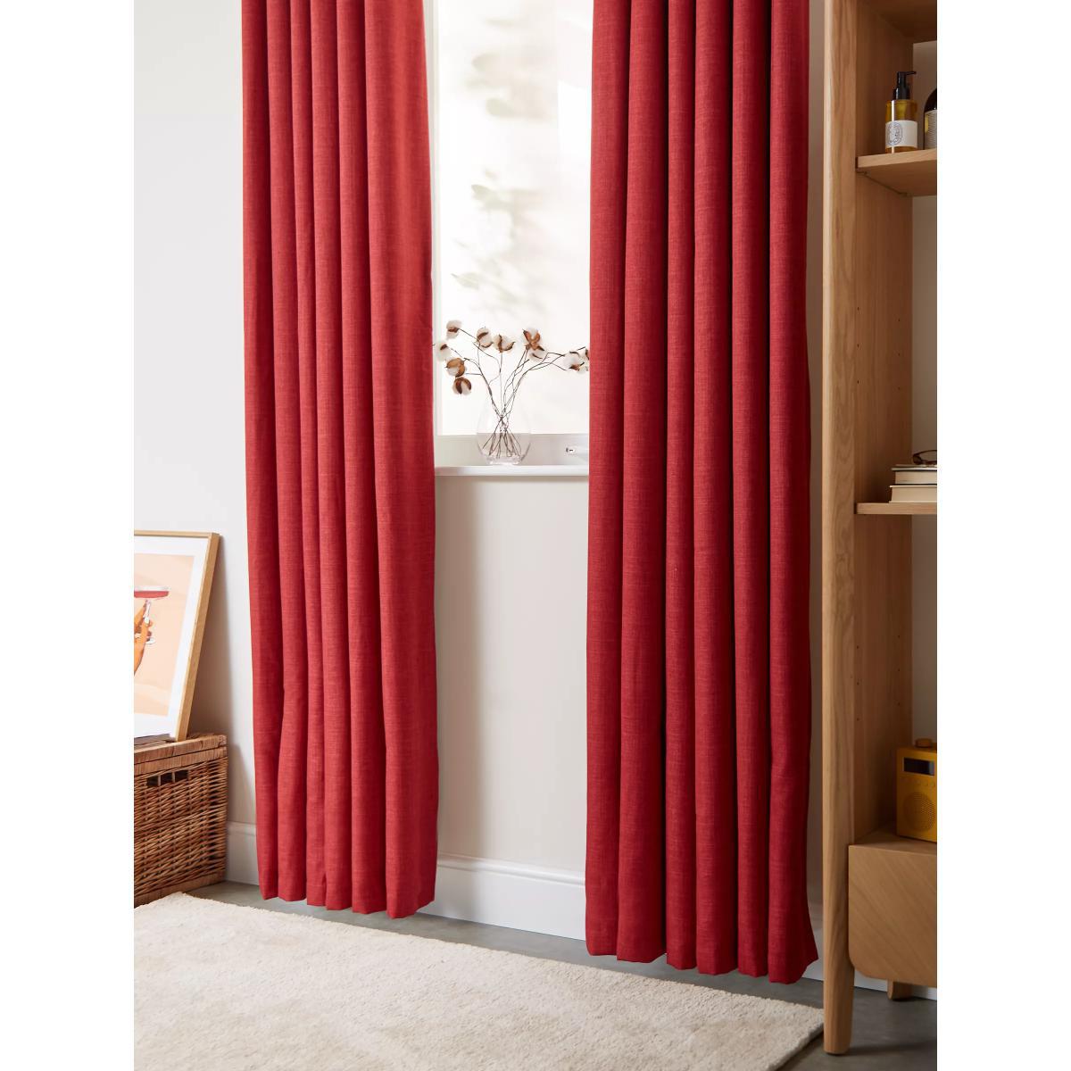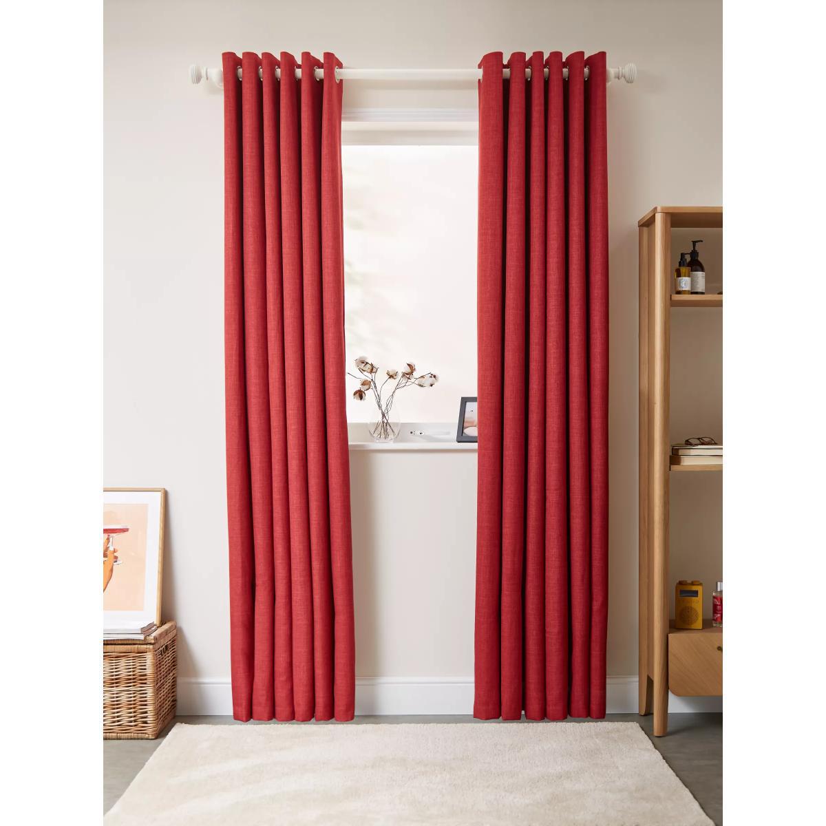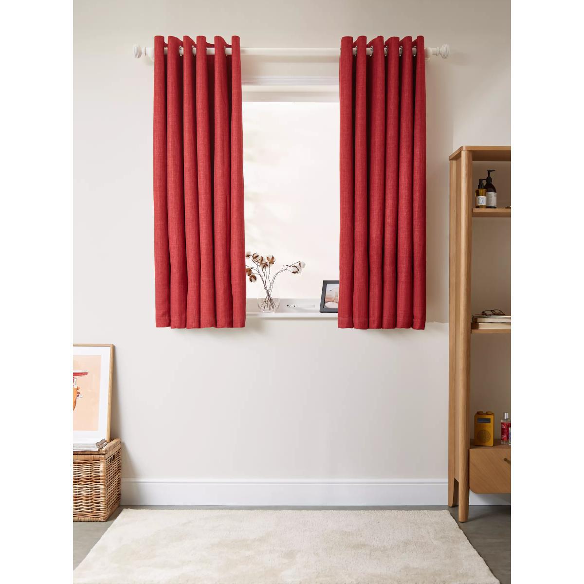 These curtains are plain-coloured with a textured weave that makes them an easy go-to option. The eyelet heading gives them a more contemporary look with large, even folds and the blackout lining both eliminates light and lends a full look to the curtains, improving the drape and enhancing the vibrancy of the pattern. Warm in winter, cool in summer As the blackout lining on these curtains blocks out sunlight they help keep your room cool as well as dark. This lining also adds an extra layer of insulation to the curtains, giving them the added benefit of being thermal. They protect against both heat loss and heat gain, regulating the temperature of your room so you're kept warm in winter and cool in summer. The width stated indicates the size of one curtain panel when laid completely flat. This pack contains two panels and the track/pole length we've recommended allows for the two panels to be gathered when the curtains are drawn. For a fuller look, increase the curtain width. One pair of 117cm width curtains will fit a curtain track/pole size 117-167cm One pair of 167cm width curtains will fit a curtain track/pole size 133-167cm One pair of 228cm width curtains will fit a curtain track/pole size 182-228cm Worth knowing... We package our curtains in recycled materials to keep them protected whilst they make their way to you. This means that when they arrive there could be some creases in them. We recommend you hang them for a few days to allow them to flatten and for the creases to fall out. If after this period your curtains still show signs of being folded then follow the ironing instructions on the back of the packaging. Be aware that each style of curtain has different ironing instructions, including heat limitations according to the fabric, so do make sure you follow the guidance provided to get the best results. Do you need a curtain pole and accessories? Shop them here.