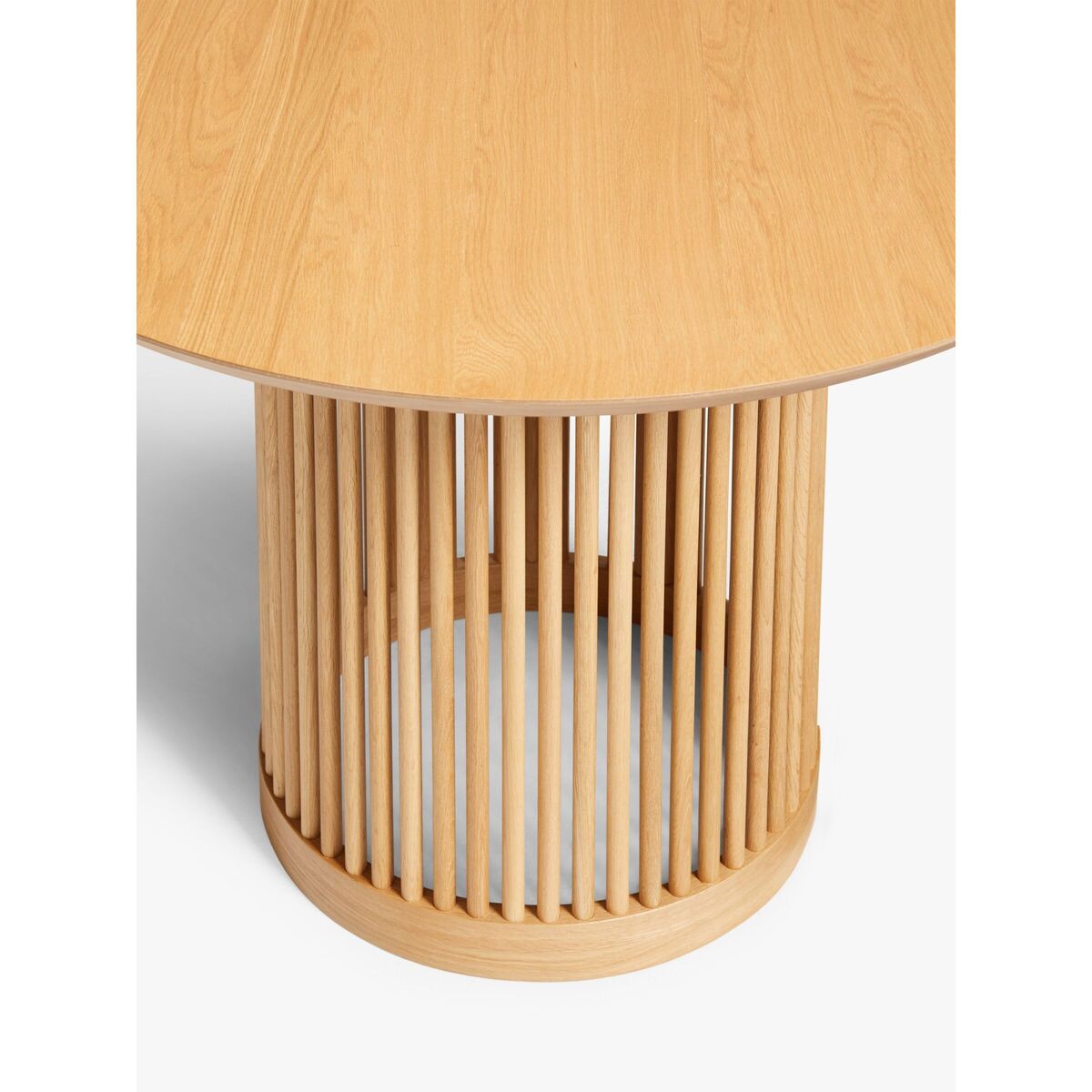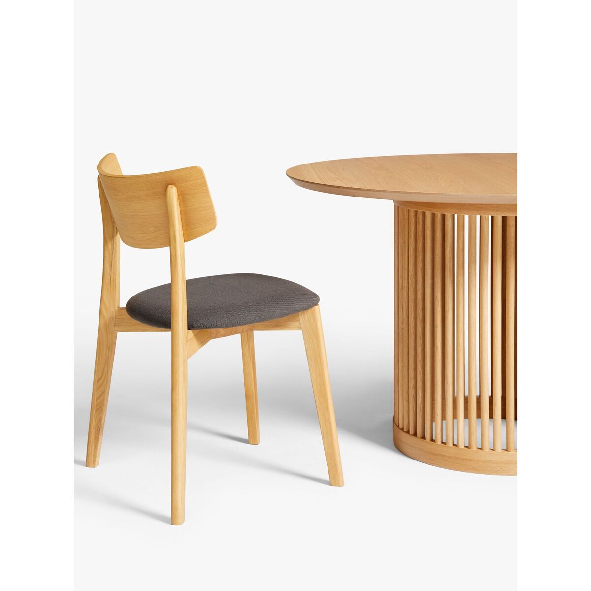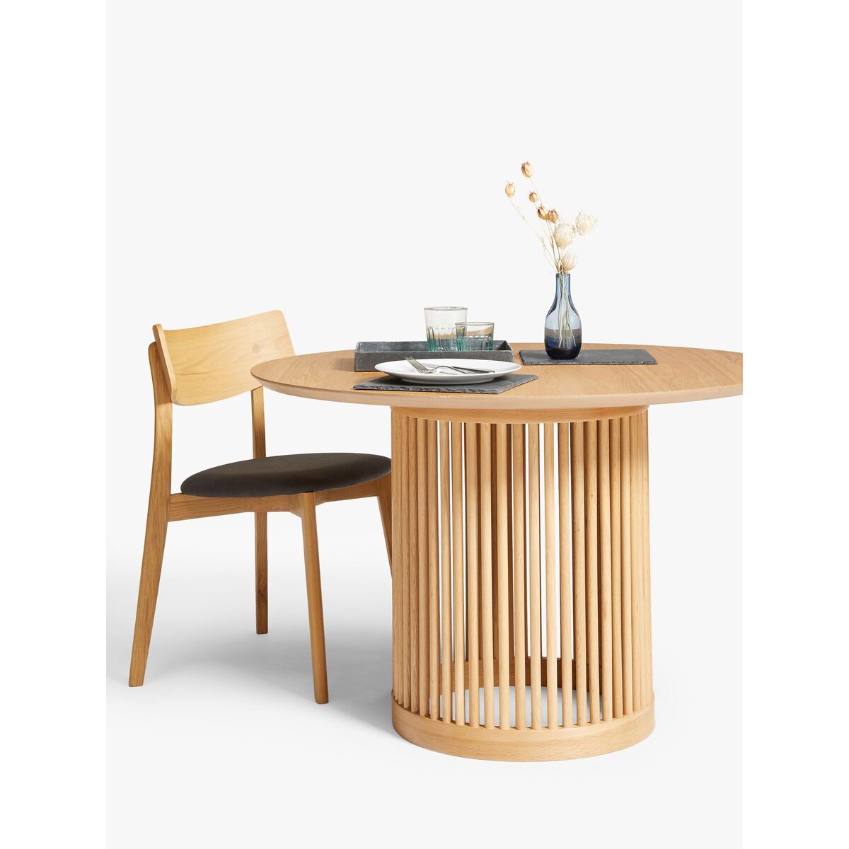Our Design Studio focused on smooth, curved shapes to maximise the contemporary style of your space. We've made this round dining table from solid oak and oak veneers for a reassuringly sturdy and hard-wearing finish. The central, pedestal base is made with spindle rods, giving the table a tactile edge and adding a sense of light. Plus, a protective lacquered coating highlights the natural colours and tones of the wood. It's designed to accommodate four seats, but a clever reconfigure allows you to add up to two extra seats. Want to see it first? You may want to see and get a feel for the furniture in one of our shops before ordering. We'll be able to tell you where the range you'd like to view is on display.