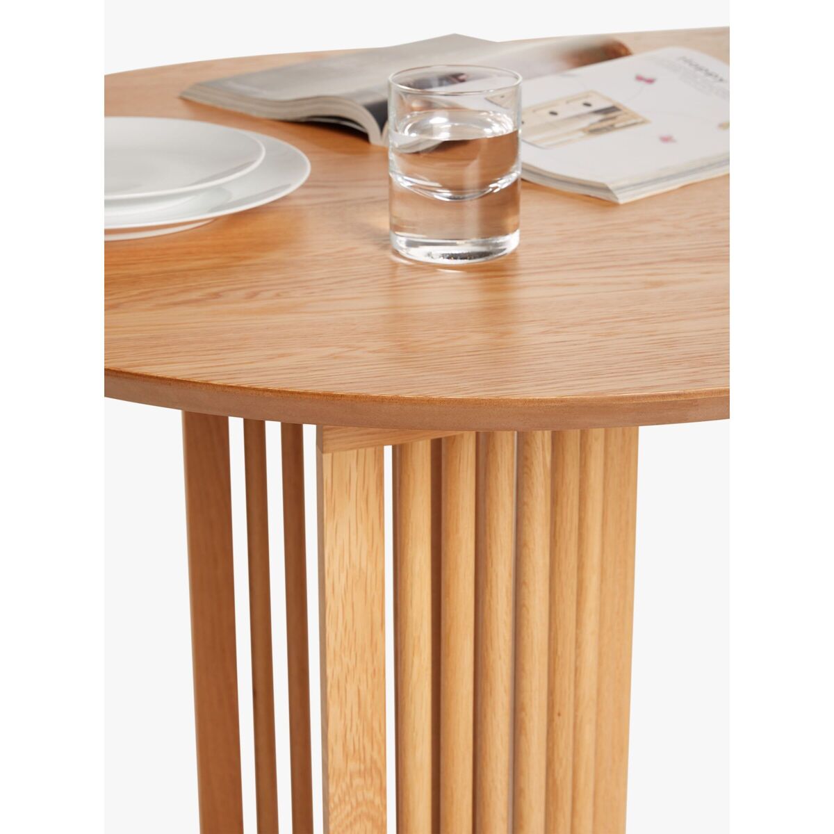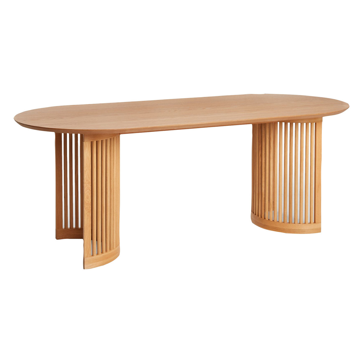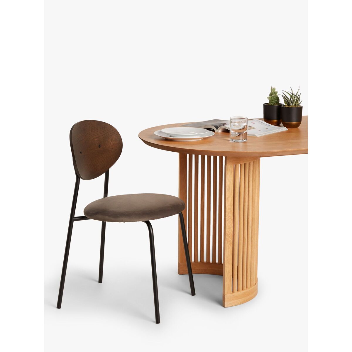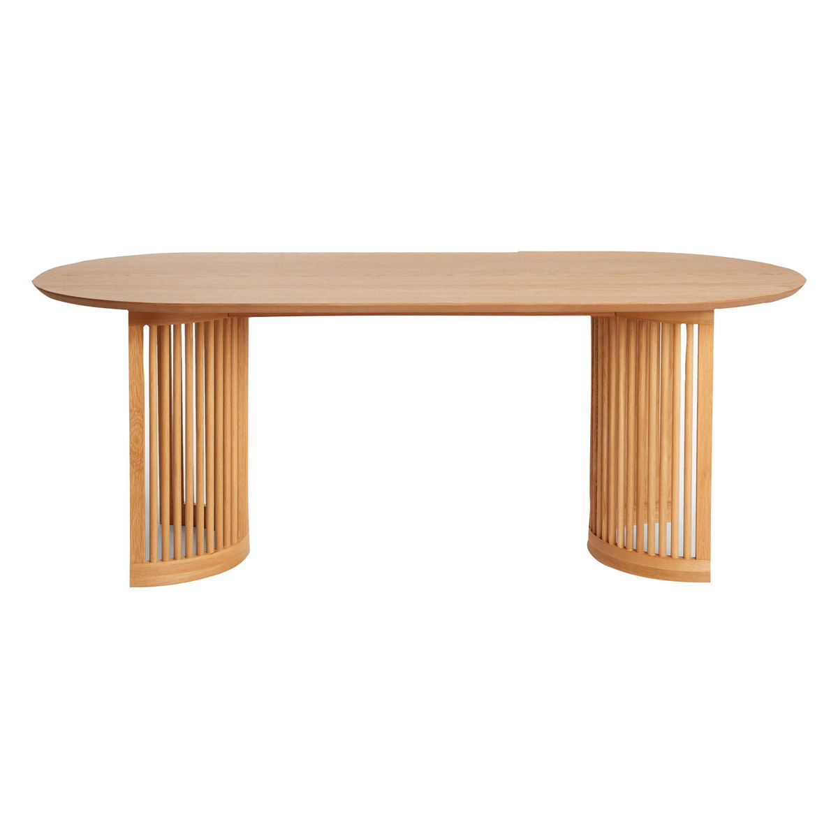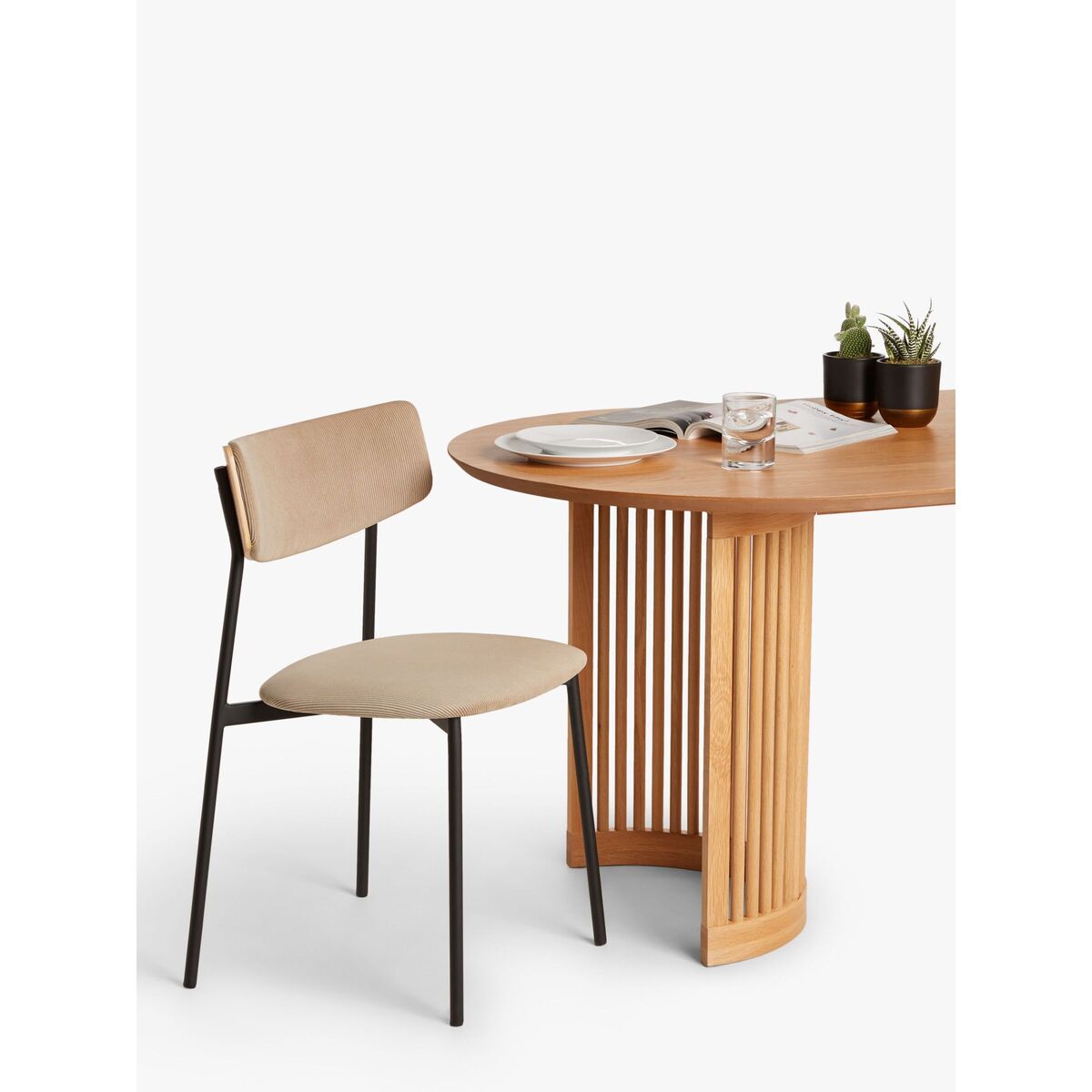 Our Design Studio focused on smooth, curved shapes to maximise the contemporary style of your space. We've made this dining table from solid oak and oak veneers for a reassuringly sturdy and hard-wearing finish. Spindle rods in a semi-circle shape form the pedestal base, giving the table a retro appeal, while adding a sense of light. Plus, a protective lacquered coating highlights the natural colours and tones of the wood. It's designed to accommodate six seats, but a clever reconfigure allows you to add up to two extra seats. Want to see it first? You may want to see and get a feel for the furniture in one of our shops before ordering. We'll be able to tell you where the range you'd like to view is on display.