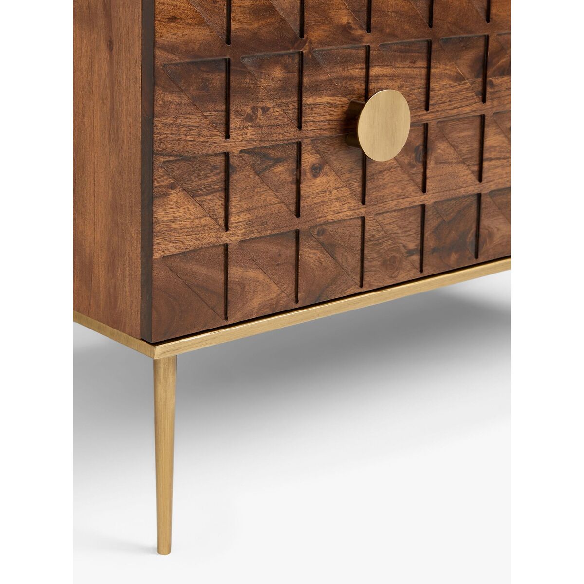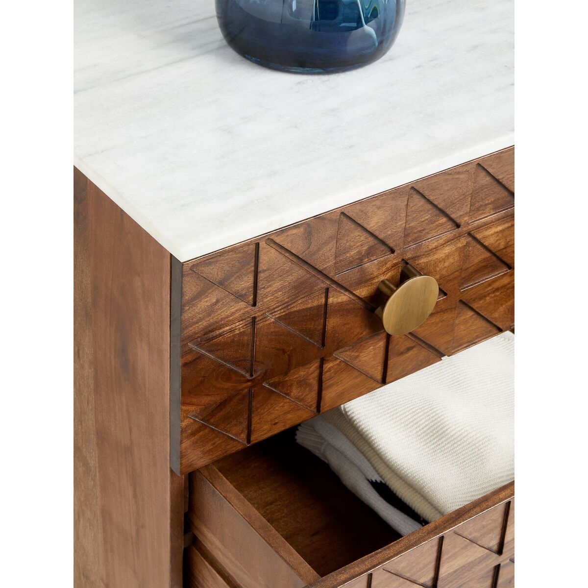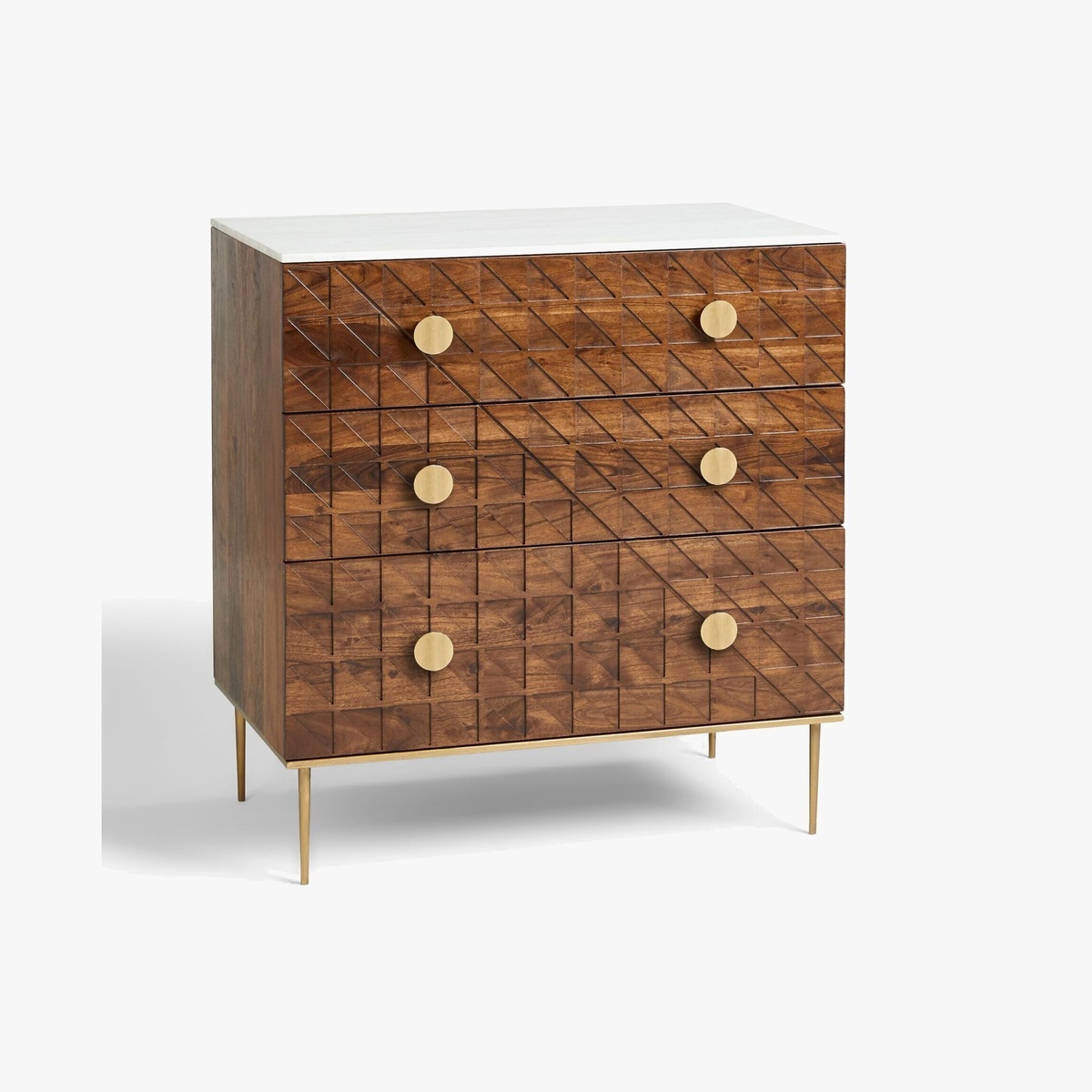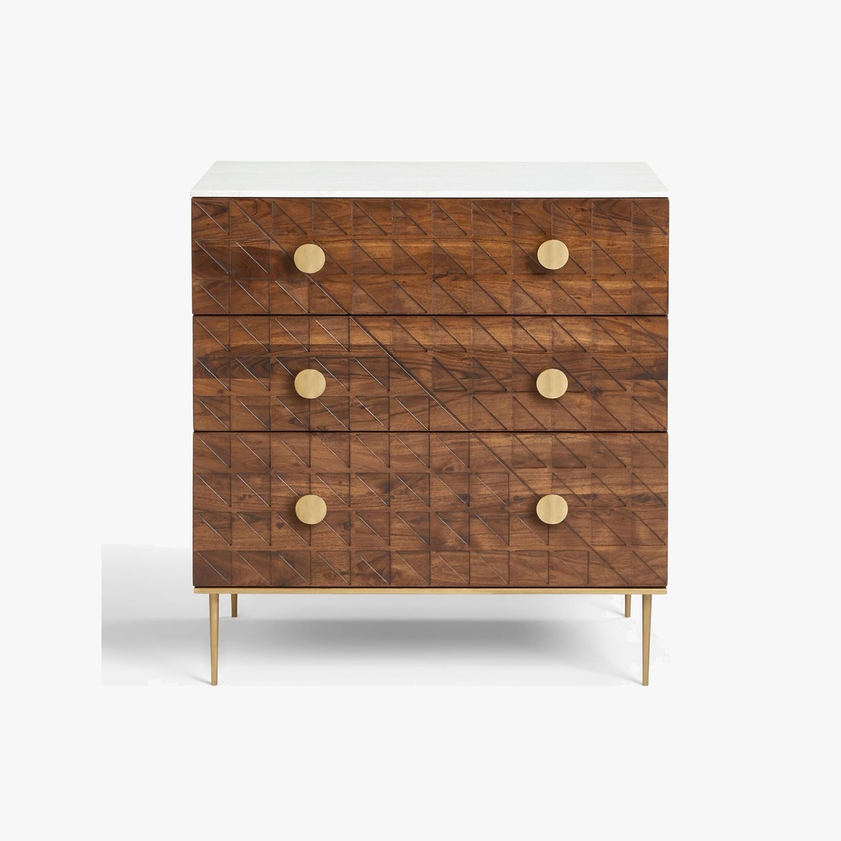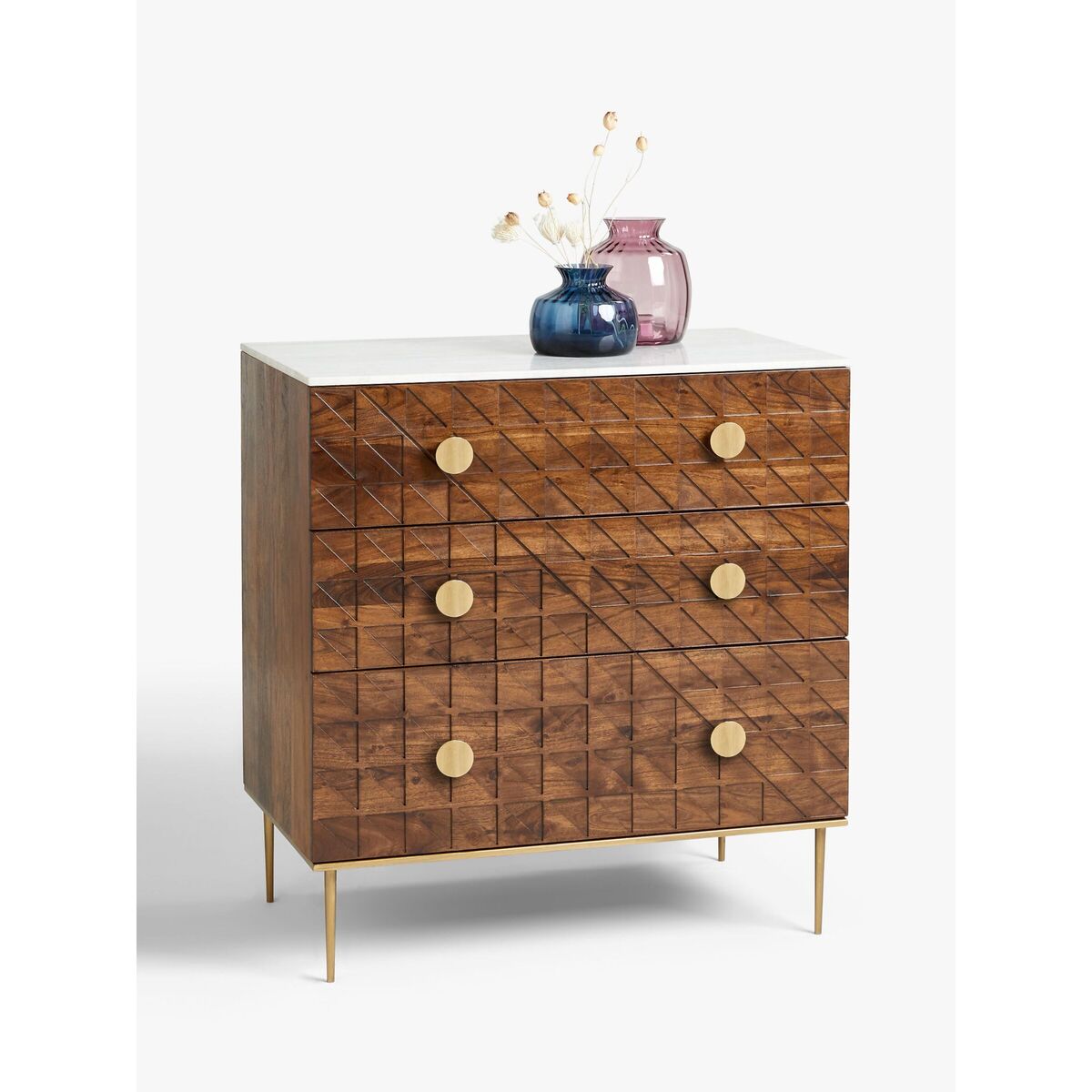 Functional furniture with a luxe look. Using shapes and styles that characterised the Art-Deco movement, we've designed this chest of drawers to give your bedroom the statement look it's been missing. Durable, dark acacia wood is combined with metallic metal work, shown on the semi-circle drawer handles and sleek, tapered legs. Each of the three drawer fronts are cut with a tessellated pattern to create a geometric look, and the thick, natural marble surface top lends a cool, neutral contrast. Want to see it first? You may want to see and get a feel for the furniture in one of our shops before ordering. We'll be able to tell you where the range you'd like to view is on display.