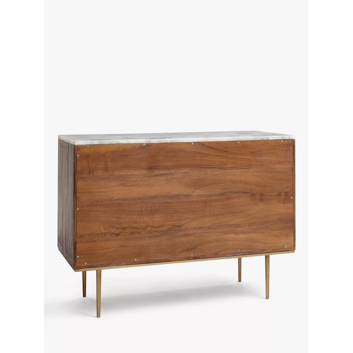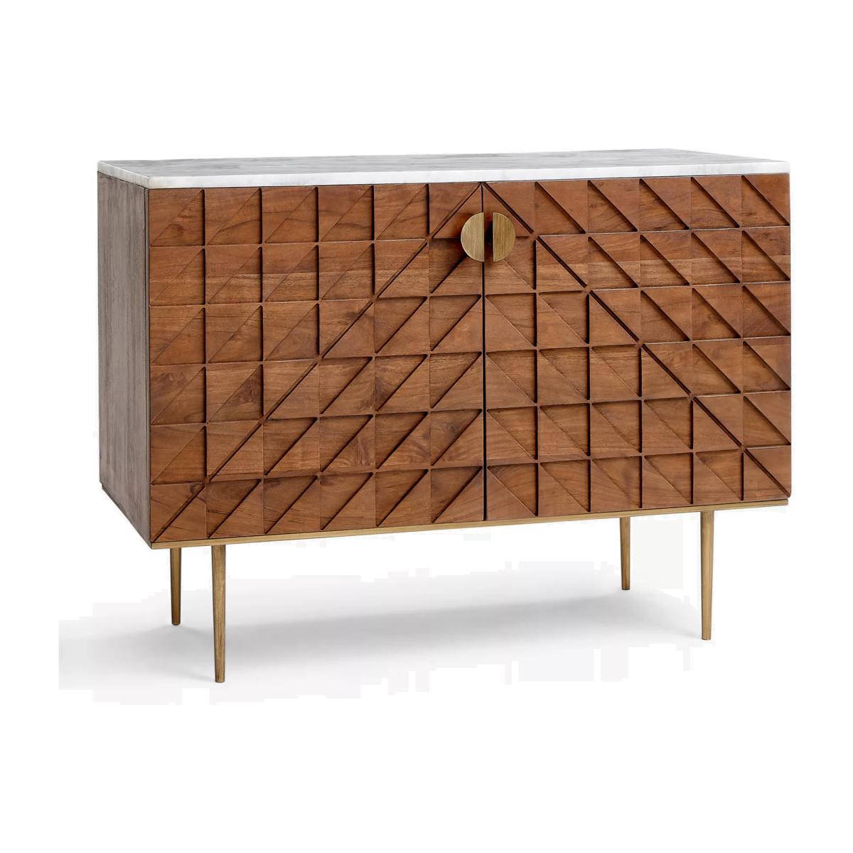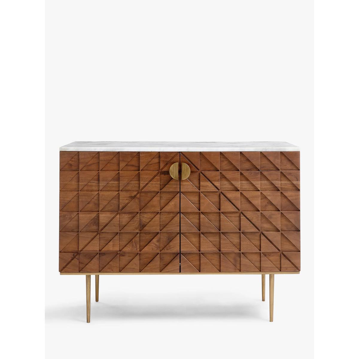 The striking profile of our Trinity sideboard will make an impressive addition to almost any room. Its combination of cool, tactile marble alongside natural wood is highlighted with subtle accents of brass-finished metal. Designed with a geometric-style grooving in each of the hinged doors, inside there's an adjustable wooden shelf, ideal for keeping your home accessories organised. Supported with sleek, minimalist metal legs, this contemporary piece carries mid-century design accents in an eye-catching silhouette that will complement your living space. Want to see it first? You may want to see and get a feel for the furniture in one of our shops before ordering. We'll be able to tell you where the range you'd like to view is on display.