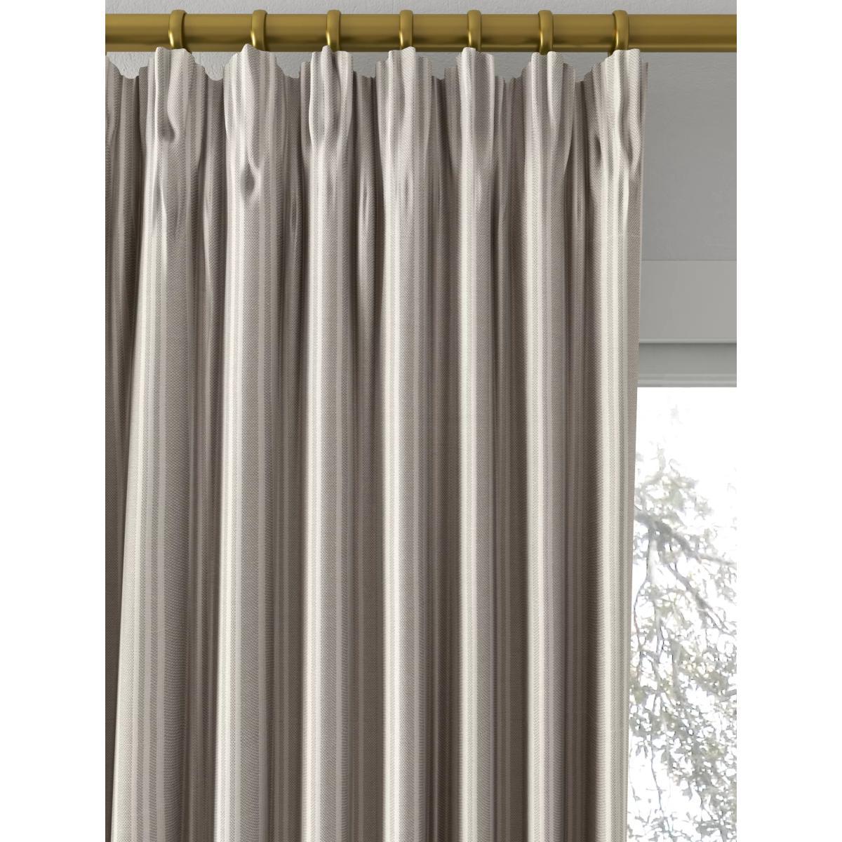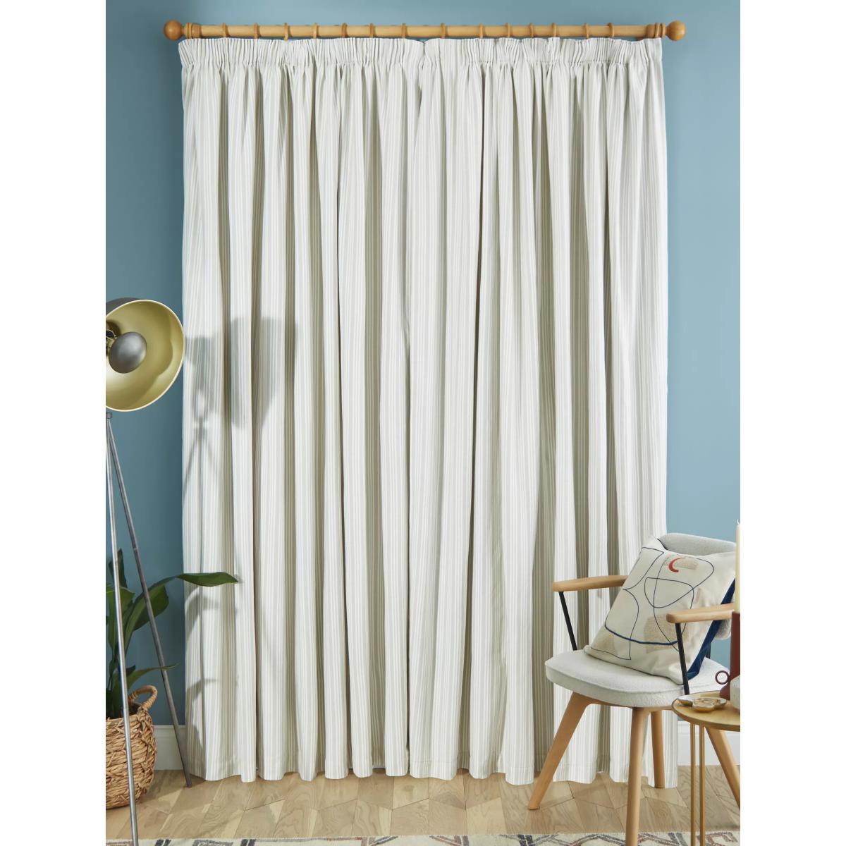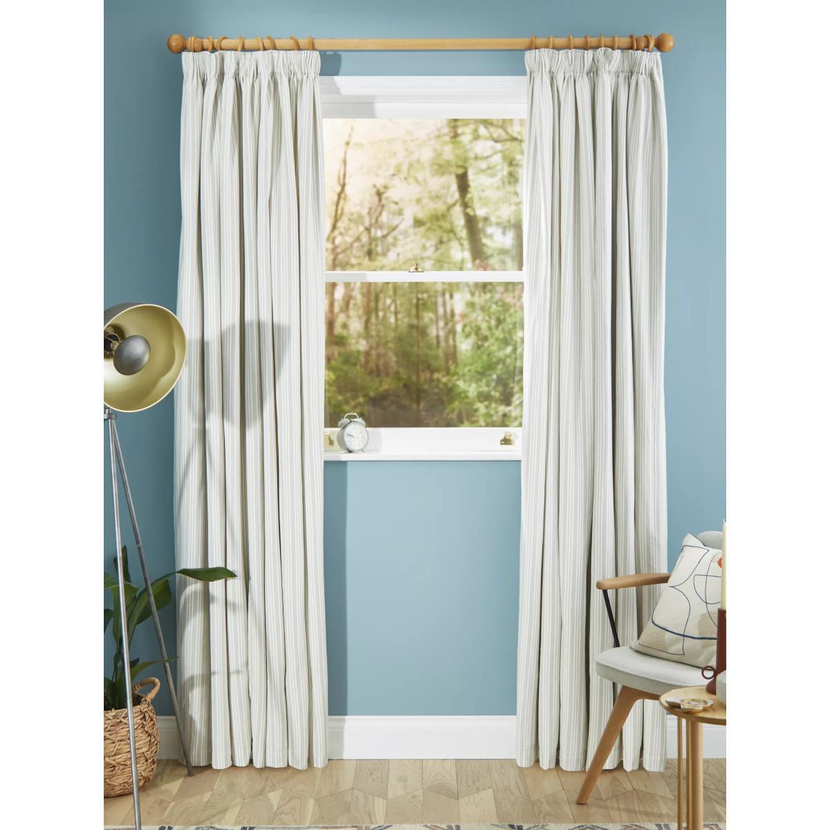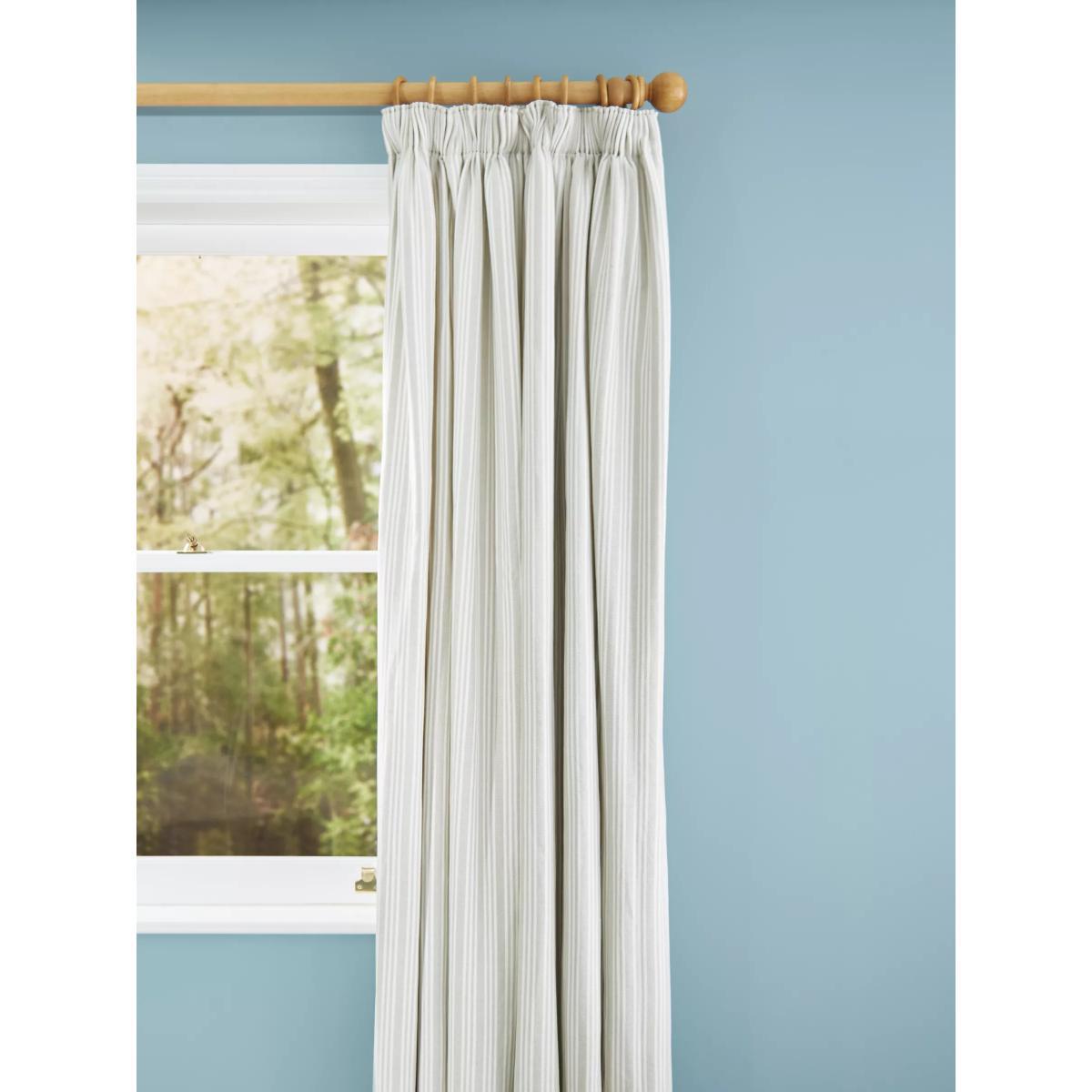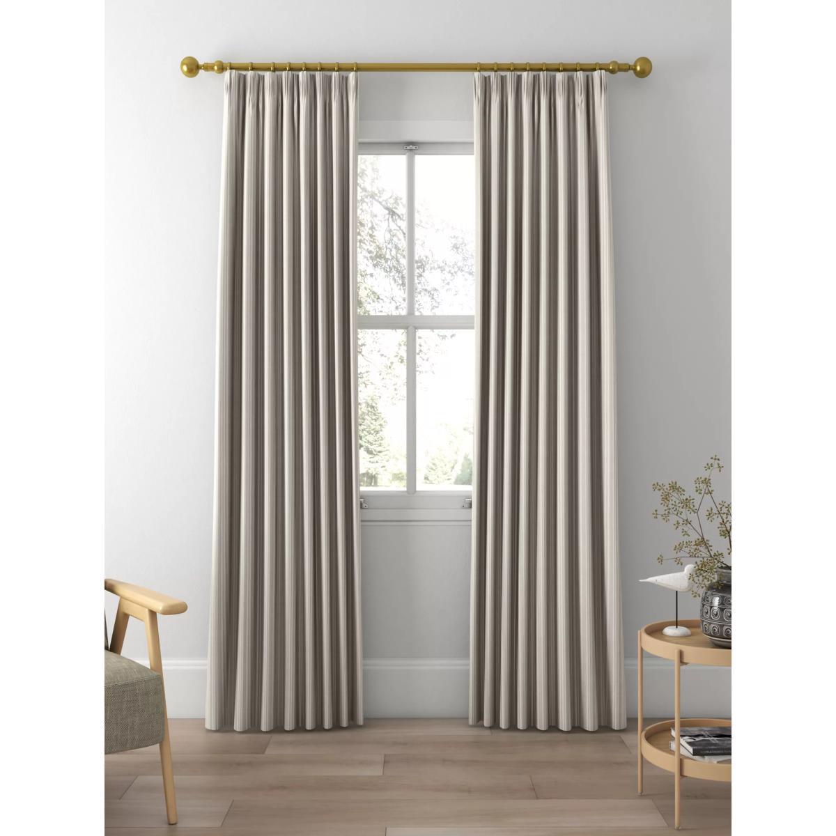 Our Triple Stripe curtains have a subtle, woven vertical stripe design that gives a pared-back and timeless look. The pencil pleat heading creates small, neat folds at the top of the curtain and the soft lining lends a full look. Choosing the right size These curtains can be hung with a pole or track using curtain hooks (not included). There are three hook positions on the heading, allowing you to choose how your curtains sit against the track or pole. For example, if you're using a track you may want to use the middle or lower row of hooks to cover the track, whereas if you're using a pole you may want to use the top row of hooks so the curtains hang below the rings. The specified drop is taken from the top row of hook pockets to the bottom edge of the curtain. The width stated indicates the size of one curtain panel when laid completely flat. This pack contains two panels, and the track/pole length we've recommended allows for the two panels to be gathered when the curtains are drawn. For a fuller look, increase the curtain width. One pair of 167cm width curtains will fit a curtain track/pole size of 133-167cm One pair of 228cm width curtains will fit a curtain track/pole size of 182-228cm Worth knowing... We package our curtains in recycled materials to keep them protected whilst they make their way to you. This means that when they arrive there could be some creases in them. We recommend you hang them for a few days to allow them to flatten and for the creases to fall out. If after this period your curtains still show signs of being folded then follow the ironing instructions on the back of the packaging. Be aware that each style of curtain has different ironing instructions, including heat limitations according to the fabric, so do make sure you follow the guidance provided to get the best results. Do you need a curtain pole and accessories?