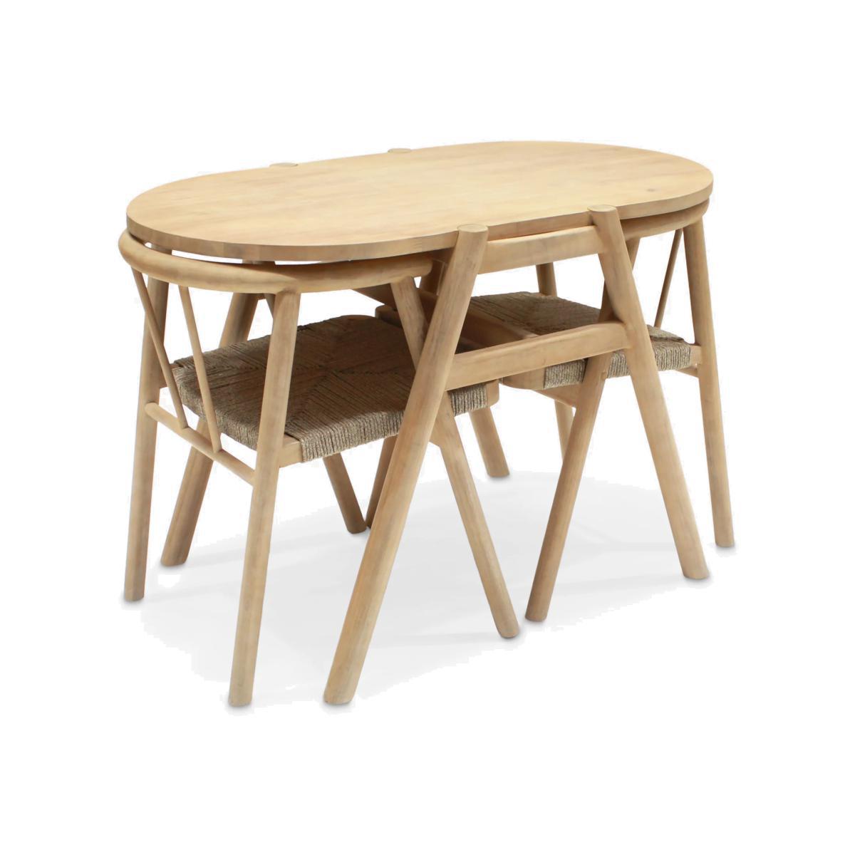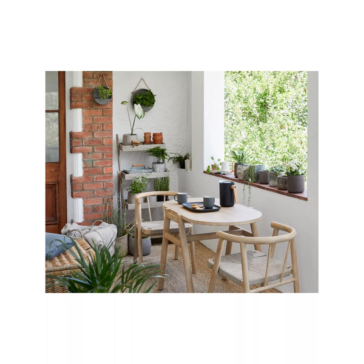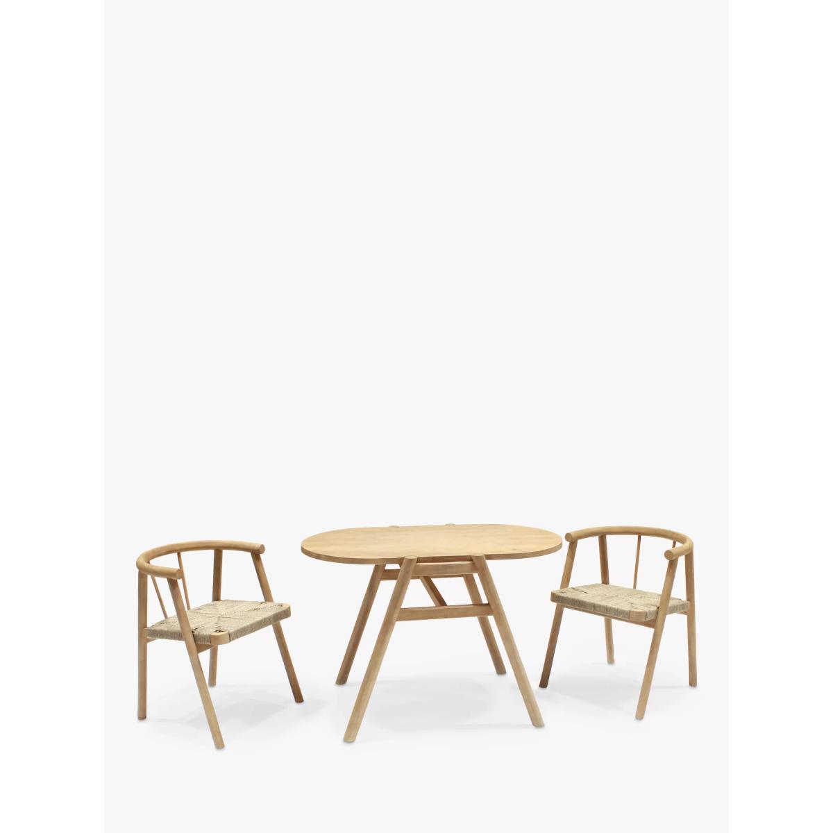 A compact design for indoors or outdoor balconies and smaller patios, our Tuck garden dining set is made so that the two chairs can be completely pushed underneath the table. Easy to maintain, the comfortable seats are made with an attractive rope-like synthetic weave. The oval bistro table and chair frames are made of responsibly sourced FSC-certified acacia wood. Key features: Oval bistro table and two chairs Chairs tuck fully underneath the table FSC-certified acacia wood and synthetic weave Want to see it first? You may want to see and get a feel for the furniture in one of our shops before ordering. We'll be able to tell you where the range you'd like to view is on display. Choose the perfect outdoor furniture We have a selection of wooden furniture for you to choose from which will suit the home or garden. Below are a few options to consider when choosing your perfect outdoor furniture. Teak A premium and popular wood with an attractive appearance which ages beautifully. Strong, durable and resistant to rot and decay, this furniture requires little maintenance Eucalyptus Distinctive scent and appearance which darkens as it ages. Provides similar natural benefits to teak including moisture resistance, hardness and durability. It's plentiful in supply which makes the furniture an inexpensive choice. Acacia Naturally durable, this wood is incredibly hard and is unlikely to suffer damage during everyday use. It provides similar natural benefits to teak, yet unlike many other hardwoods, acacia is also relatively fast growing which minimises the environmental impact.