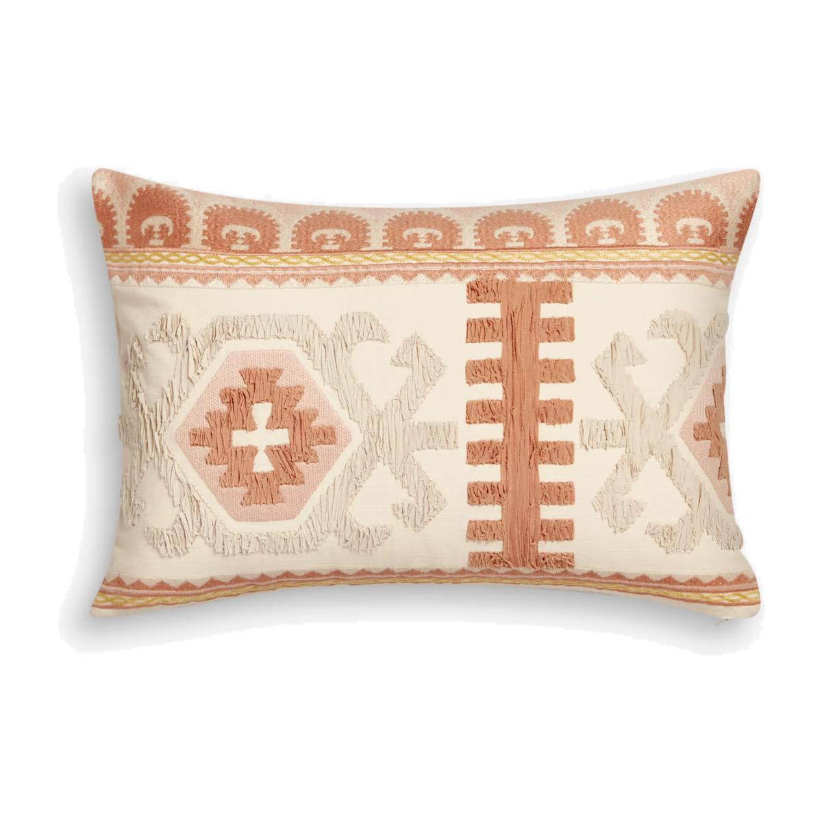 Kelims are flat-woven rugs, traditionally made over a large geographical area from the Balkans to Pakistan. Inspired by the patterns on these beautiful rugs, this applique and embroidery cushion will add exotic charm and colour to your home.