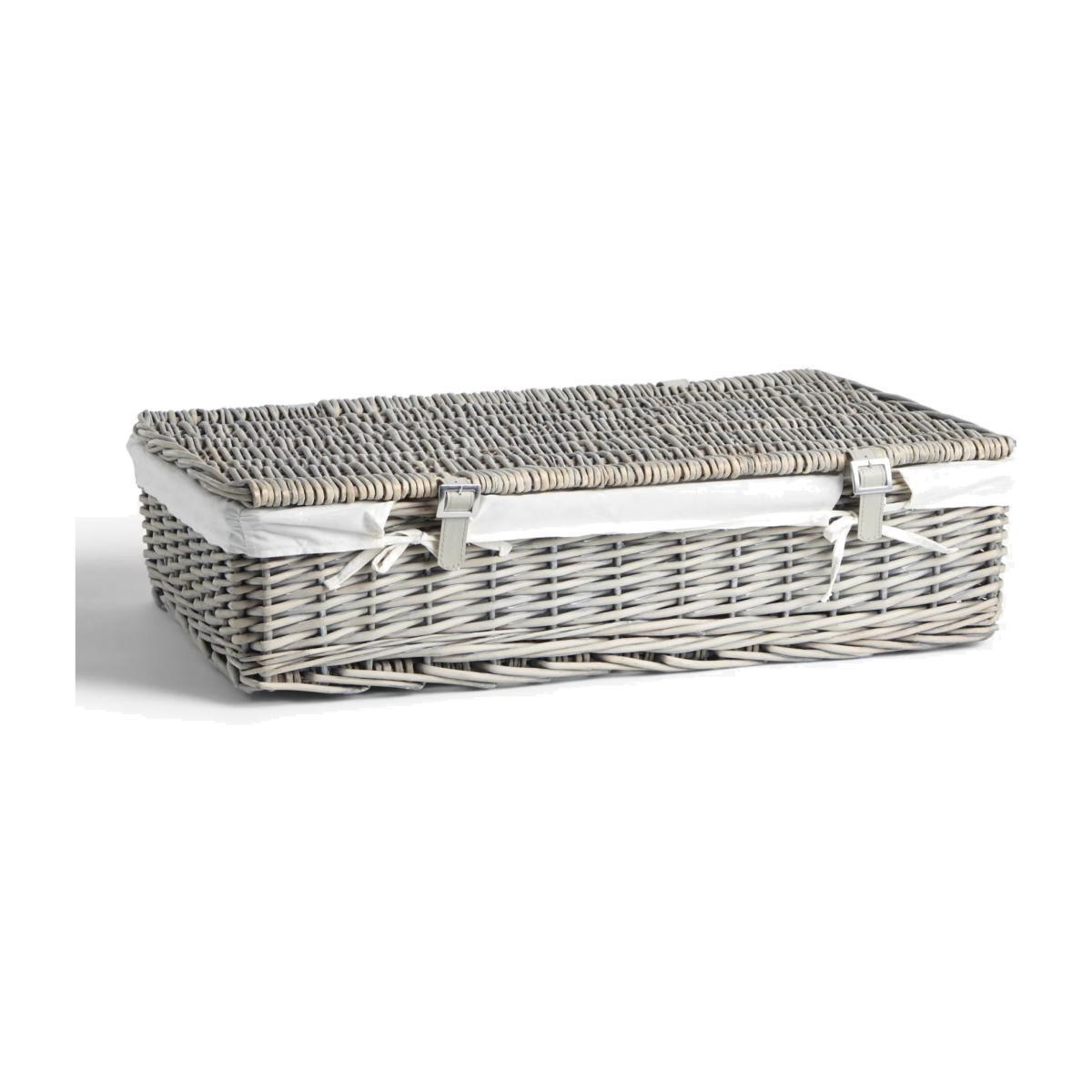 Make use of the space under your bed with this storage basket. Made from grey washed willow, with PU buckle handles and a cotton liner, it's an attractive and naturally-breathable way to store out of season clothing. Willow is rapidly renewable; once cut it can grow back to the same height within a year. Artisans use these raw fibres to handcraft woven baskets.