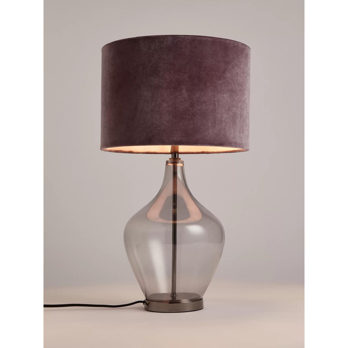 Decorate your space with our Ursula table lamp. Designed with a glass base that's cut into a sleek, organic shape, its semi-transparent style showcases a central metal frame that has a brushed, gunmetal finish. Teamed with a velvet-style fabric lampshade, it offers a warm glow of light that's further enhanced thanks to the metallic lampshade lining. Place in any room for an eye-catching and timeless lighting solution.