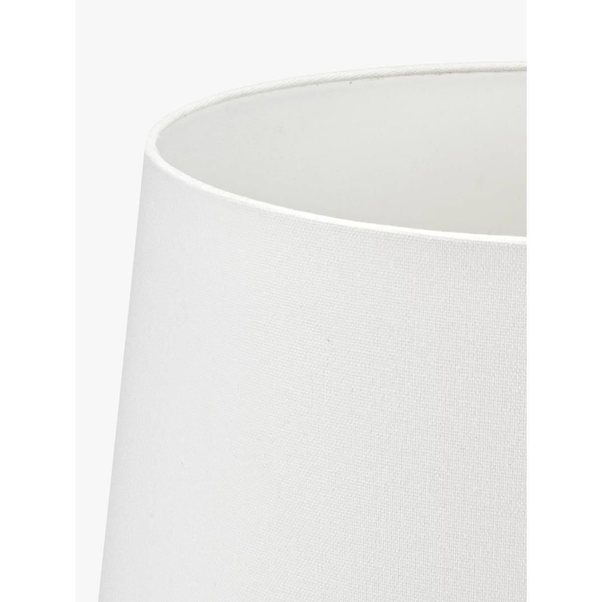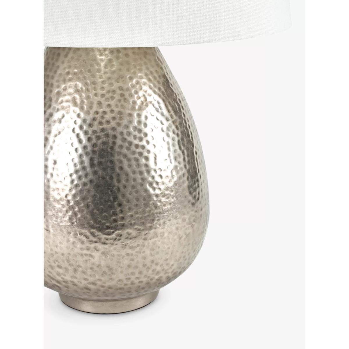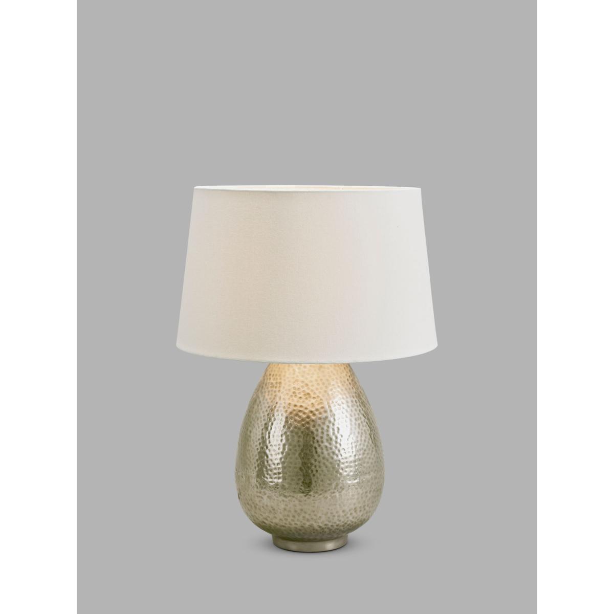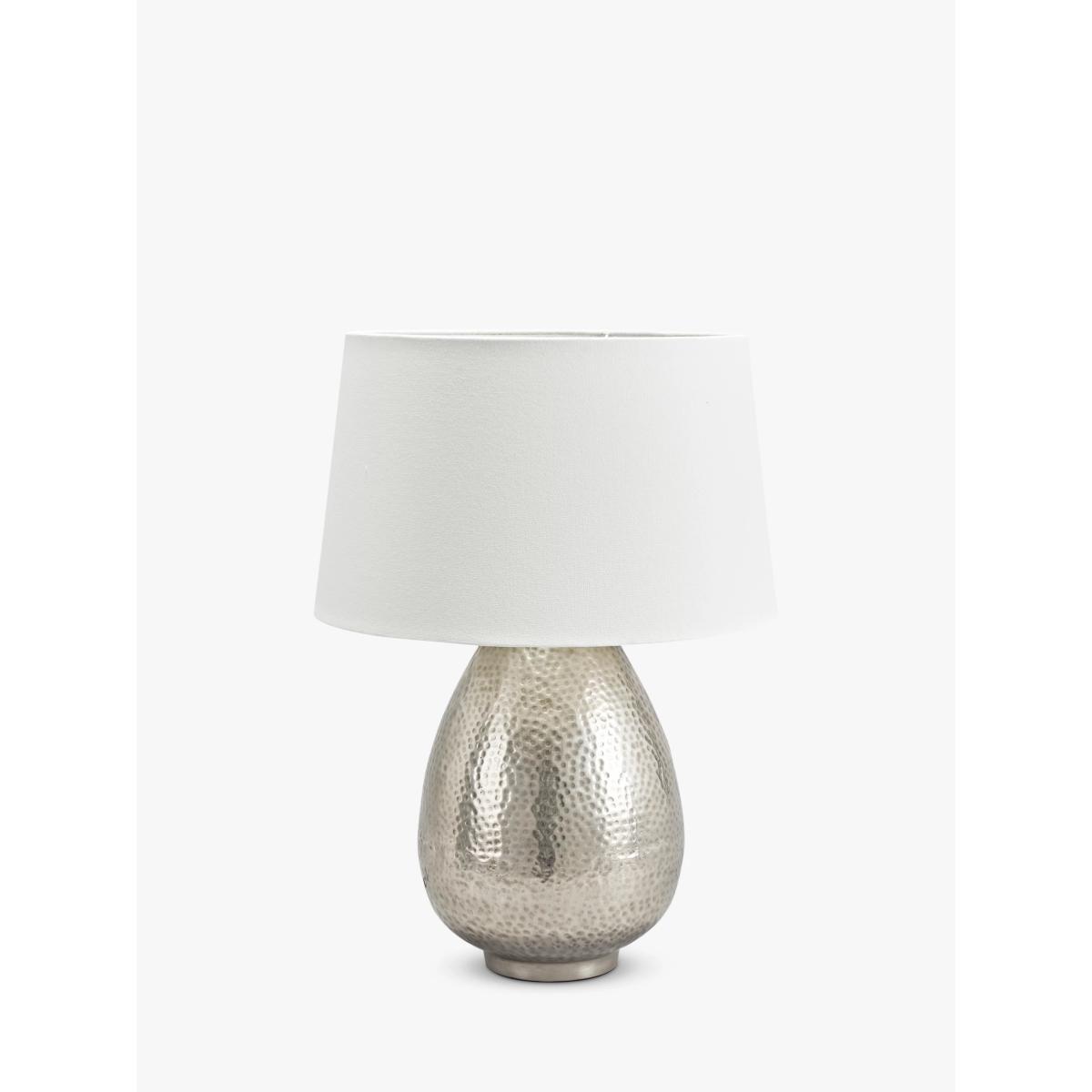 The metal base of this table lamp is finished with a mottled design, which creates an eye-catching metallic texture and becomes further enhanced when a wash of light is thrown down on it. We've teamed it with a slightly tapered lampshade made from crisp cotton in an open weave that enhances a warm glow of light. A brilliant choice for living spaces or hallways.