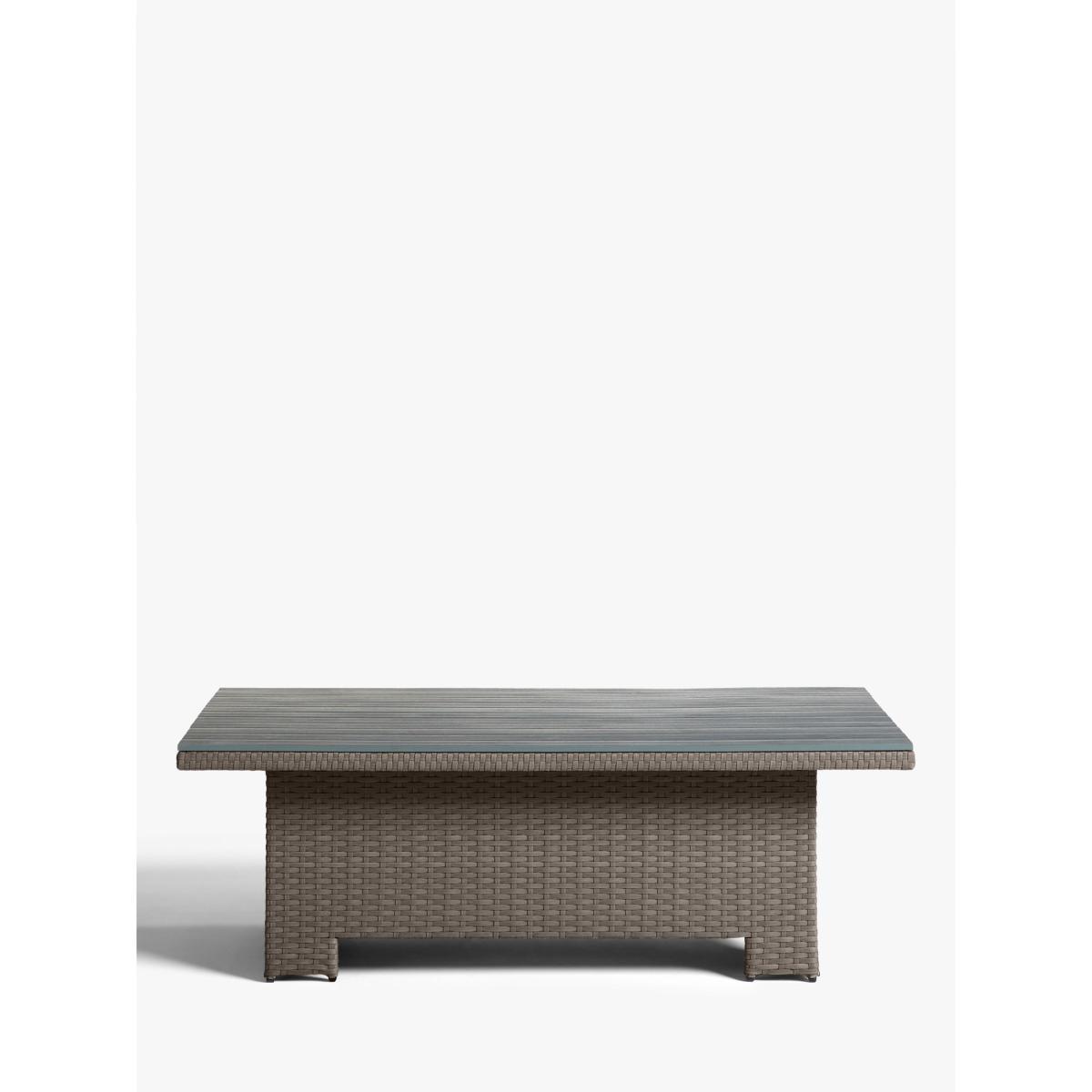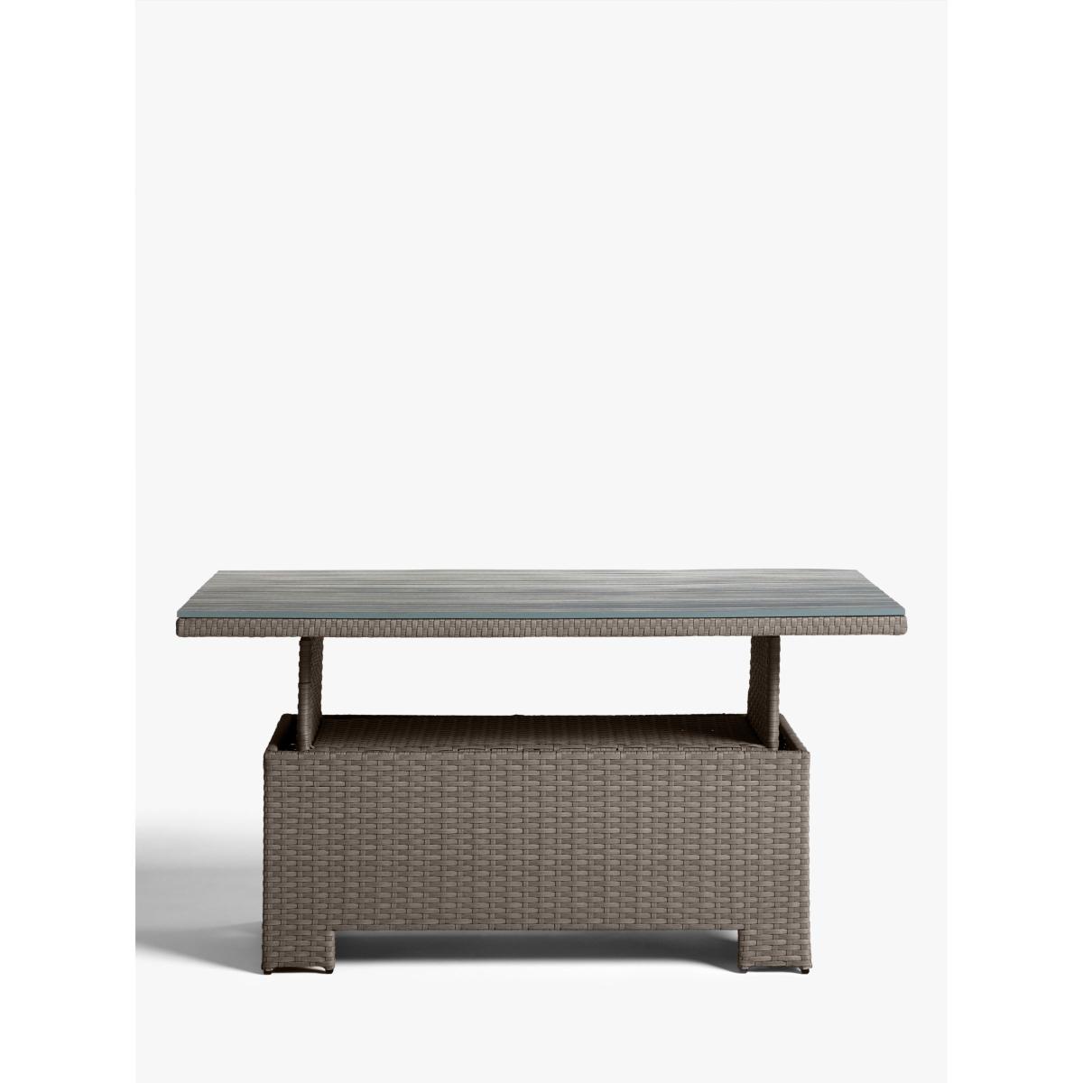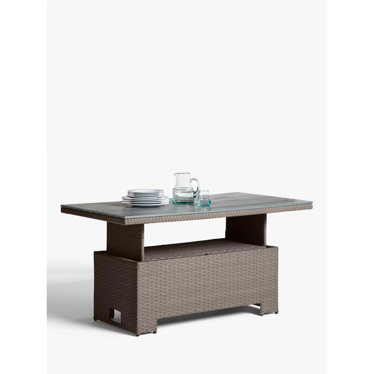 An extendable coffee table from our Valencia range of outdoor furniture, suitable for the garden, patio or conservatory. Easy to adjust, the table height extends to turn the coffee table into a dining table. Made with a robust aluminium frame, it can stay in your garden throughout the year, thanks to the weather-resistant synthetic wicker finish. The table top is made of wood-effect planks, which are weather resistant and easy to wipe clean. Key benefits: Height extends to make a 6 to 8 seater dining table Robust aluminium frame Waterproof synthetic weave Wood-effect table top Suits the Valencia range of outdoor furniture Want to see it first? You may want to see and get a feel for the furniture in one of our shops before ordering. We'll be able to tell you where the range you'd like to view is on display. Choose the perfect outdoor furniture We have a vast selection of furniture for you to choose from which will suit the home or garden. The majority of our furniture ranges have been hand woven using a synthetic wicker; the thinner the weave, the longer it takes for more skilled workers to complete. All weave types are durable so they'll last throughout the seasons. All woven outdoor furniture is UV protected so it will not fade in direct sunlight. All woven outdoor furniture is easy to maintain; simple wipe clean with warm water Flat. A weave of various widths which offers incredible value for money Half round. More detailed with a 3D effect, the half round is a round weave in half which displays a wicker appearance on the top and hollowed underside Double half round. A double strand of half round, this is a wider width of weave which achieves an expensive appearance. Round weave. A very tight, premium weave which is available in various widths Rope A selection of our ranges have been made using rope originally made for the fishing industry. The yarn is made up of 10,000 (approx) woven strands with a double core for extreme strength, does not attract mould even if wet for a long time and is UV resistant.