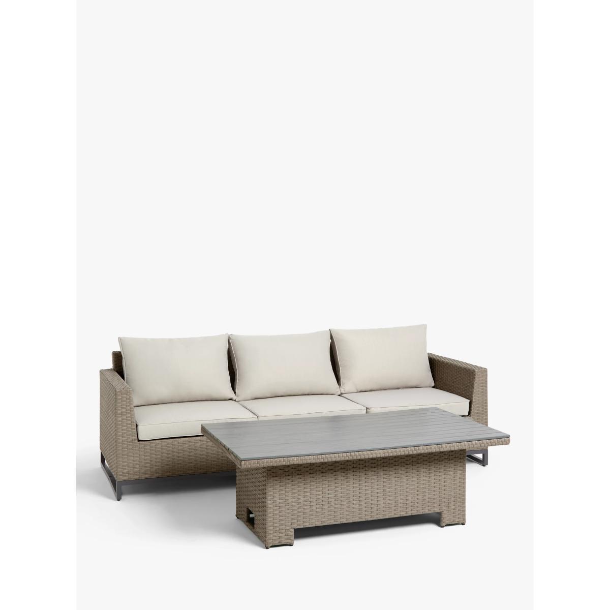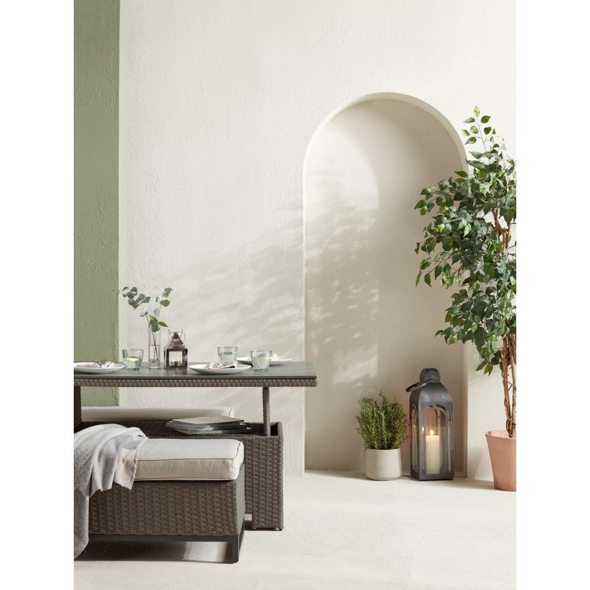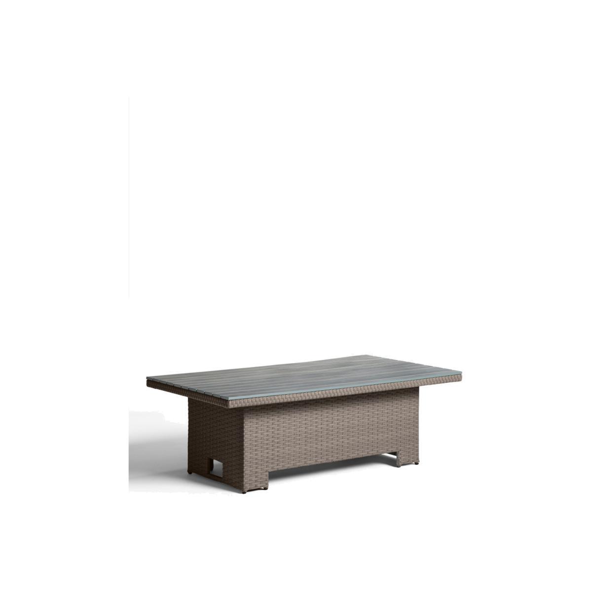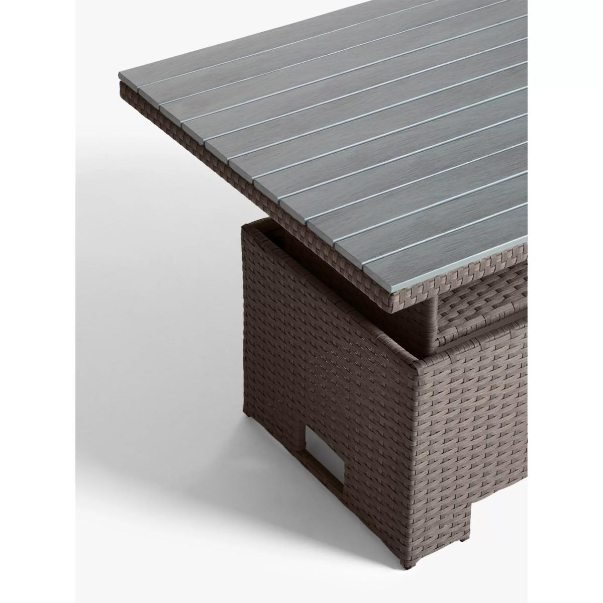 An extendable coffee table from our Valencia range of outdoor furniture, suitable for the garden, patio or conservatory. Easy to adjust, the table height extends to turn the coffee table into a dining table. Made with a robust aluminium frame, it can stay in your garden throughout the year, thanks to the weather-resistant synthetic wicker finish. The table top is made of wood-effect planks, which are weather resistant and easy to wipe clean. Key benefits: Height extends to make a 6 to 8 seater dining table Robust aluminium frame Waterproof synthetic weave Wood-effect table top Suits the Valencia range of outdoor furniture Want to see it first? You may want to see and get a feel for the furniture in one of our shops before ordering. We'll be able to tell you where the range you'd like to view is on display. Choose the perfect outdoor furniture We have a vast selection of furniture for you to choose from which will suit the home or garden. The majority of our furniture ranges have been hand woven using a synthetic wicker; the thinner the weave, the longer it takes for more skilled workers to complete. All weave types are durable so they'll last throughout the seasons. All woven outdoor furniture is UV protected so it will not fade in direct sunlight. All woven outdoor furniture is easy to maintain; simple wipe clean with warm water Flat. A weave of various widths which offers incredible value for money Half round. More detailed with a 3D effect, the half round is a round weave in half which displays a wicker appearance on the top and hollowed underside Double half round. A double strand of half round, this is a wider width of weave which achieves an expensive appearance. Round weave. A very tight, premium weave which is available in various widths Rope A selection of our ranges have been made using rope originally made for the fishing industry. The yarn is made up of 10,000 (approx) woven strands with a double core for extreme strength, does not attract mould even if wet for a long time and is UV resistant.