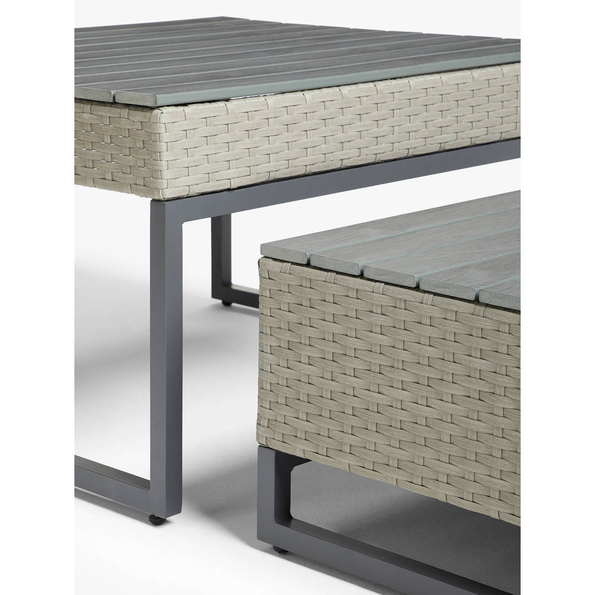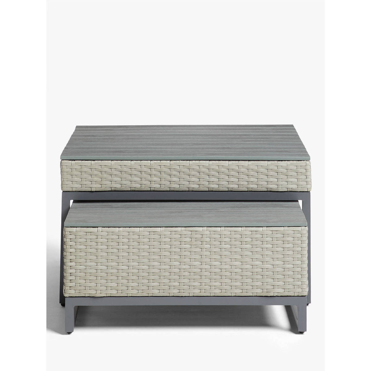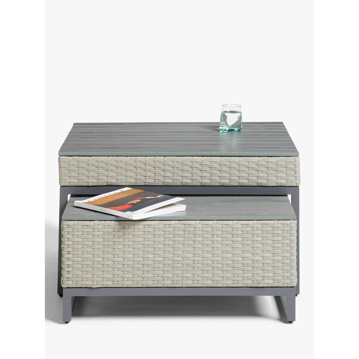 A set of two coffee tables that nest together to save space when storing. From our Valencia range of outdoor furniture, they have a woven rattan-effect design and a contemporary profile. The table tops are made of wood-effect planks, which are weather-resistant and easy to wipe clean.Suitable for the garden or conservatory, the tables are made with lightweight yet robust aluminium frames and can stay in your garden throughout the year, thanks to their weather-resistant synthetic wicker finish. Key benefits:. 2 x nesting tables. Wood-effect table tops. Robust aluminium frames. Water-resistant synthetic flat weave. Coordinates with the Valencia range of garden furniture.