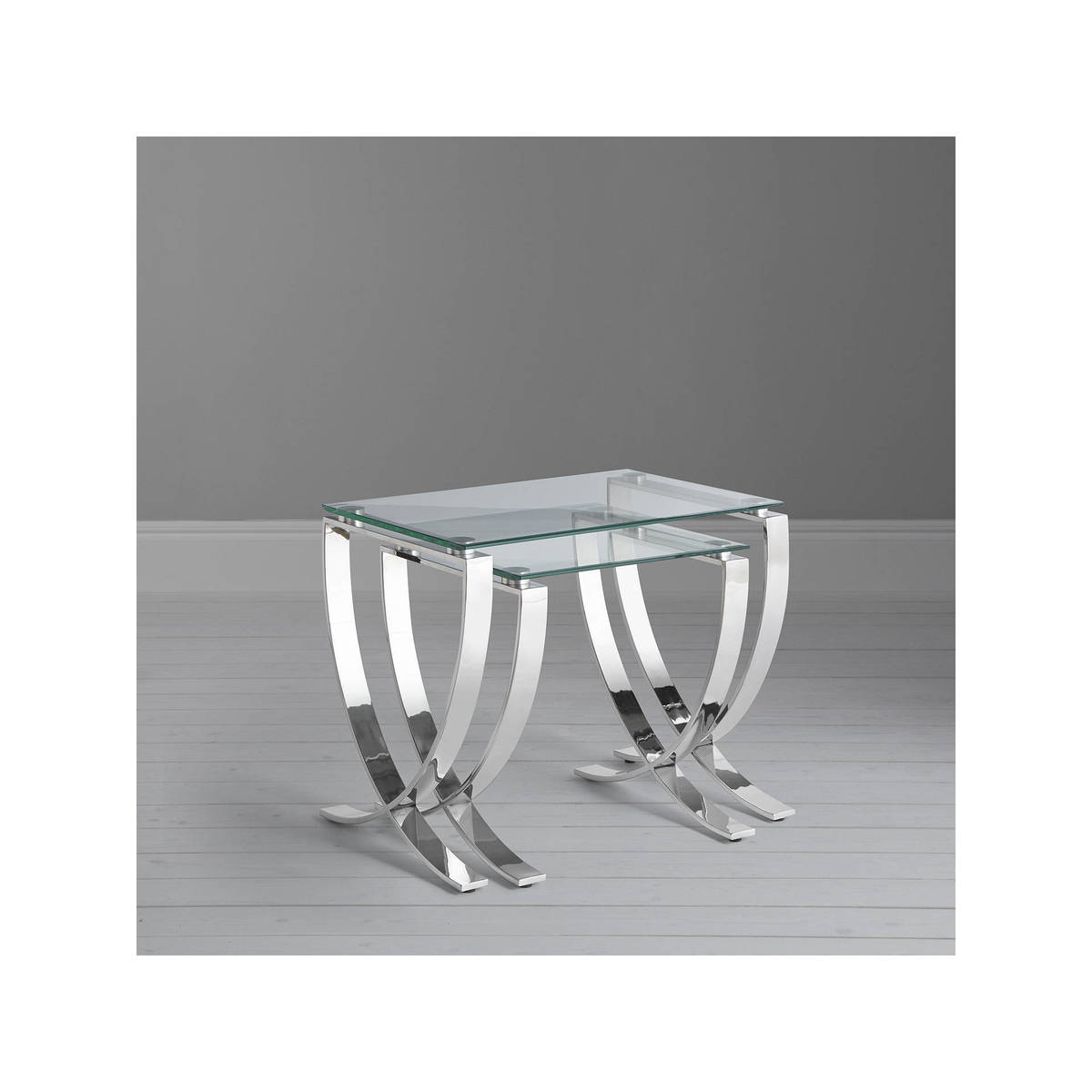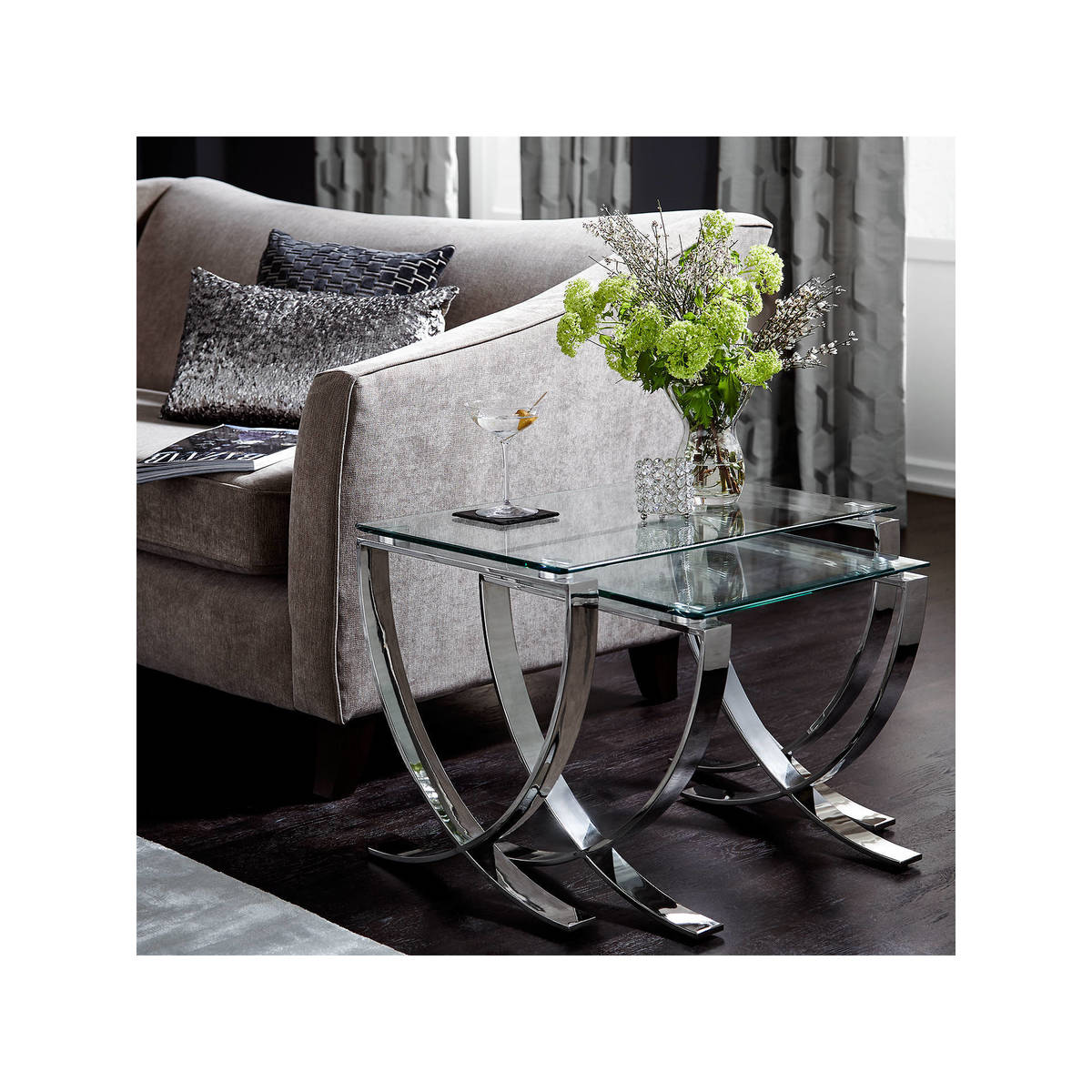 I love this set of nest tables because of their sleek contemporary design and versatile size options, making them a great addition to both modern and eclectic interiors. The glass tops keep the look light and airy, while the curved metal bases add a touch of understated elegance. They work particularly well in minimalist or glam schemes, but can also serve as a statement piece in more eclectic or industrial settings. Practical styling tips include using the smaller table for drinks or occasional accessories, and stacking or spreading them out to add visual interest or accommodate different seating arrangements. They're perfect for small spaces or for adding extra surface area without cluttering the room.