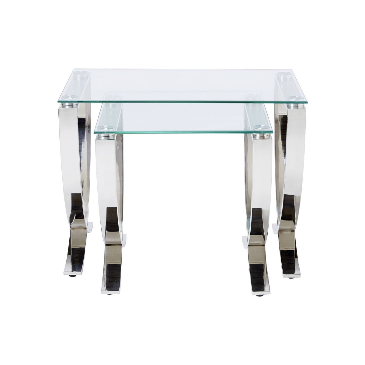 Did someone say sophisticated? Because these tables fit the brief. Each table has a lustrous glass top and polished stainless steel legs and the smaller table nests neatly underneath the larger table when it's not needed. Great if space is limited and seriously helpful when you're entertaining and need an extra spot of space for nuts and nibbles. Want to see it first? You may want to see and get a feel for the furniture in one of our shops before ordering. We'll be able to tell you where the range you'd like to view is on display.