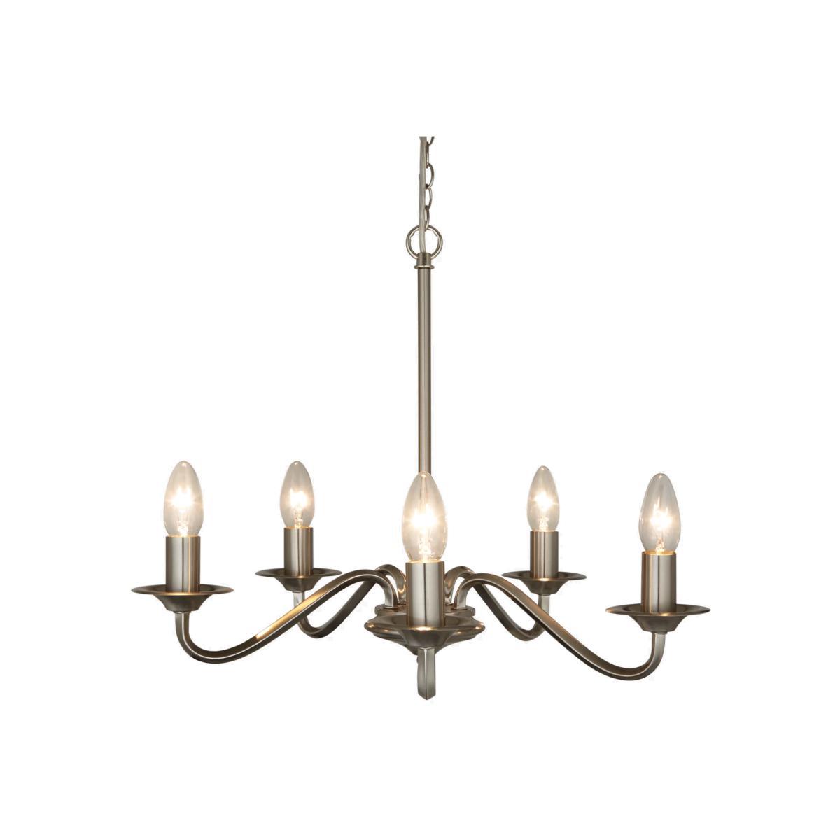 This 5 armed chandelier ceiling lighthas a retro look that makes it ideal for those seeking to evoke a chic lighting look. The body and arms of the light are finished in a smooth, sleek finish, which when coupled with the 5 SES Eco Halogen candle bulbs simply adds to the lamp's elegant antique feel. This light also comes with a 2-year guarantee.