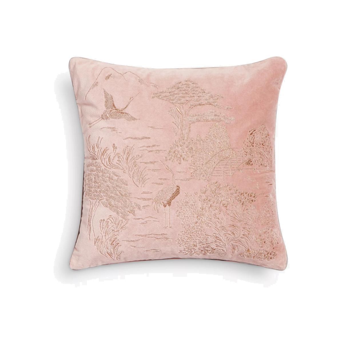 "Willow garden" features a delicate, metallic thread Chinoiserie design machine embroidered onto a luxurious cotton velvet base.