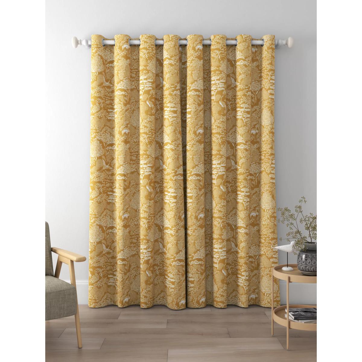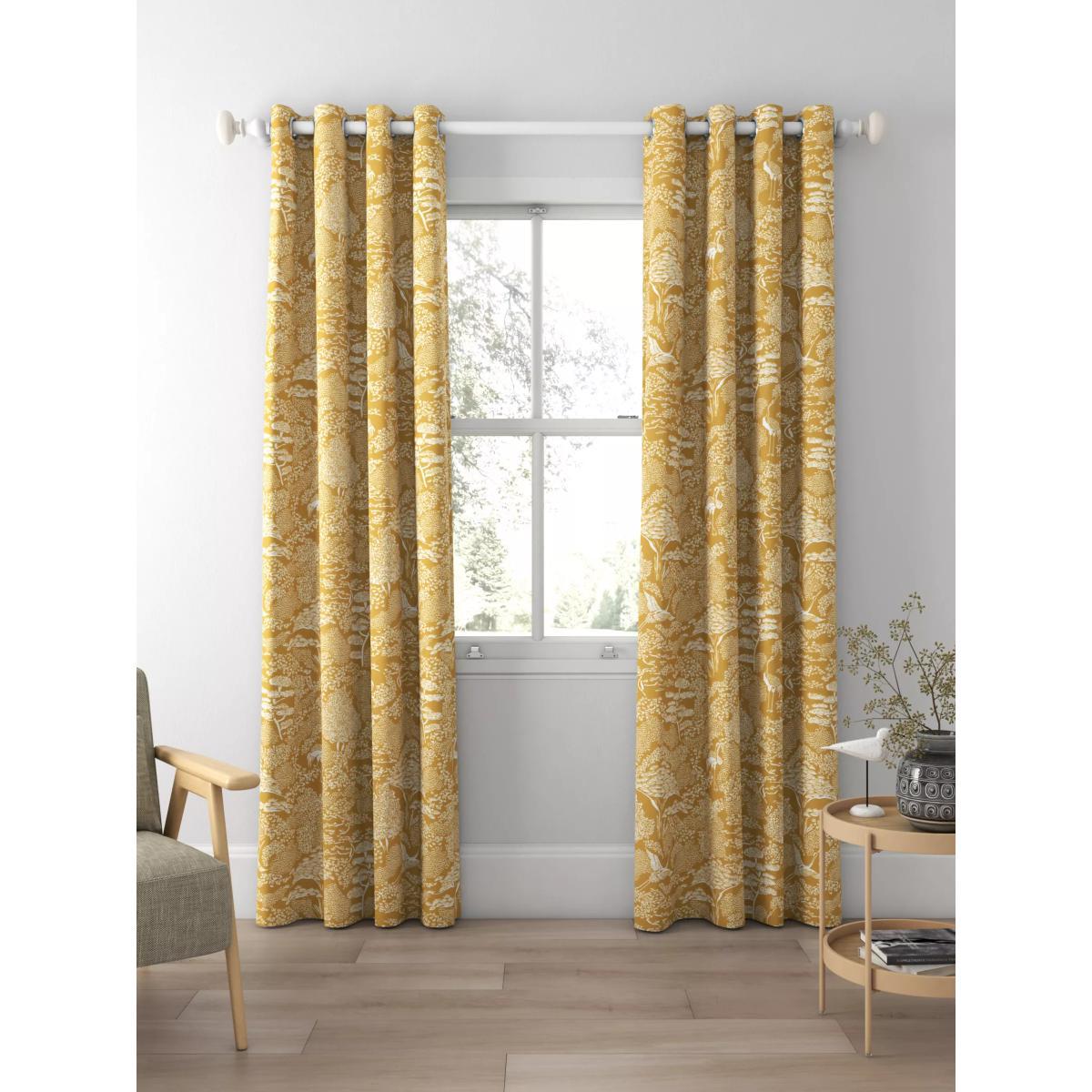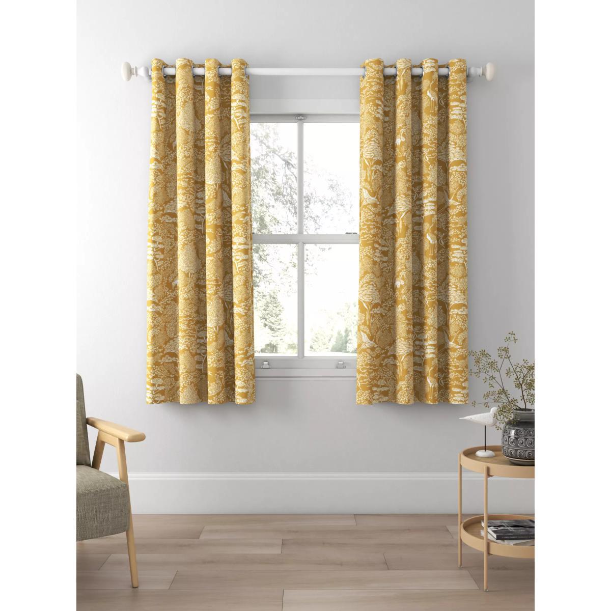 The design of our Willow Landscape curtains is inspired by the scenery of Japan and features willow trees and cranes. The eyelet heading gives them a more contemporary look with large, even folds and the lining adds the perfect finish, improving the drape and enhancing the vibrancy of the pattern. The width stated indicates the size of one curtain panel when laid completely flat. This pack contains two panels and the track/pole length we've recommended allows for the two panels to be gathered when the curtains are drawn. For a fuller look, increase the curtain width. One pair of 167cm width curtains will fit a curtain track/pole size 133-167cm One pair of 228cm width curtains will fit a curtain track/pole size 182-228cm Worth knowing... We package our curtains in recycled materials to keep them protected whilst they make their way to you. This means that when they arrive there could be some creases in them. We recommend you hang them for a few days to allow them to flatten and for the creases to fall out. If after this period your curtains still show signs of being folded then follow the ironing instructions on the back of the packaging. Be aware that each style of curtain has different ironing instructions, including heat limitations according to the fabric, so do make sure you follow the guidance provided to get the best results. Do you need a curtain pole and accessories? Shop them here.