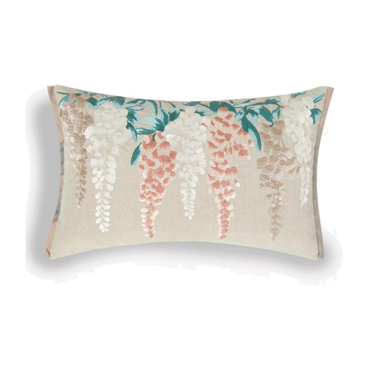 Light and summery in its look, this rectangular cushion is machine embroidered with beautiful wisteria blooms on a linen base.
