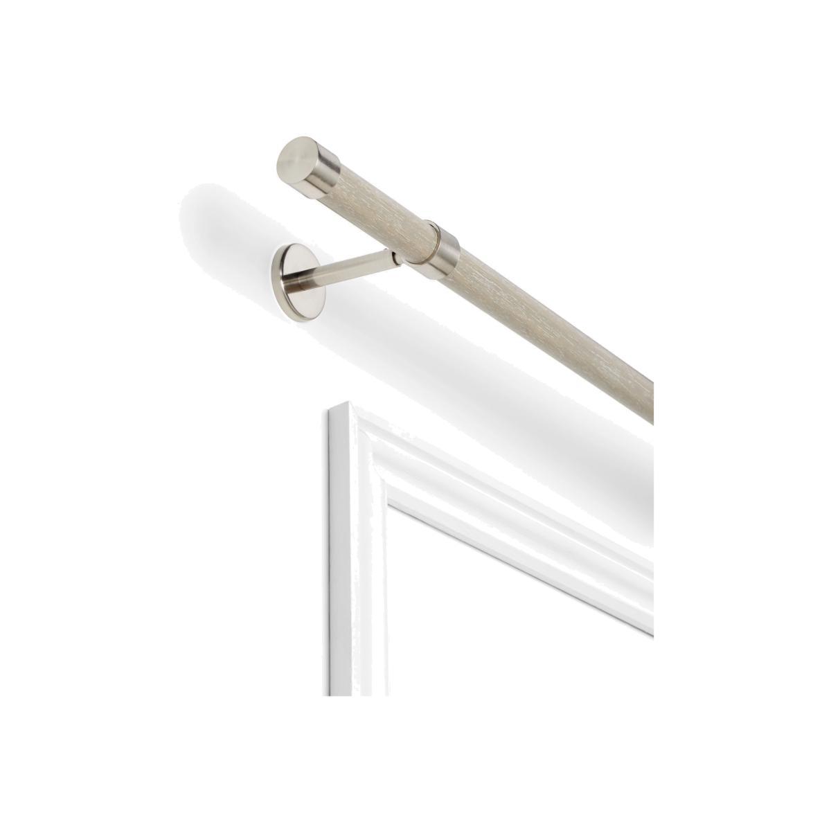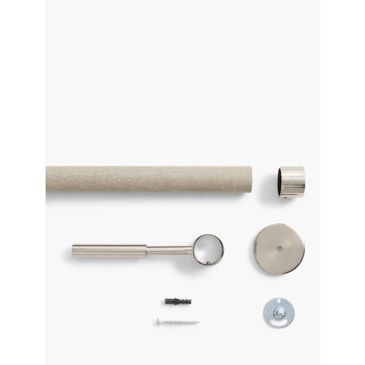 A wooden curtain pole kit with contrasting metal fittings. The walnut pole has brass effect fittings whilst the lighter washed wood pole has brushed chrome effect fittings. This kit contains all the accessories and fittings you'll need to fit your pole, so all that's left is to choose your curtains. Comprehensive instructions offer a step-by-step guide, whether you're using the pole as it comes or cutting it to size. Pack includes: L150cm L300cm Curtain pole 1 2 plus a connector Base plates 2 3 Bracket-stems 2 3 Bracket-arms 2 3 Finials 2 2 Other Screws Wall plugs Screws Wall plugs Double-ended joining screw As this pole is designed for use with eyelet curtains the kit doesn't contain curtain rings. If you'd like to use pencil pleat curtains you'll need to purchase rings and hooks separately.