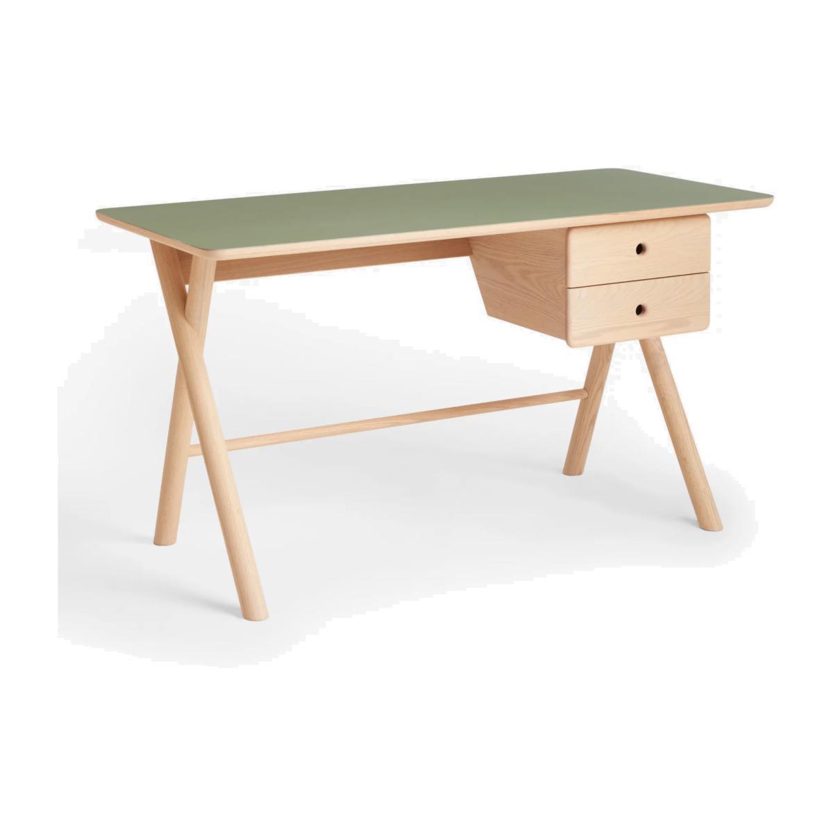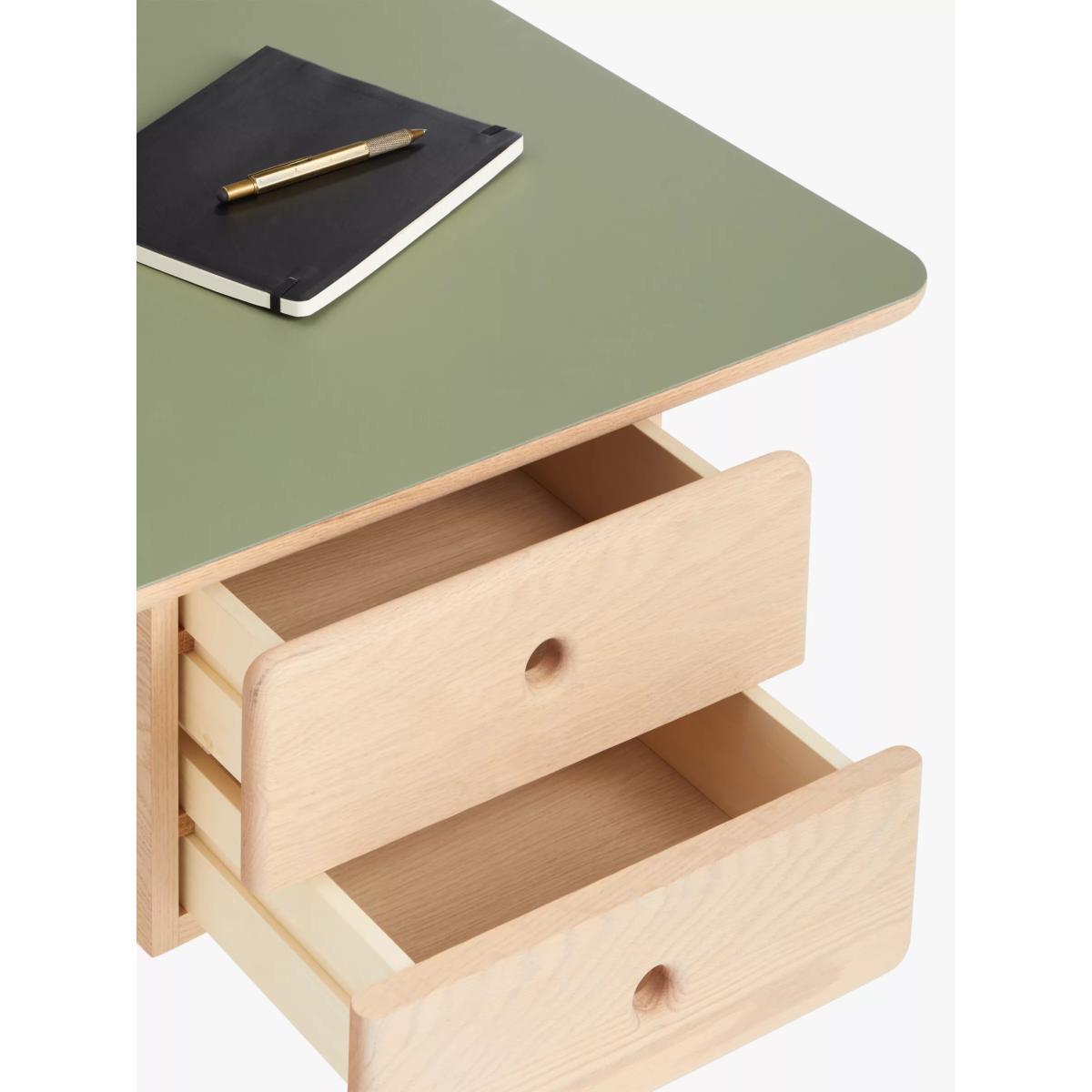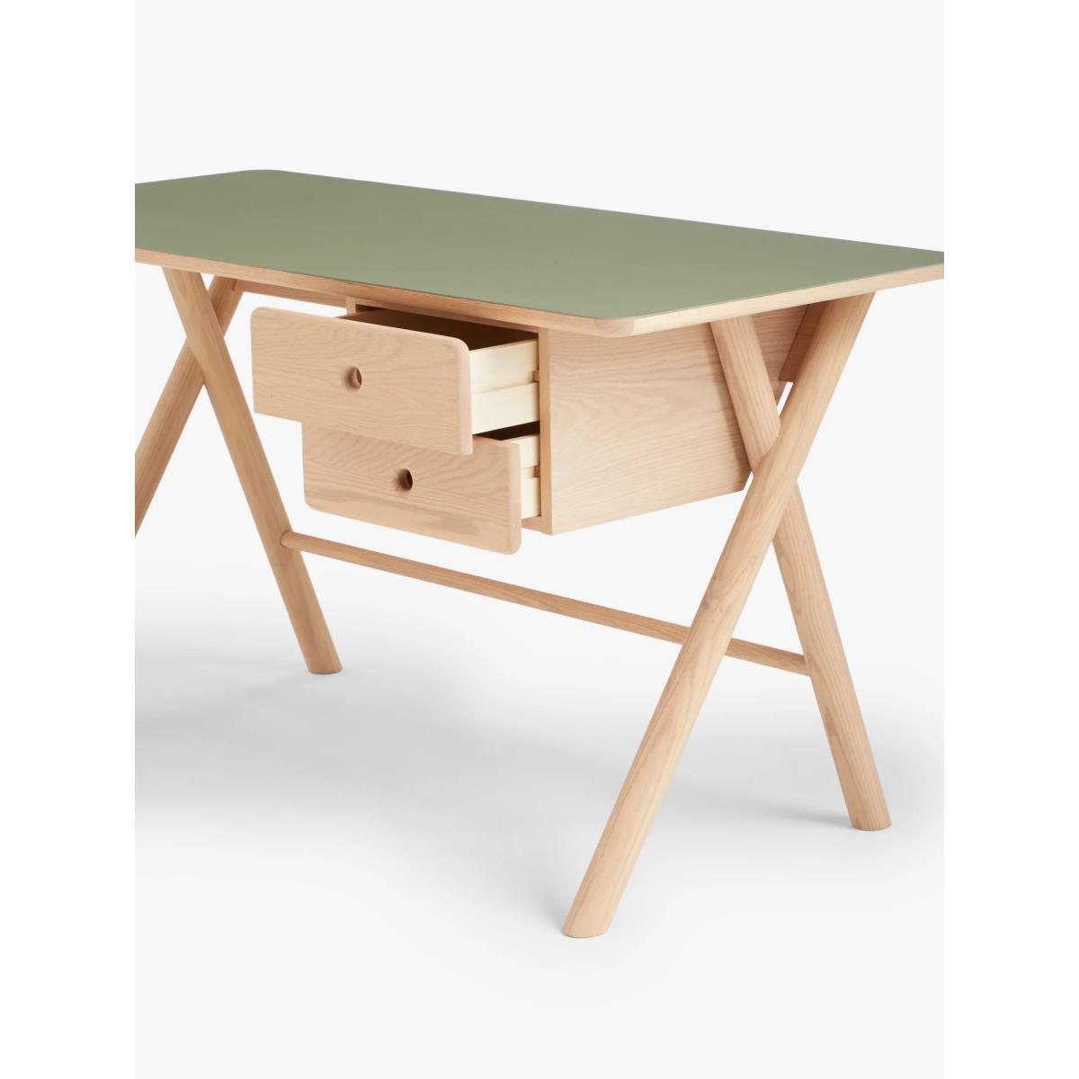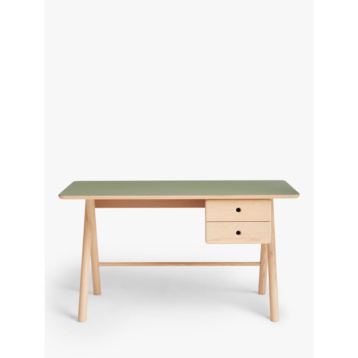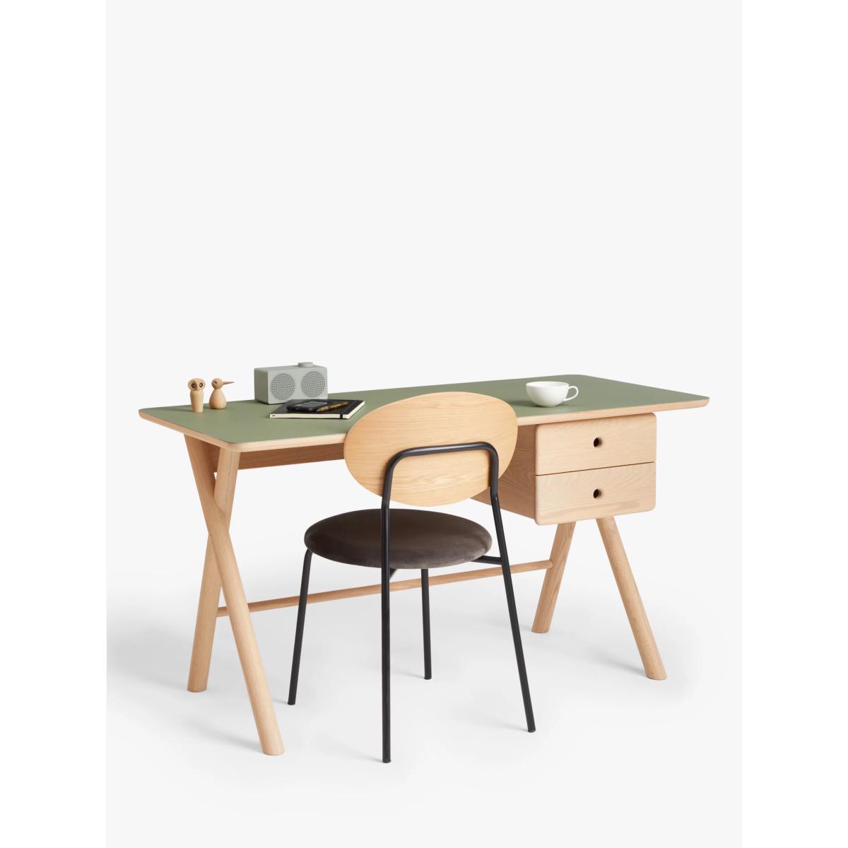 Created with Scandinavian-minimalism in mind, we've designed this office desk to give your work-from-home days a design edge. Functional workstation Solid oak and particle board with oak veneers form the sleek frame of this desk. Its curved, X-frame sides and smooth rounded edges give the desk a visual lightness, making it an easy-fit in your contemporary home. Two drawers provide practical storage space for documents and stationery. Smooth surface top The surface top is made from linoleum, an innovative and award-winning, furniture-grade material that's renowned for its durability and high-quality finish. Made from raw, natural materials, it's distinctly tactile: the surface top looks matt but feels warm and we've given it a rich colour-contrast to complement the wooden frame. It also actively resists the build-up of static charges, so you don't have to worry about fingerprints and dust or dirt sticking to the surface. Want to see it first? You may want to see and get a feel for the furniture in one of our shops before ordering. We'll be able to tell you where the range you'd like to view is on display.