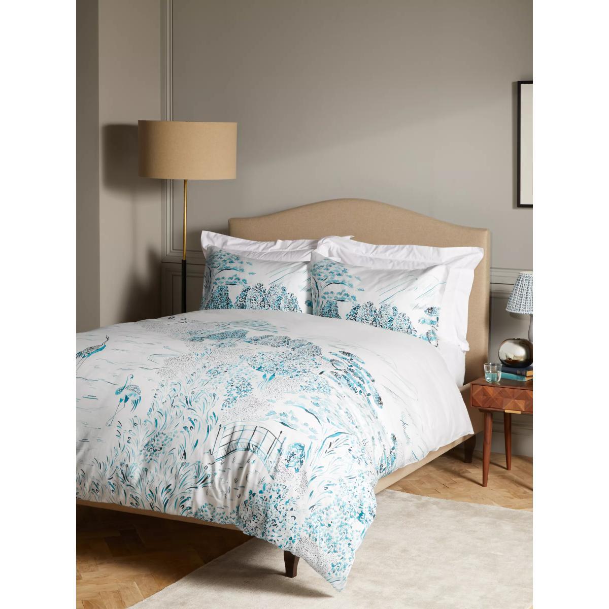 This duvet cover set features a printed, Japanese garden design and a plain reverse. The painterly strokes and restful shades of blue are perfect for a bedroom. Made from soft and smooth 200 thread count cotton sateen, the all-natural fibre will help keep you cool and comfortable for a great night's sleep. The single set comes with one standard pillowcase, while the double, king and super king sets come with two standard pillowcases. Have you thought about sheeting? Shop. Bedding sizes To fit duvet/pillow size (cm) Standard pillowcase, L75 x W50cm Single duvet cover, L200 x W135cm Double duvet cover, L200 x W200cm King duvet cover, L220 x W225cm Super king duvet cover, L220 x W260cm